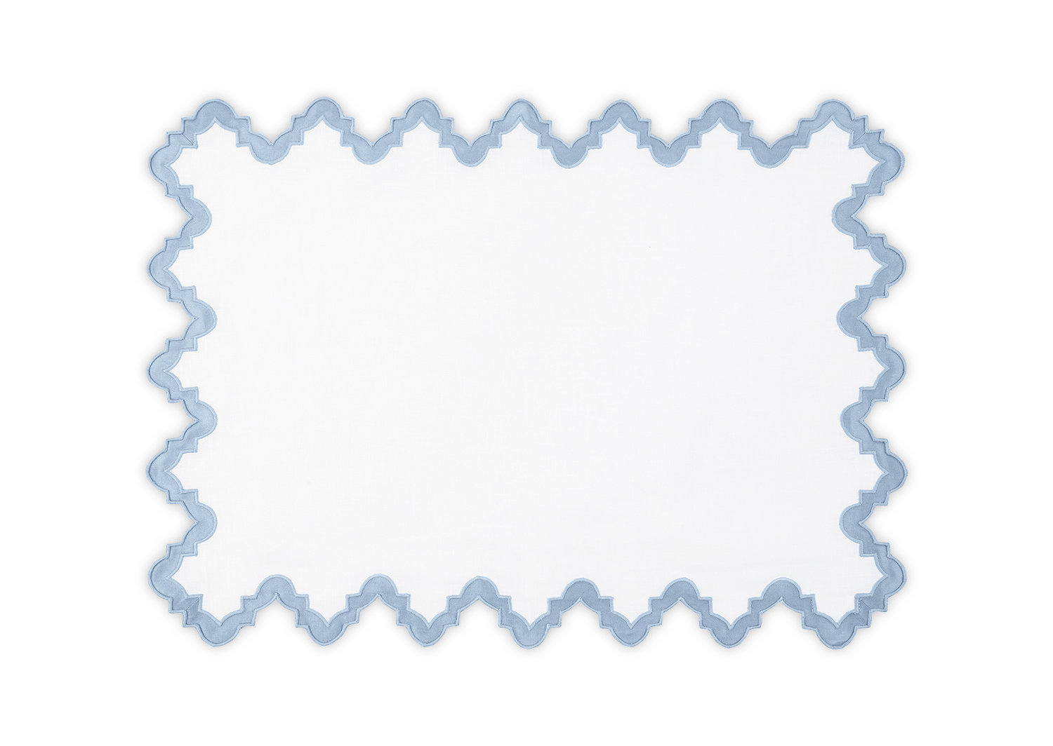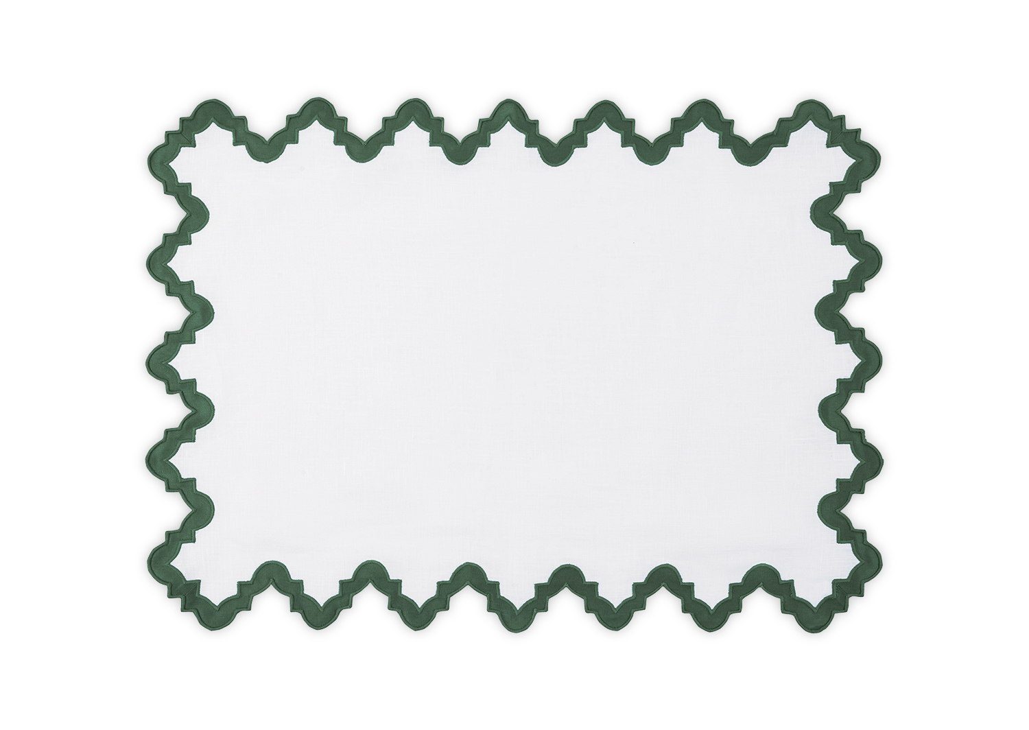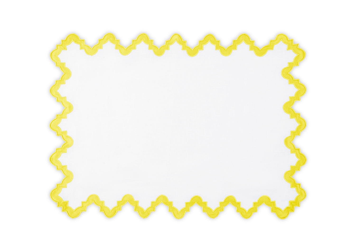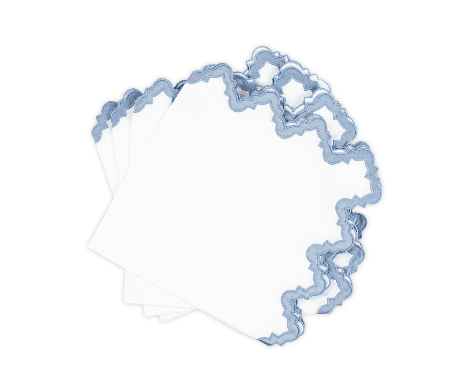 - 100% white linen napkins, placemats, tablecloths, and runners finished with a colored sateen accent border inspired by elegant geometry of Moroccan tiles to enliven and brighten the table
