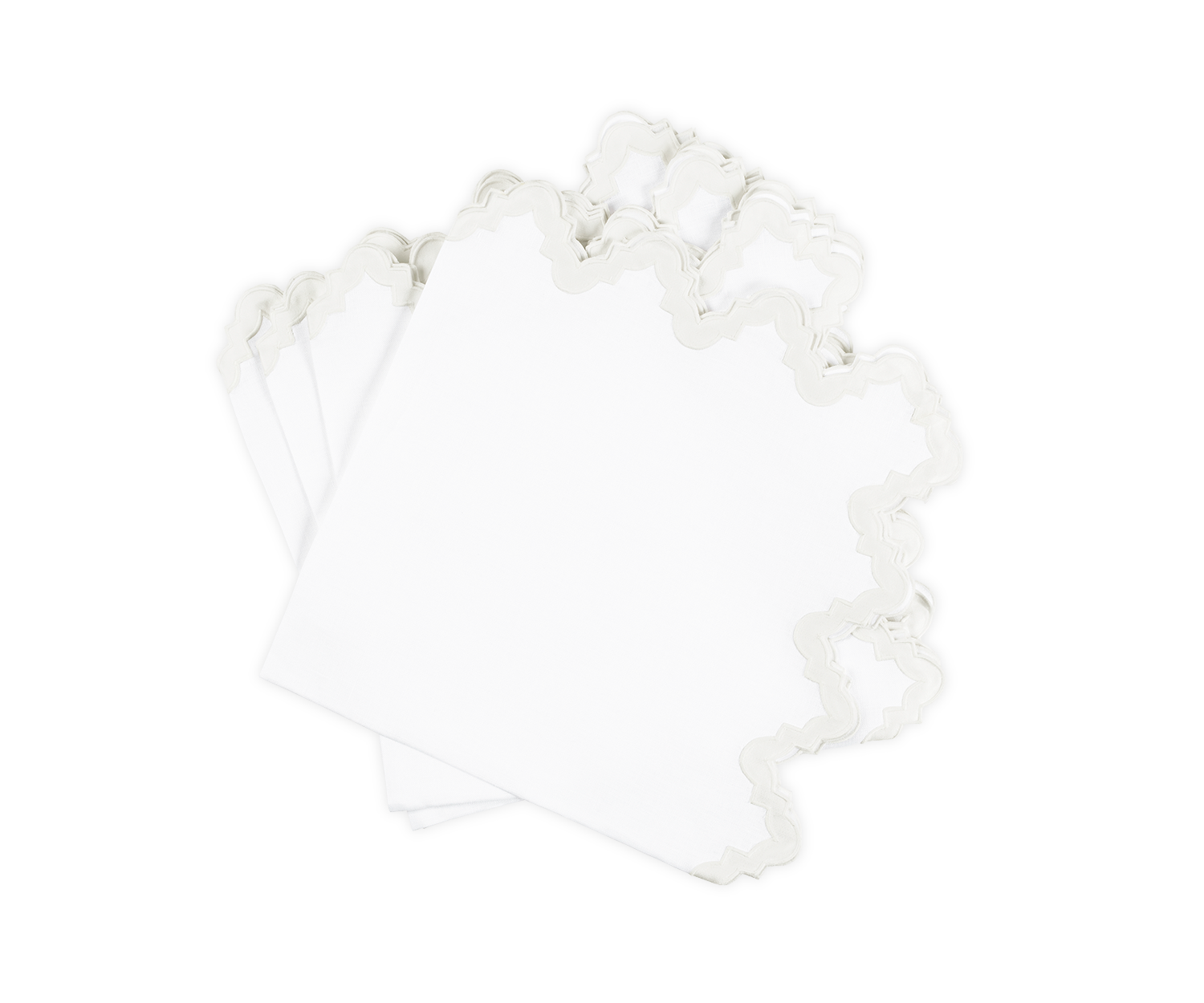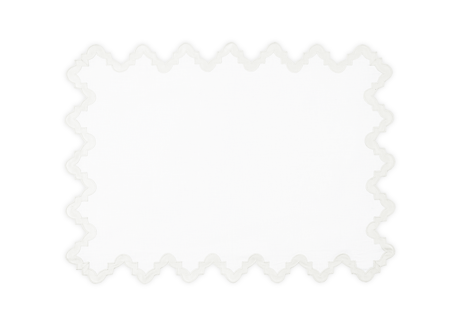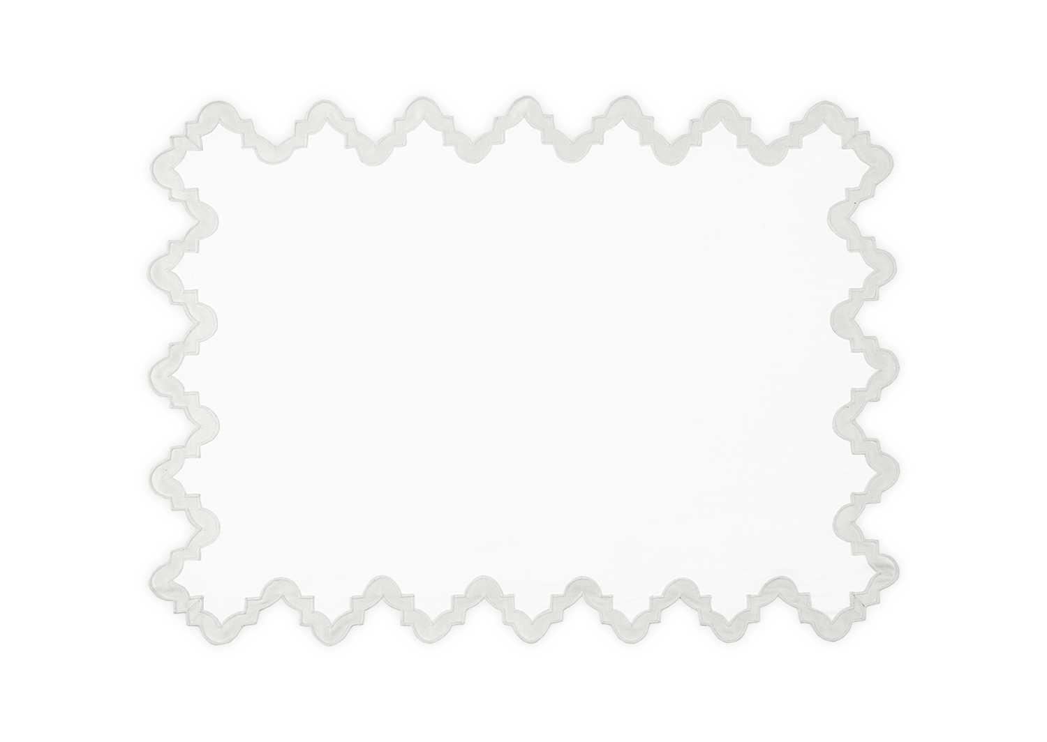 - 100% white linen napkins, placemats, tablecloths, and runners finished with a colored sateen accent border inspired by elegant geometry of Moroccan tiles to enliven and brighten the table