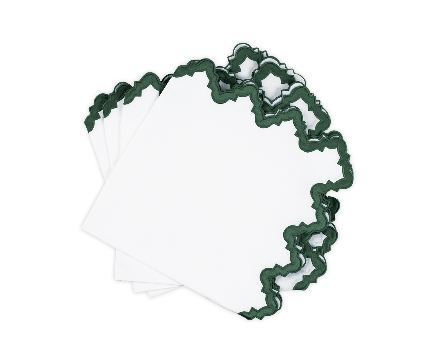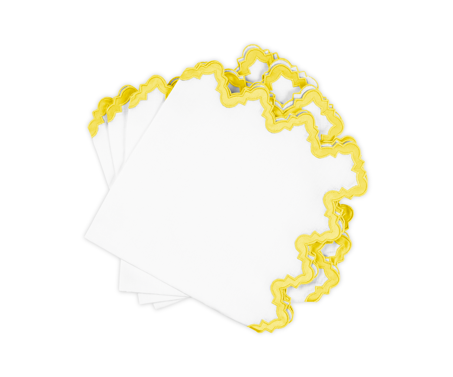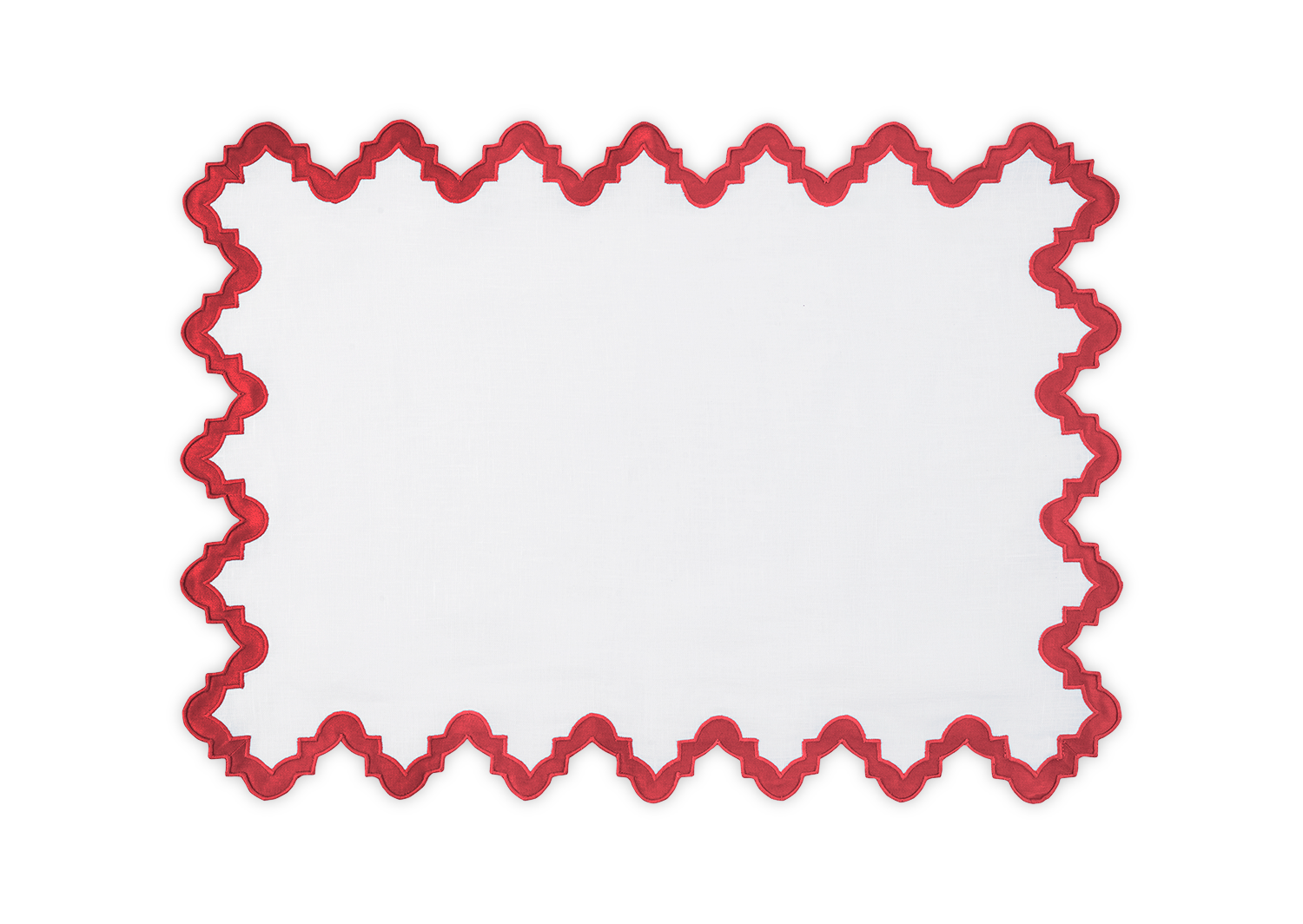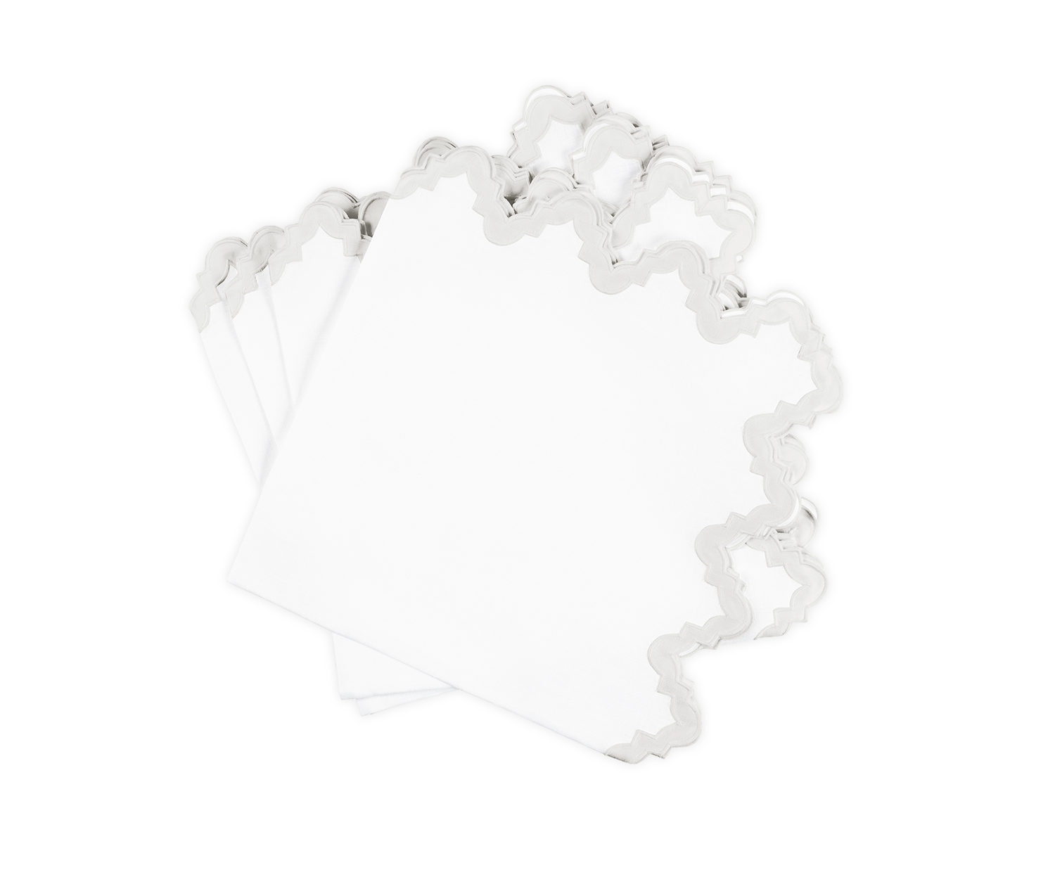 - 100% white linen napkins, placemats, tablecloths, and runners finished with a colored sateen accent border inspired by elegant geometry of Moroccan tiles to enliven and brighten the table