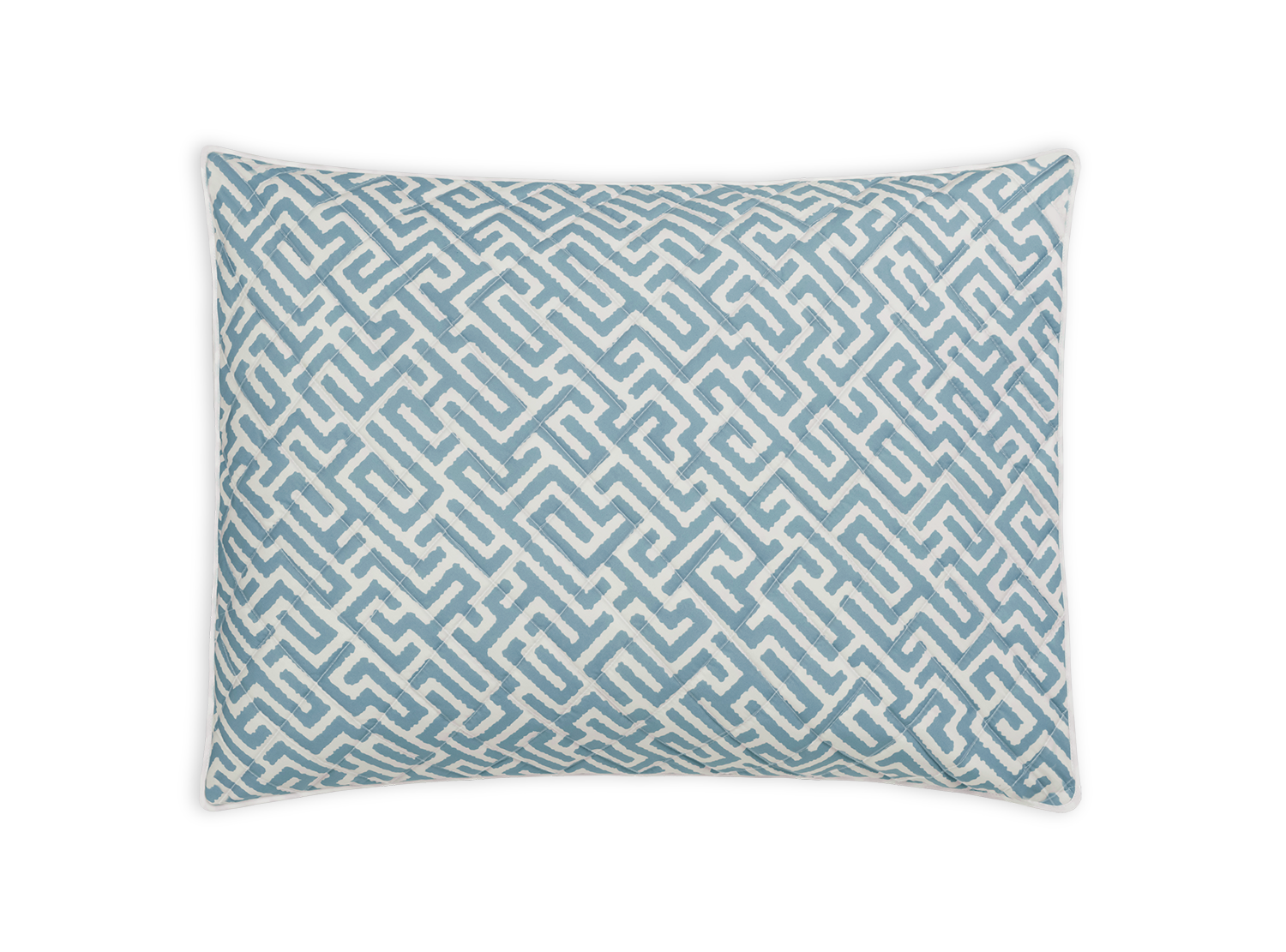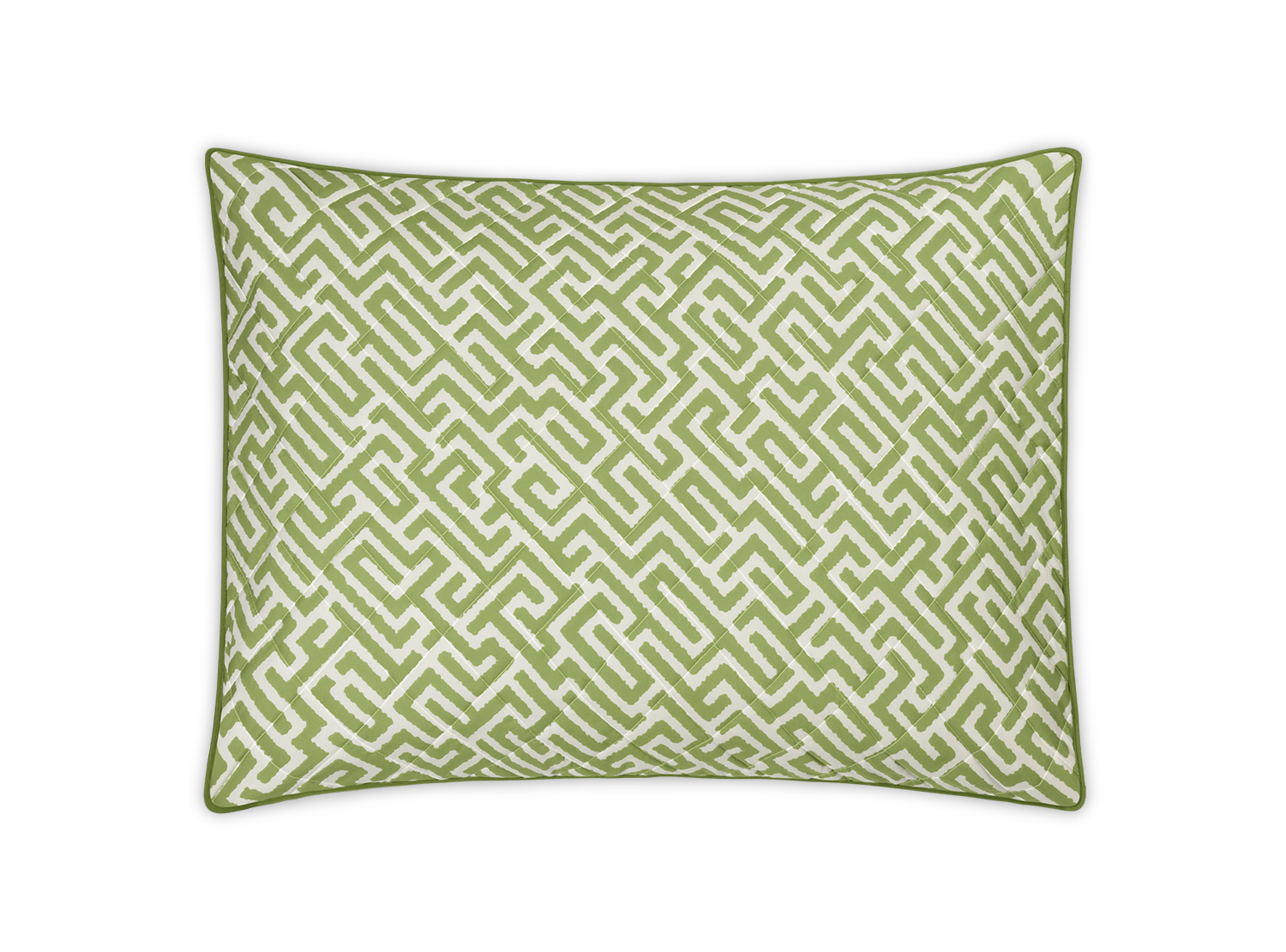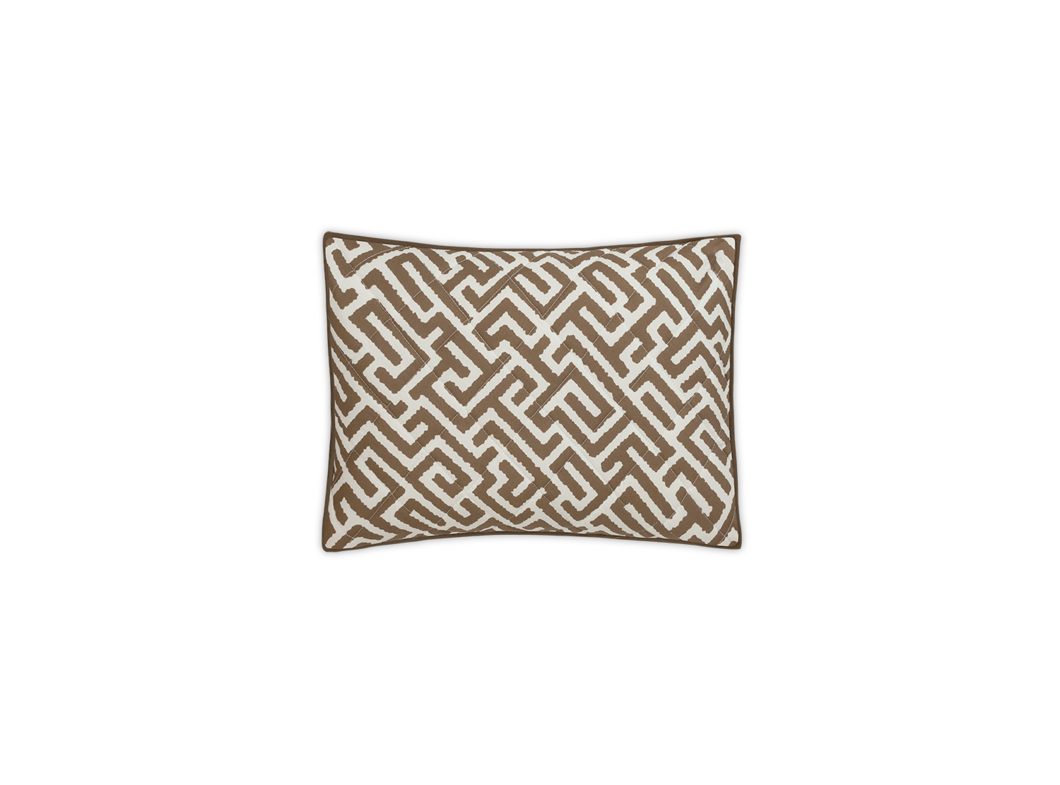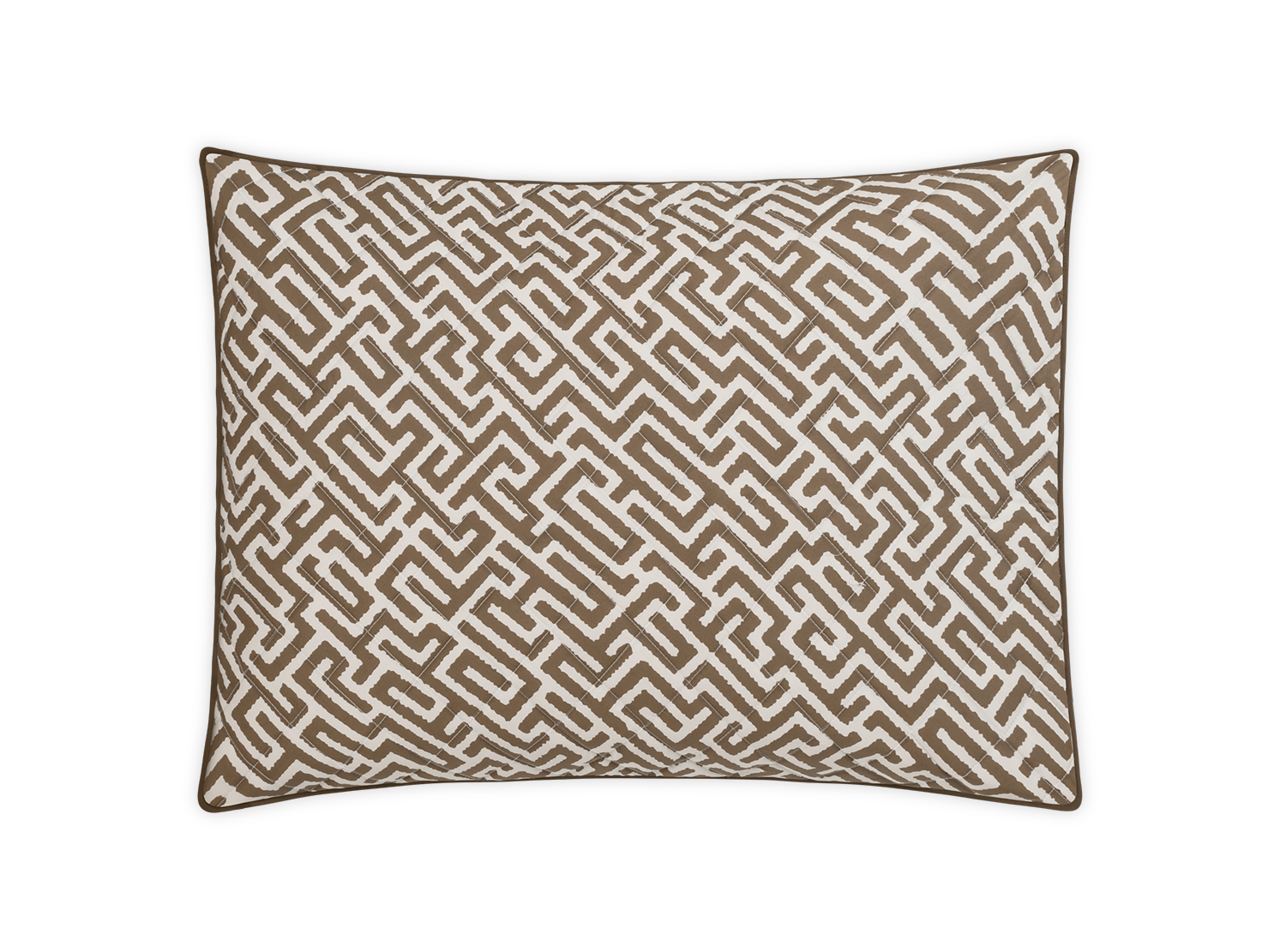 Gabriel is a Matouk Schumacher print featuring a striking geometric motif and complementary piped edge, quilted in a 3" diamond pattern. Reminiscent of a finely woven tapestry, its design introduces dynamic movement and dimension to the bed—boldly graphic yet elegantly refined.