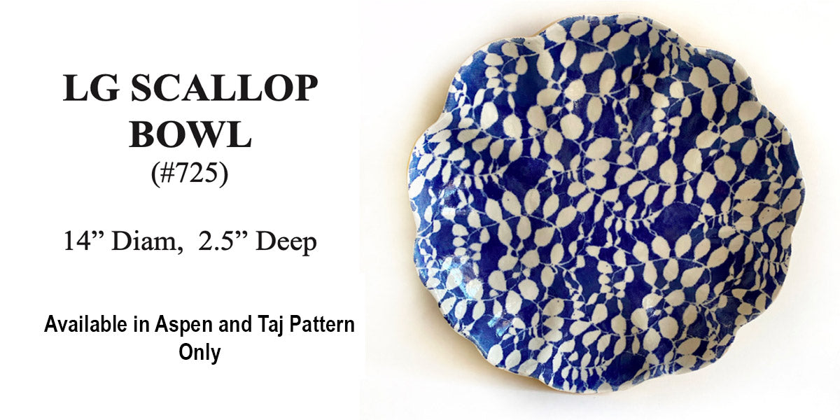 - Large Scallop Bowl: 14" diameter x 2.5" high, aspen and pebble pattern only.