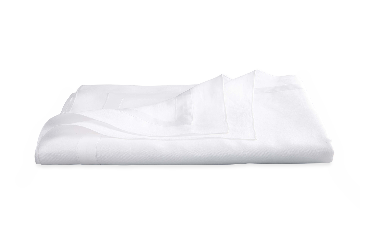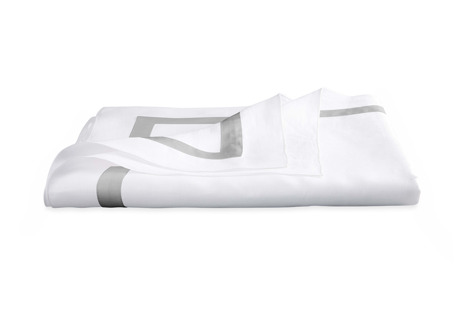 - Exquisite formal white linen napkins, placemats, and tablecloths with a sateen appliqué detail border in complementing color