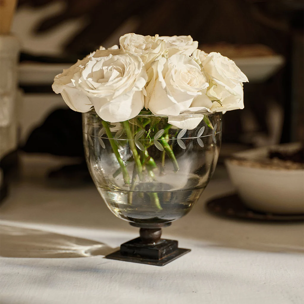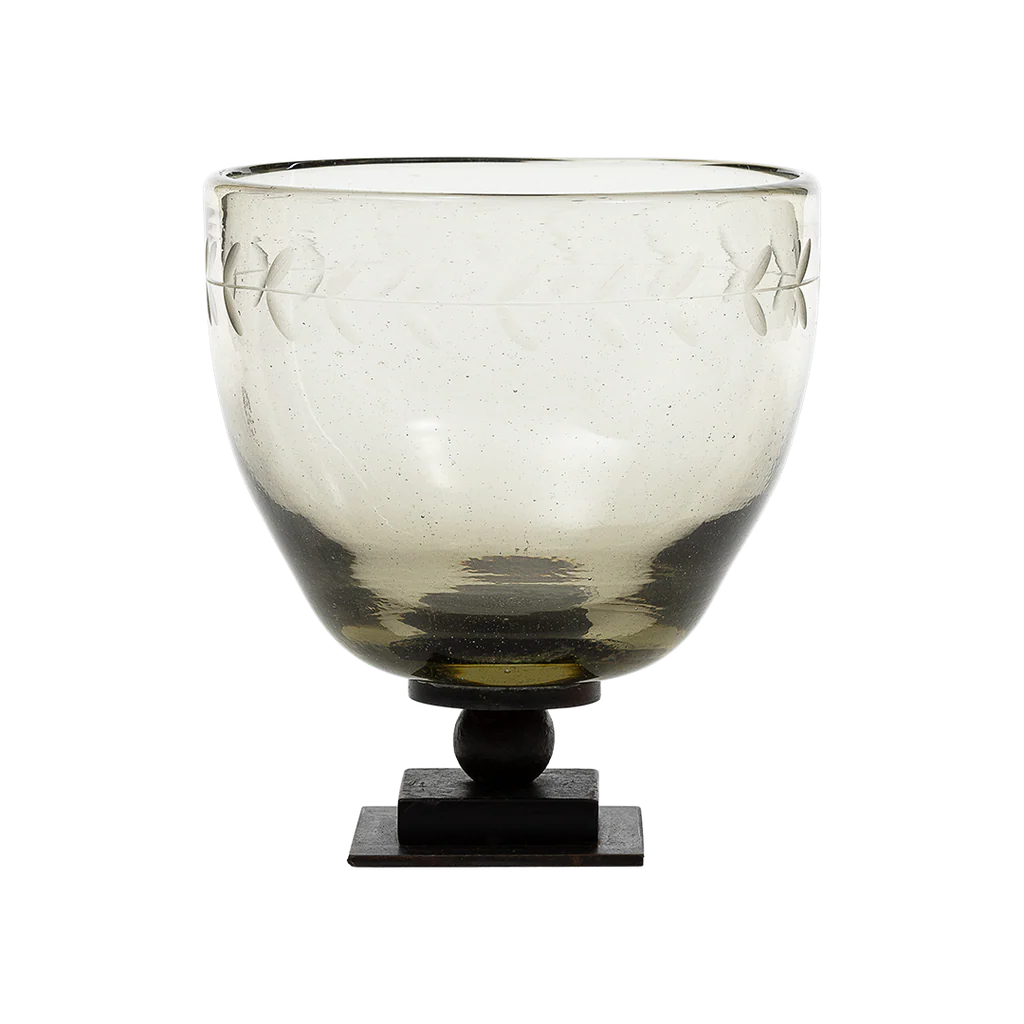 Mouth blown laurel etched glass bowl w/ raised iron stand