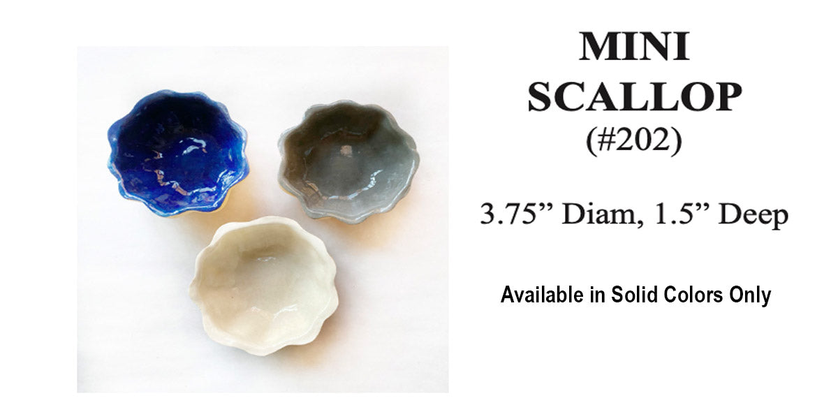 • Mini Scallop Bowl: 3.75" diameter x 1.5" high, solid only, no pattern.