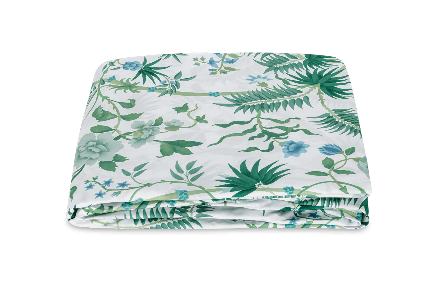 Based on a vibrant Schumacher wallpaper, this tropical print is rendered in a lush emerald and blue-green palette with oversized palm fronds and blooms. Printed on Luca Egyptian cotton percale and finished with a double scallop embroidery, Palmyra offers an island-inspired escape that feels both tranquil and transportive.