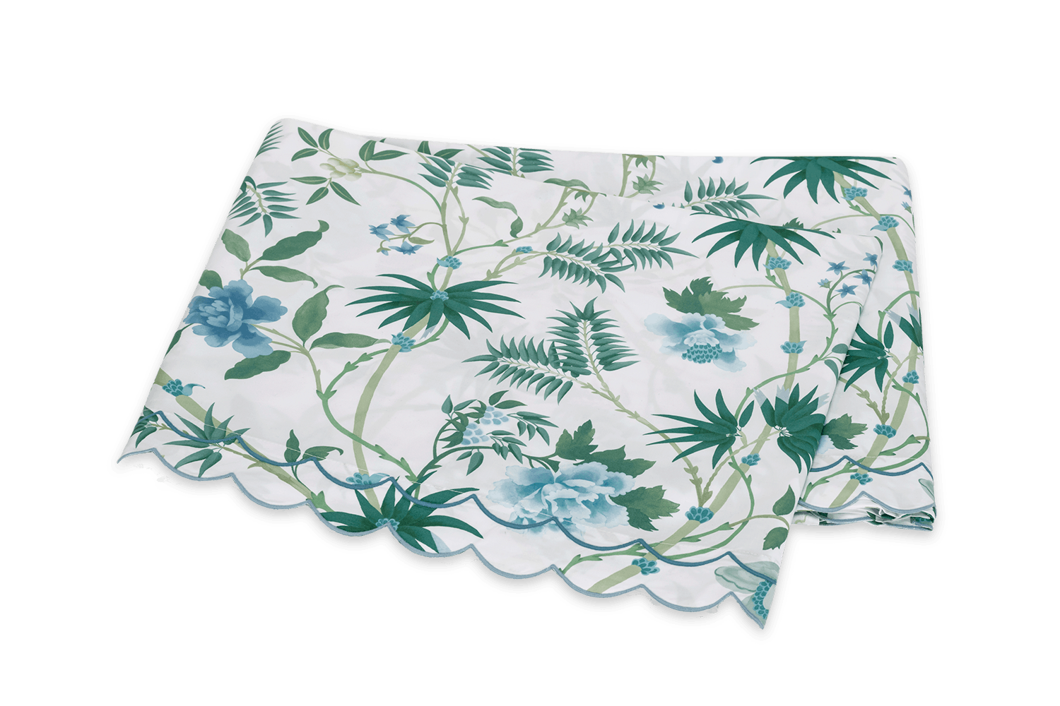 Based on a vibrant Schumacher wallpaper, this tropical print is rendered in a lush emerald and blue-green palette with oversized palm fronds and blooms. Printed on Luca Egyptian cotton percale and finished with a double scallop embroidery, Palmyra offers an island-inspired escape that feels both tranquil and transportive.