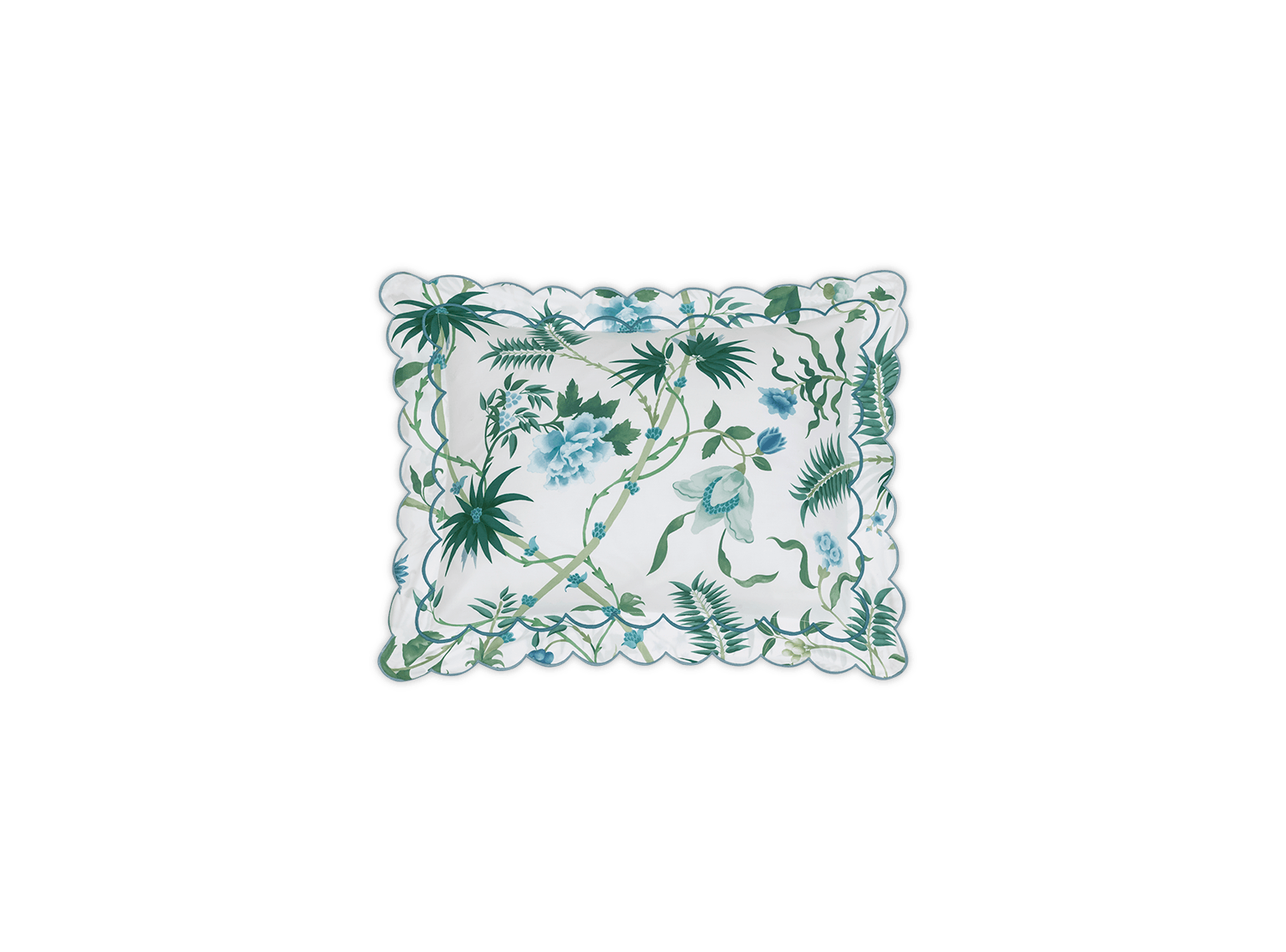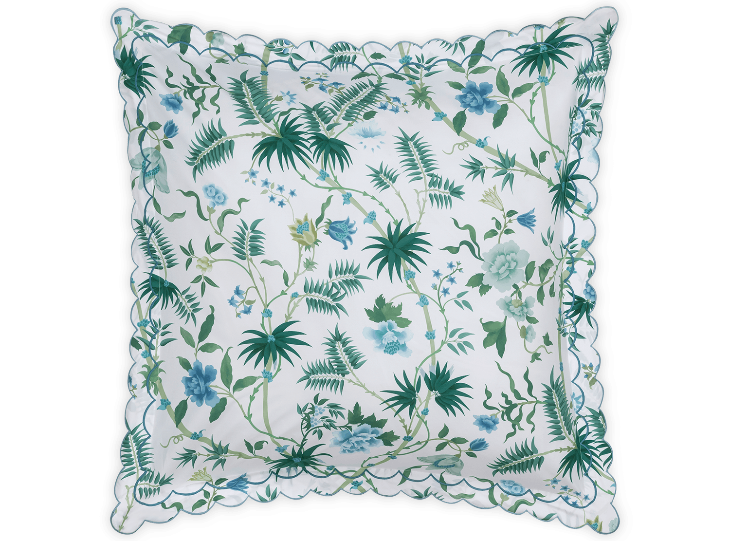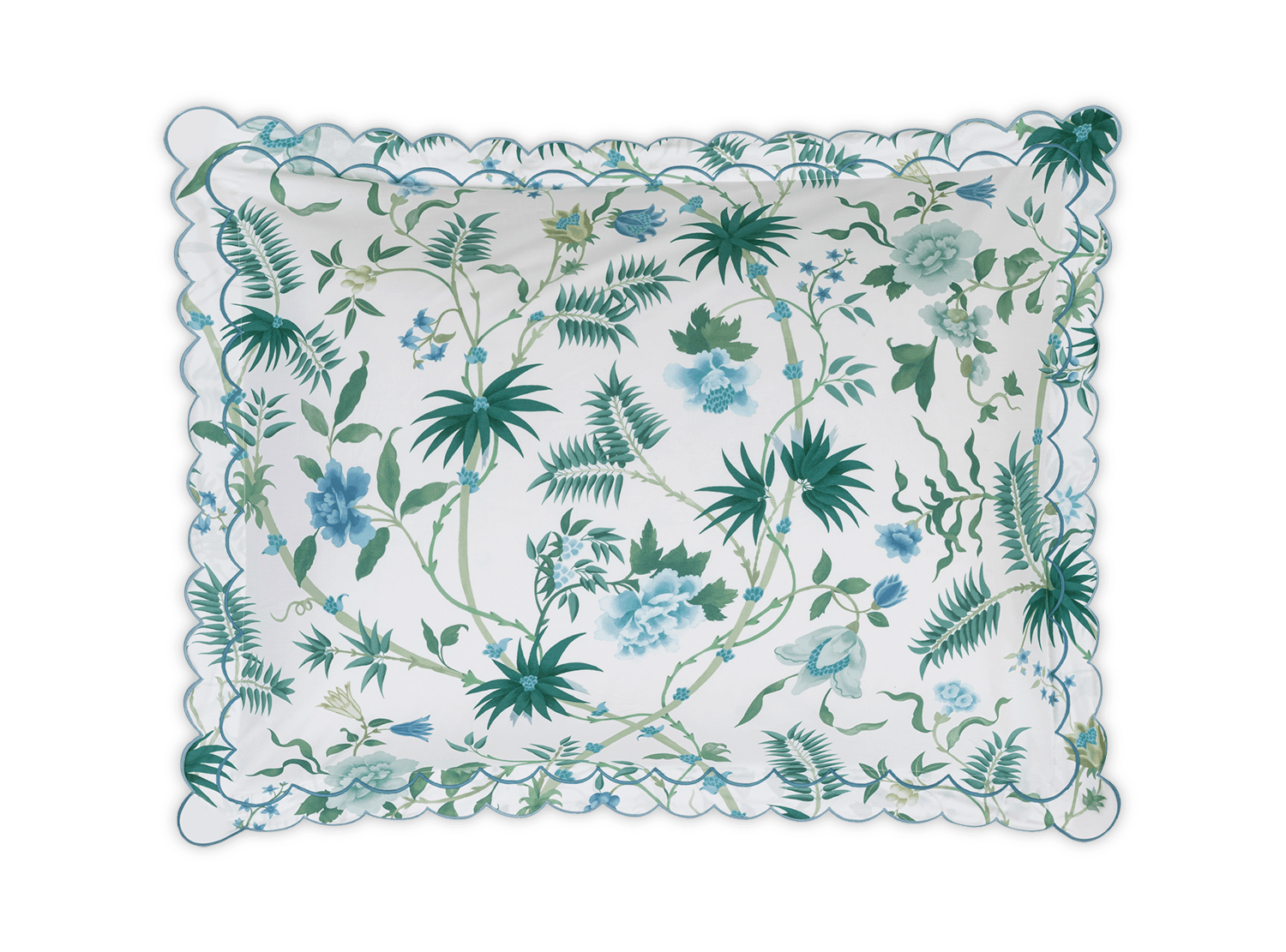 Based on a vibrant Schumacher wallpaper, this tropical print is rendered in a lush emerald and blue-green palette with oversized palm fronds and blooms. Printed on Luca Egyptian cotton percale and finished with a double scallop embroidery, Palmyra offers an island-inspired escape that feels both tranquil and transportive.