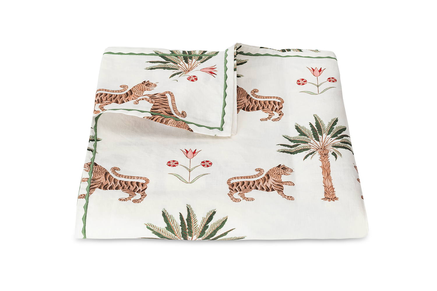• Enchanting Schumacher jungle inspired pattern featuring tigers and palm trees printed on Matouk's linen finished with an embroidered detail