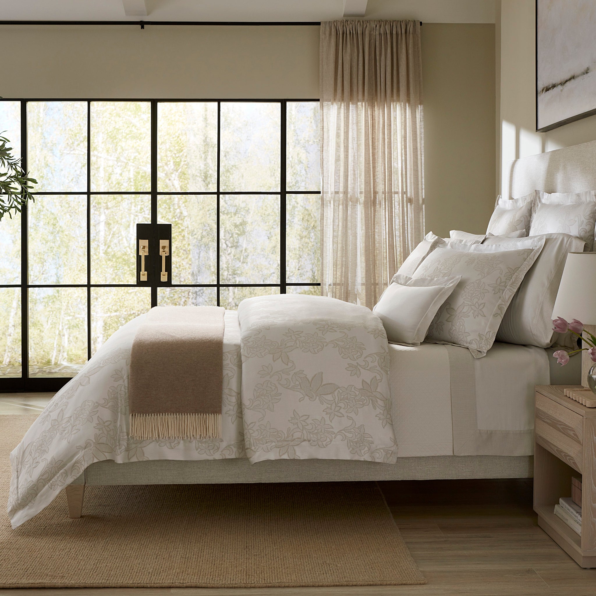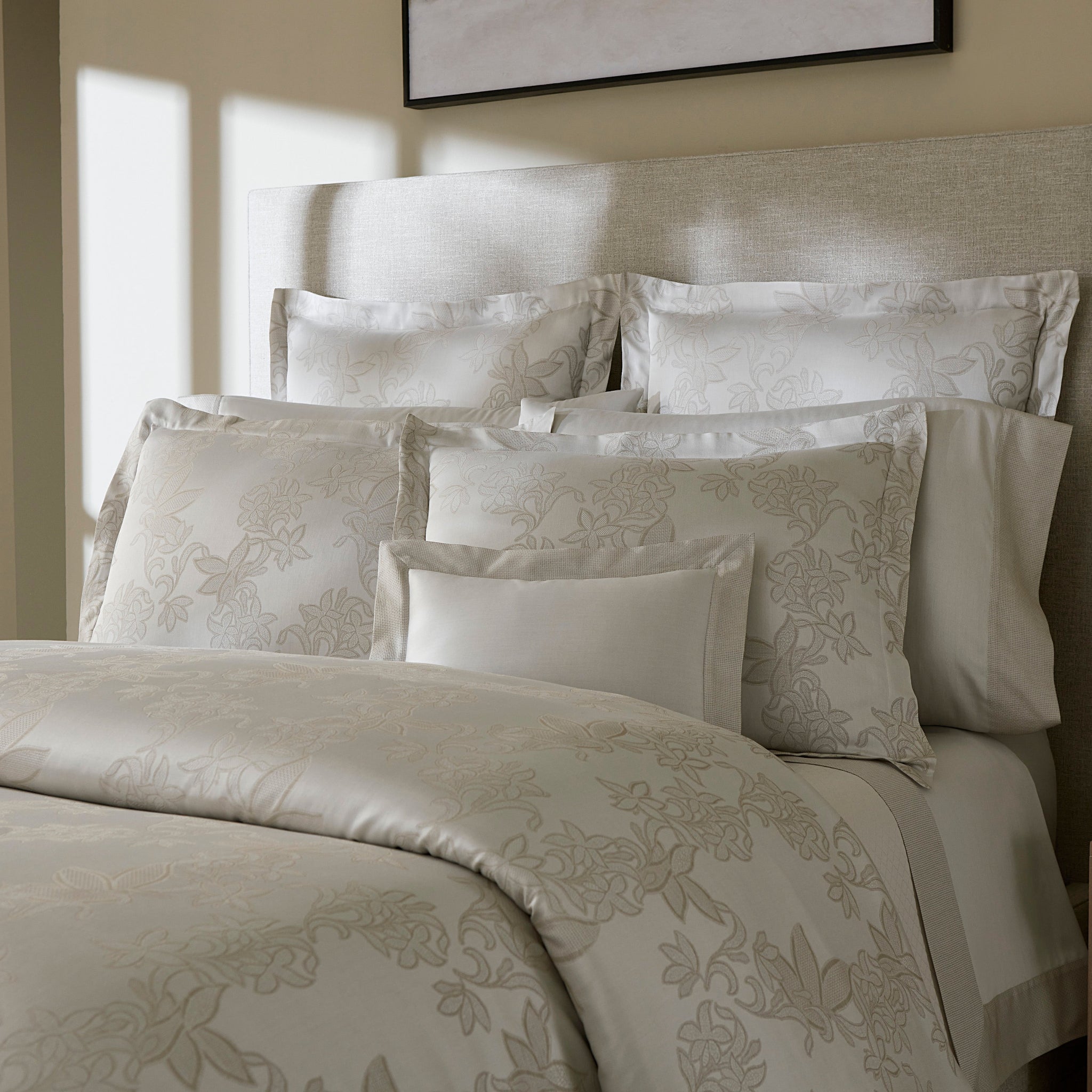 In the storied threads of Tivoli, a tale of romantic nostalgia unfolds. This exquisite Italian-made yarn-dyed sateen jacquard weaves a delicate floral design, reminiscent of the intricate texture of lace. The soft, taupe base of Tivoli gently cradles these ethereal blooms, as though they harbor secrets from bygone eras.