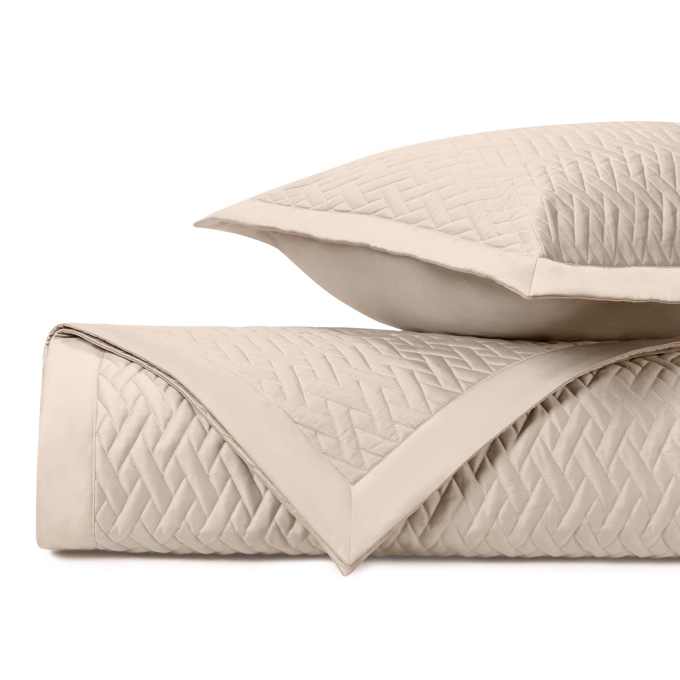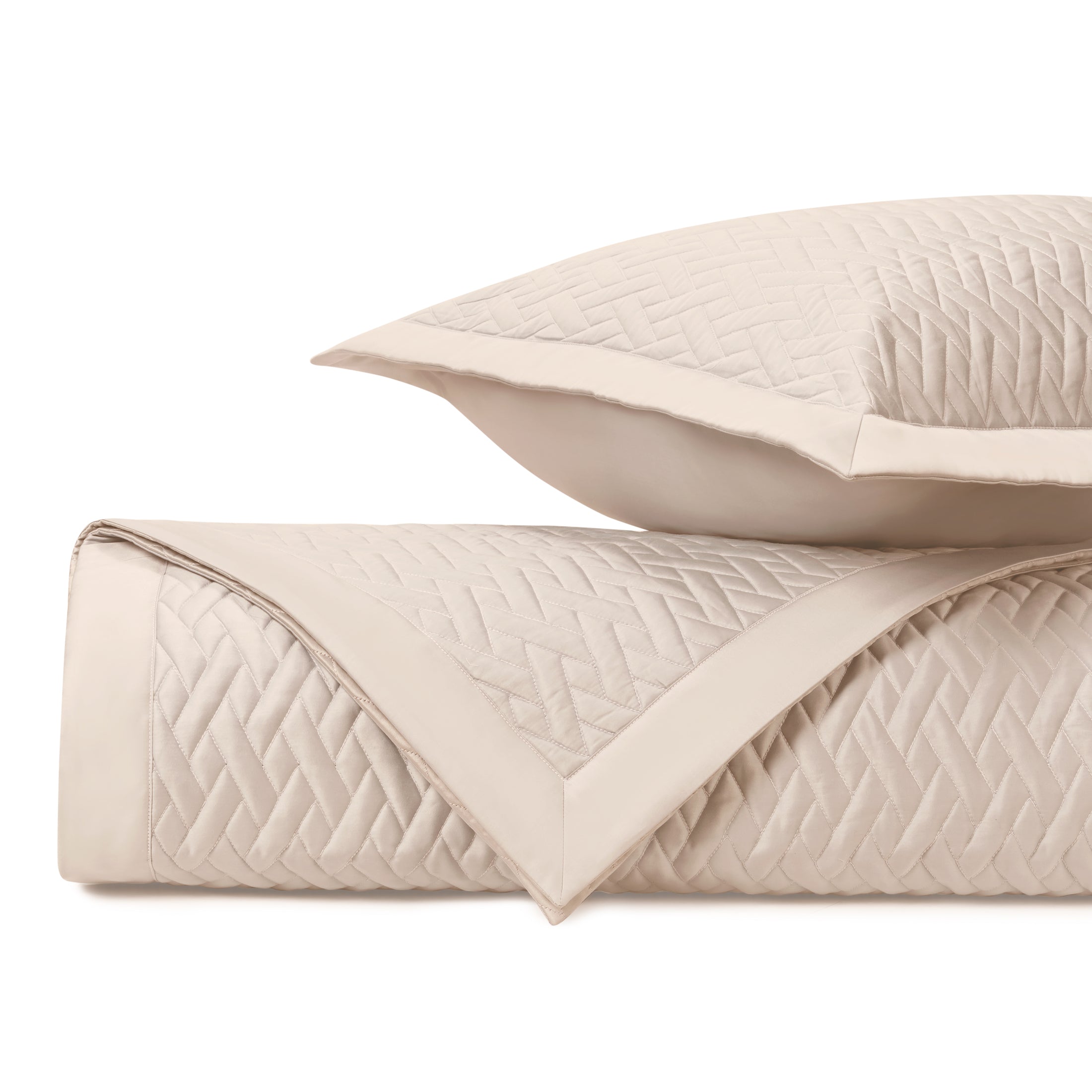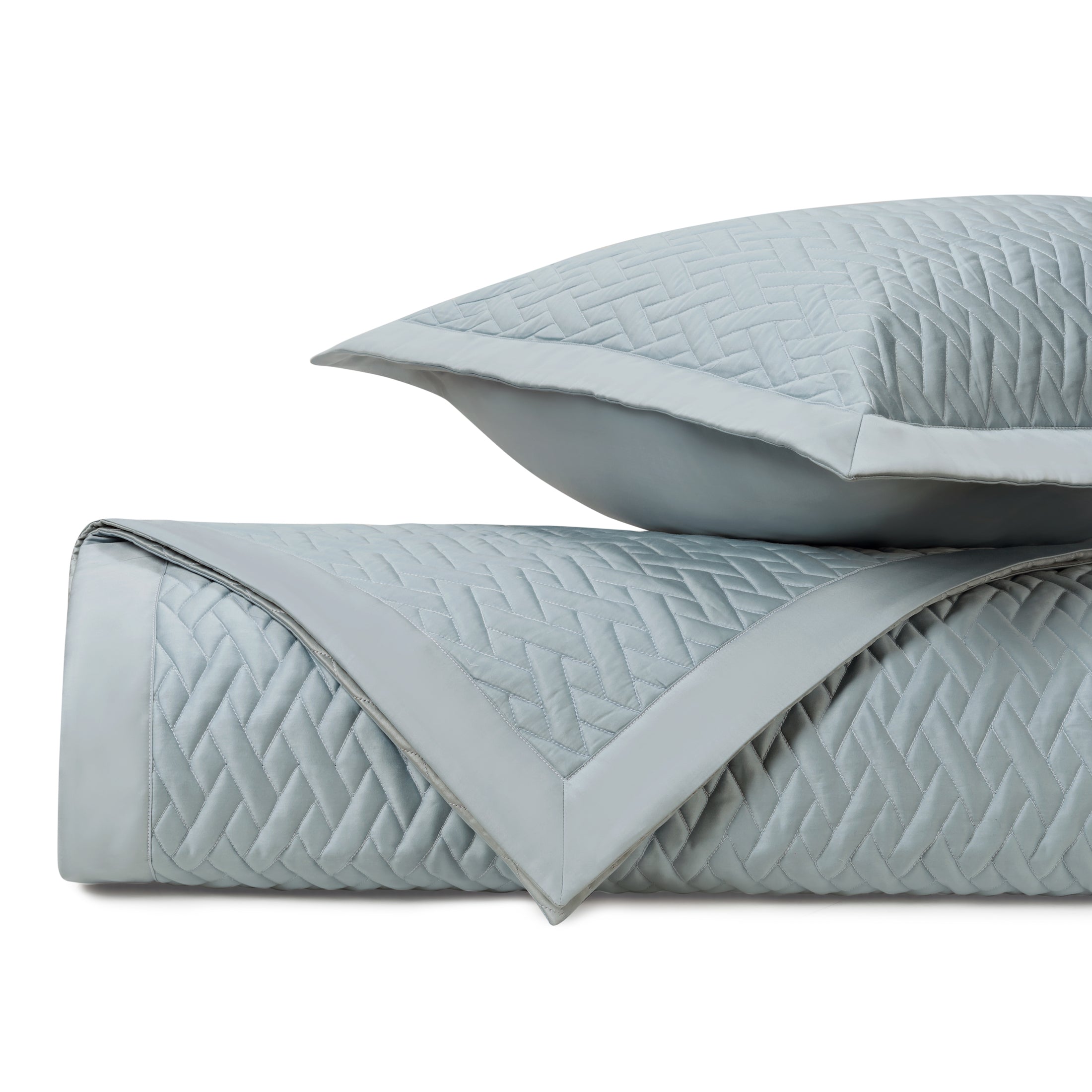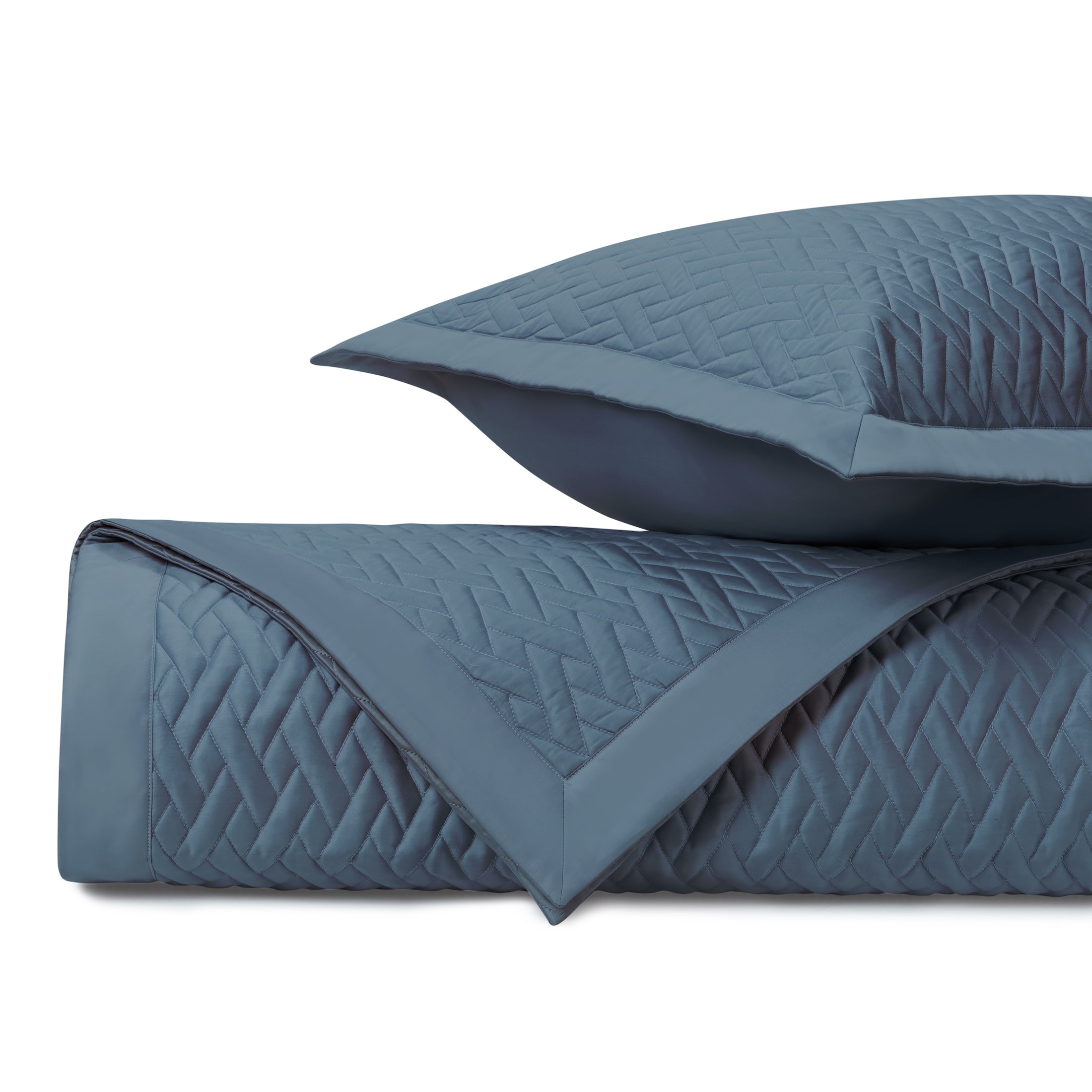 Viscaya coverlet and shams feature a quilted weave design with small diamond centers on 100% Egyptian cotton. The pattern adds texture and dimension, and the sateen fabric gives a subtle sheen. Each piece is made to order in the USA, so customization of size, color, and details are always an option.