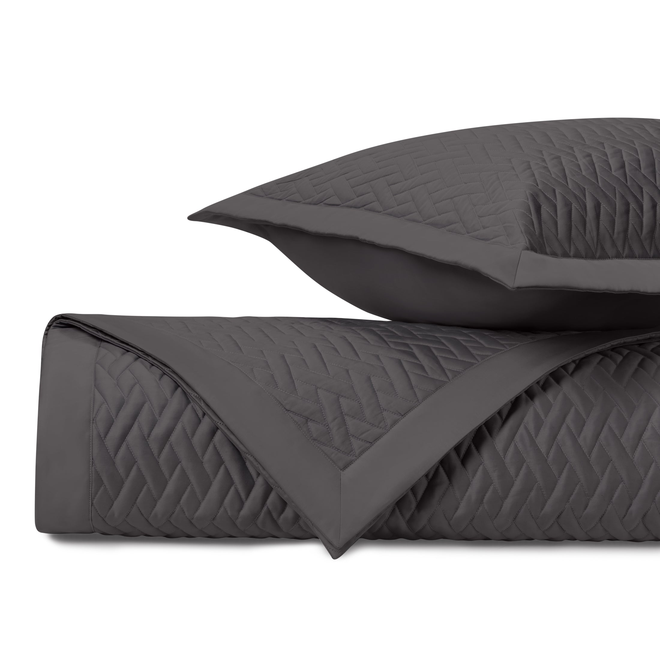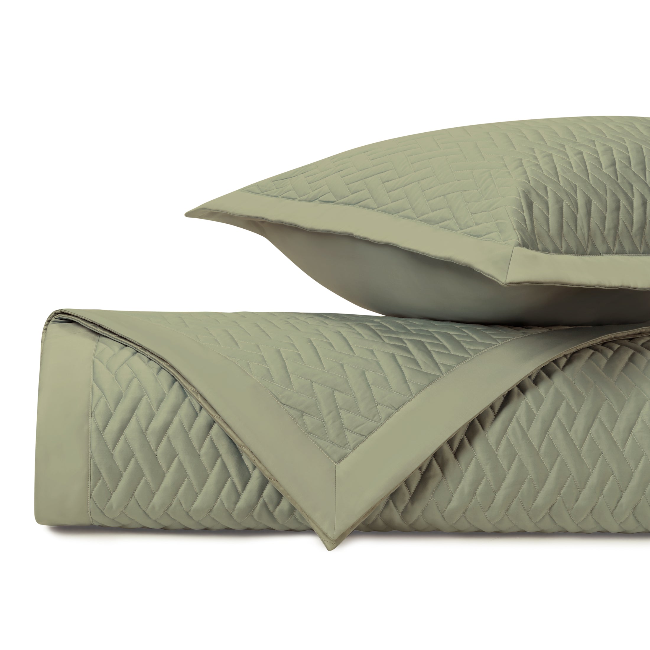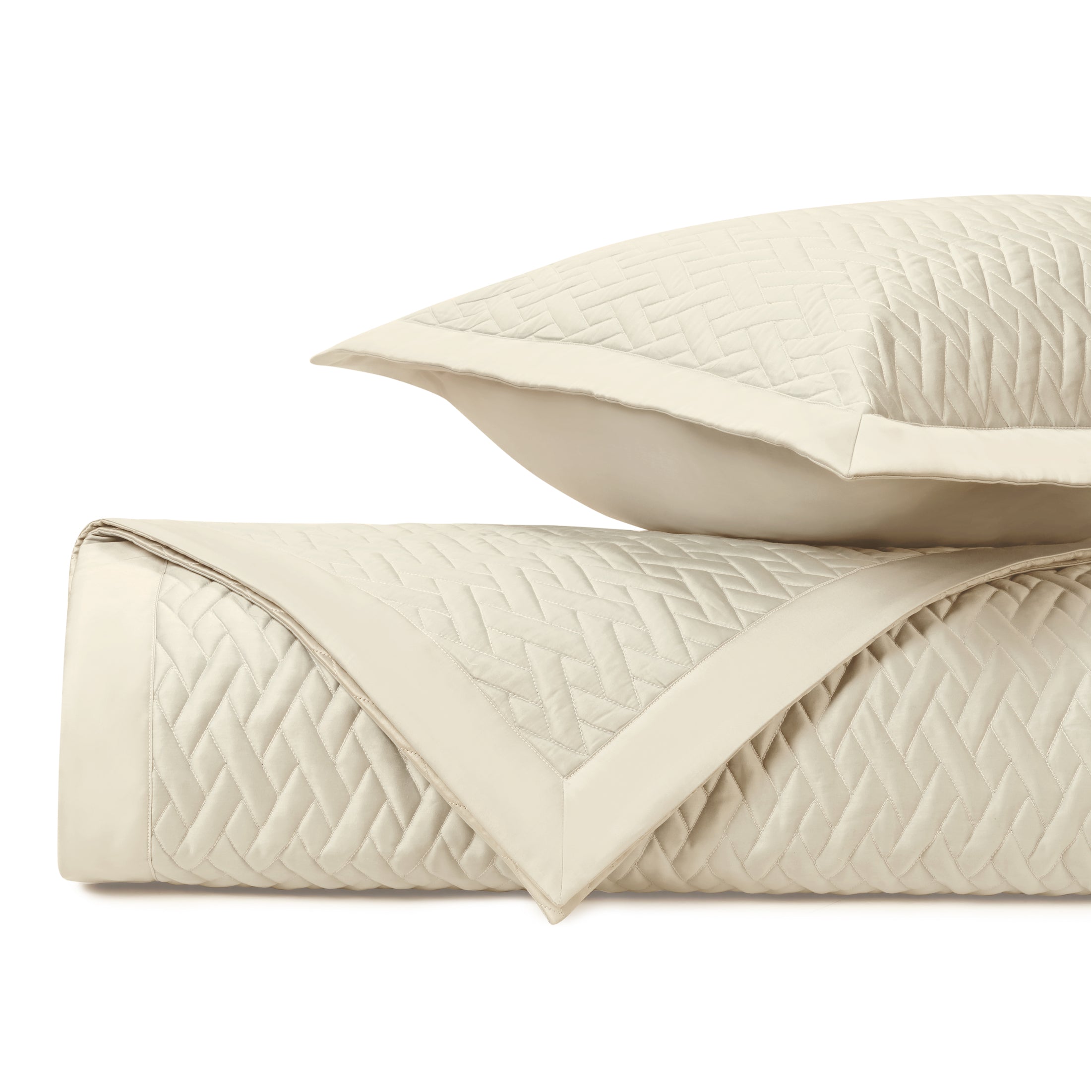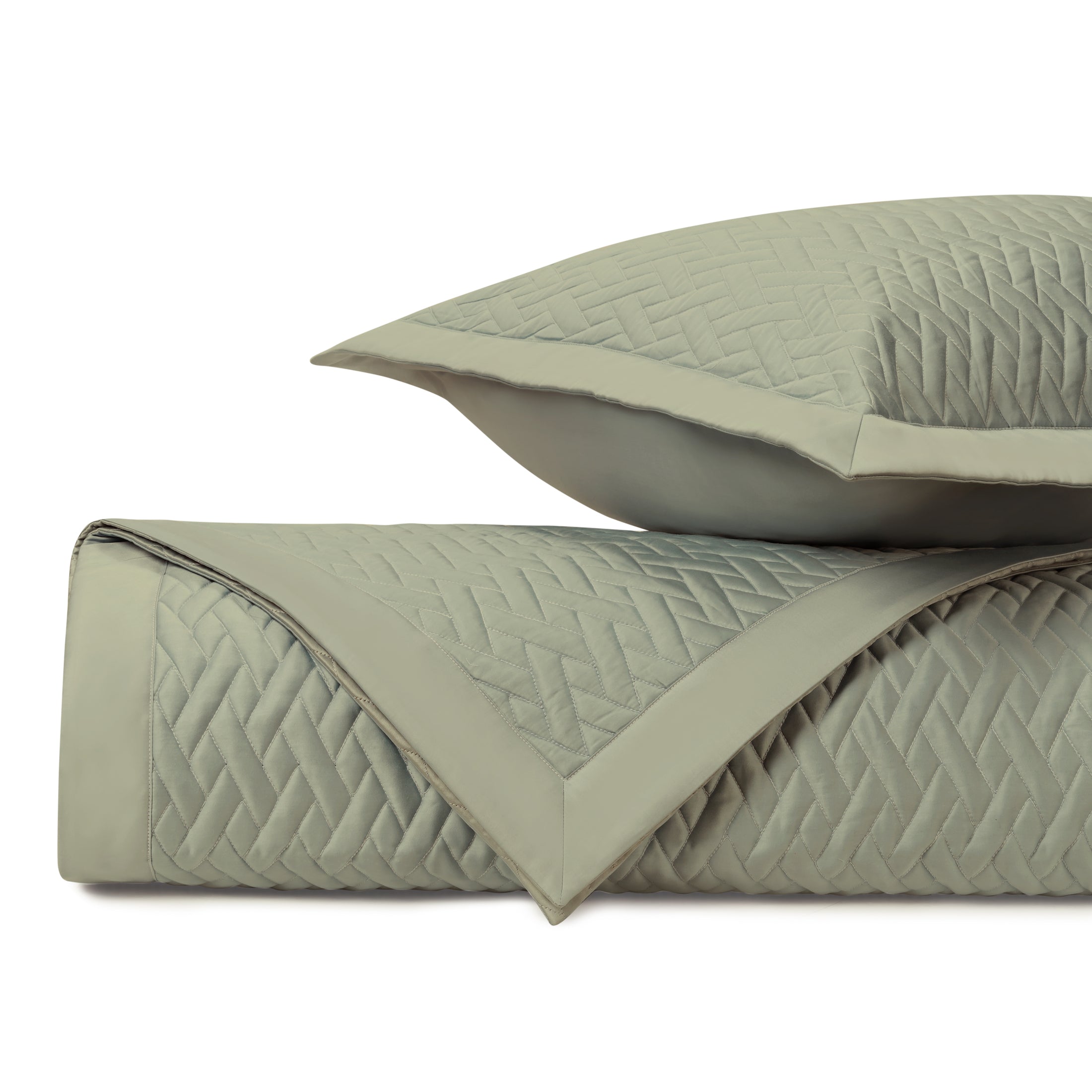 Viscaya coverlet and shams feature a quilted weave design with small diamond centers on 100% Egyptian cotton. The pattern adds texture and dimension, and the sateen fabric gives a subtle sheen. Each piece is made to order in the USA, so customization of size, color, and details are always an option.