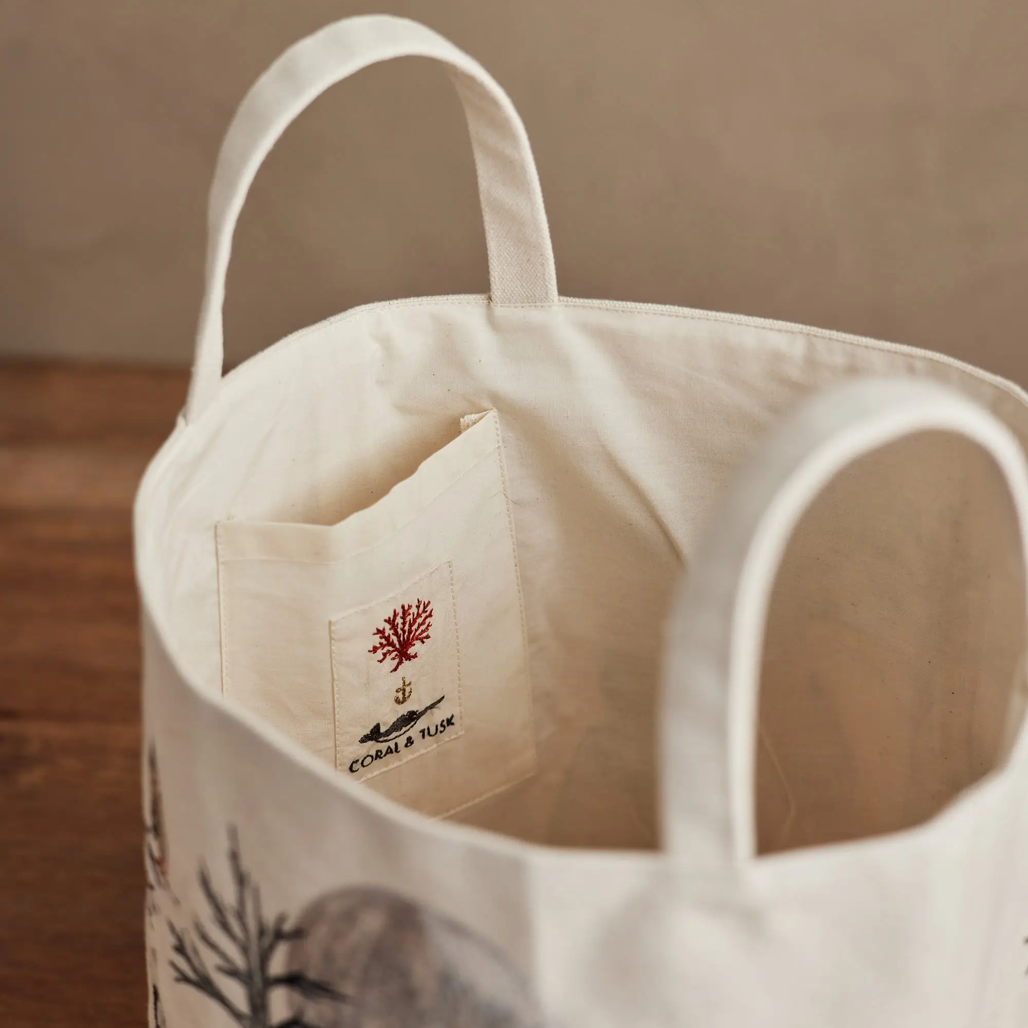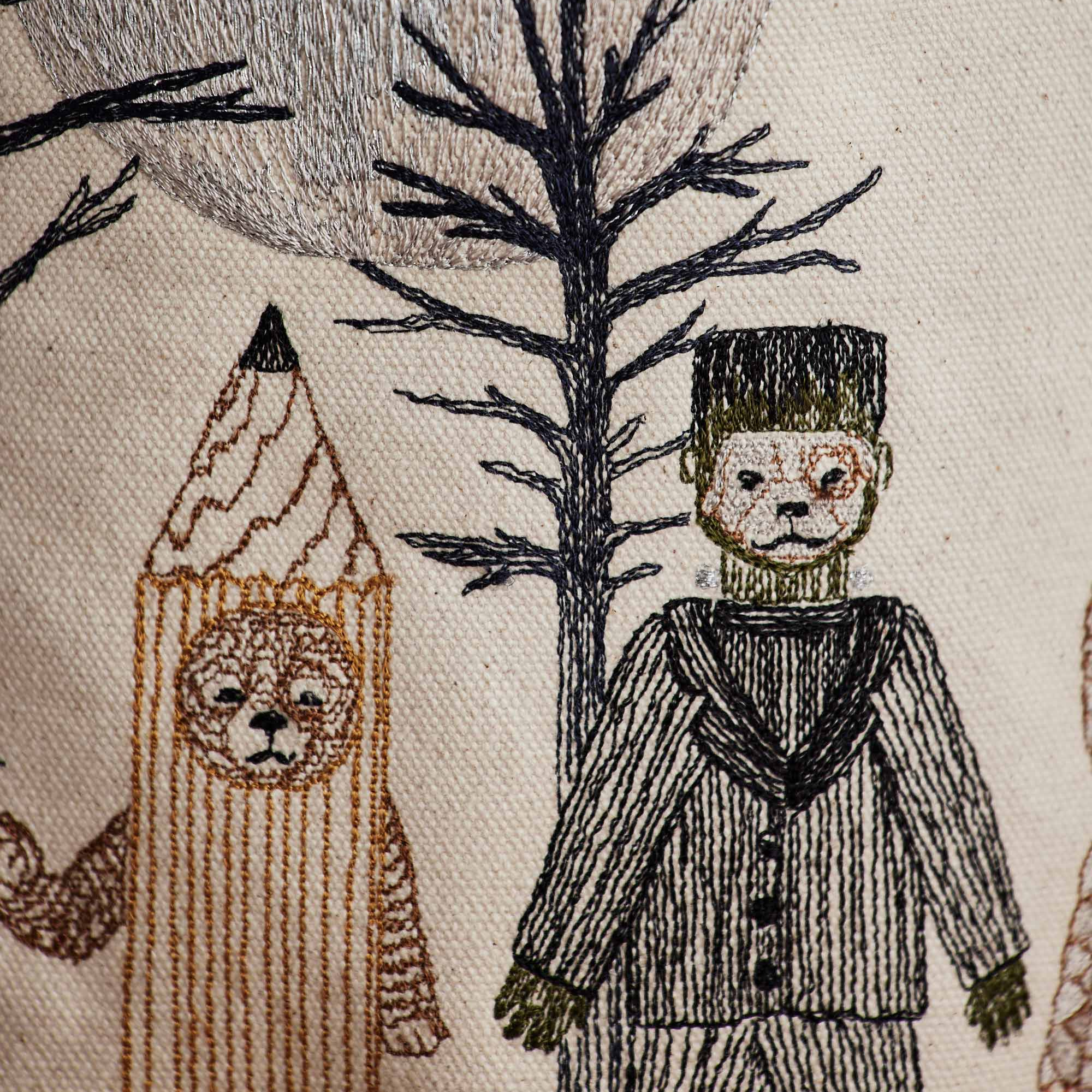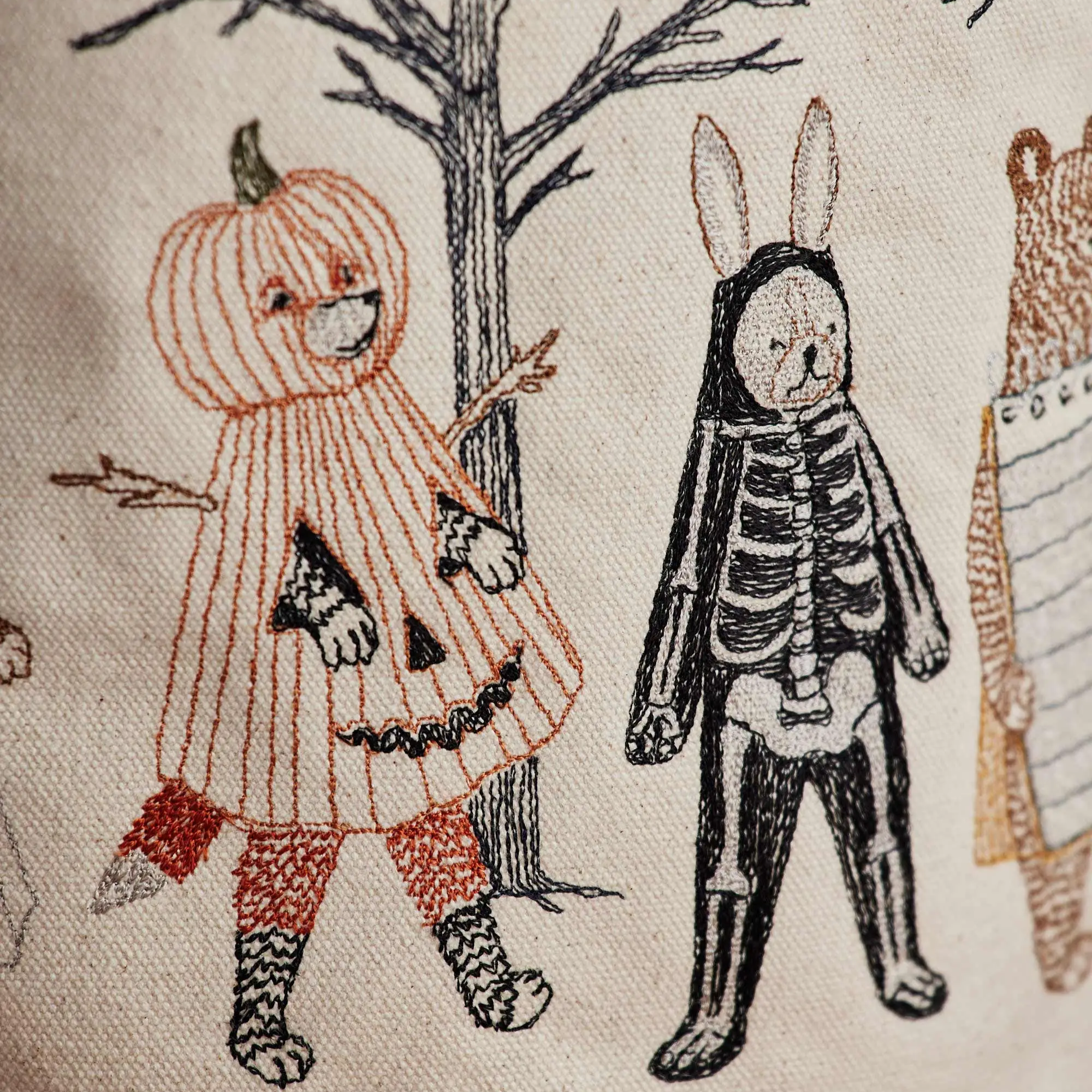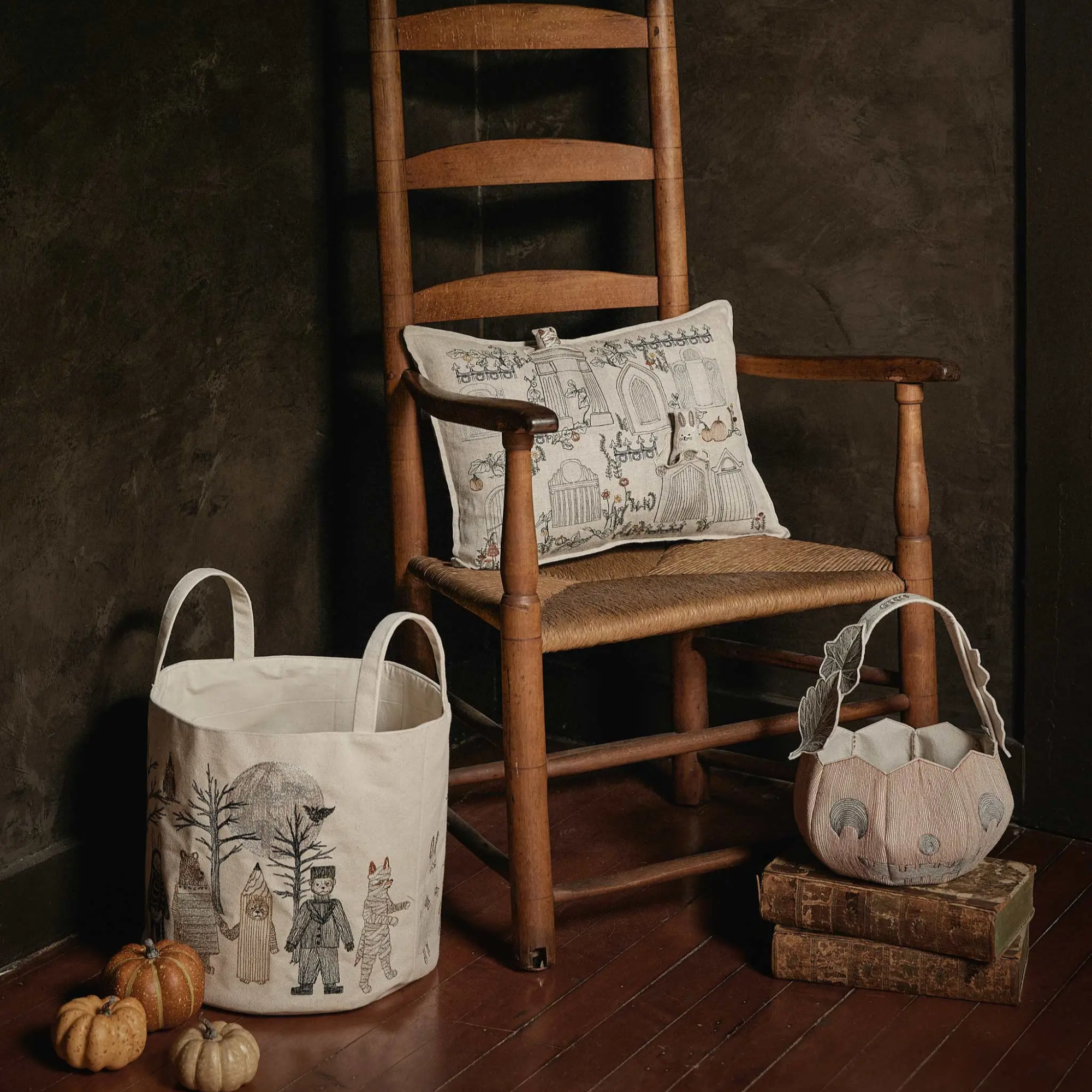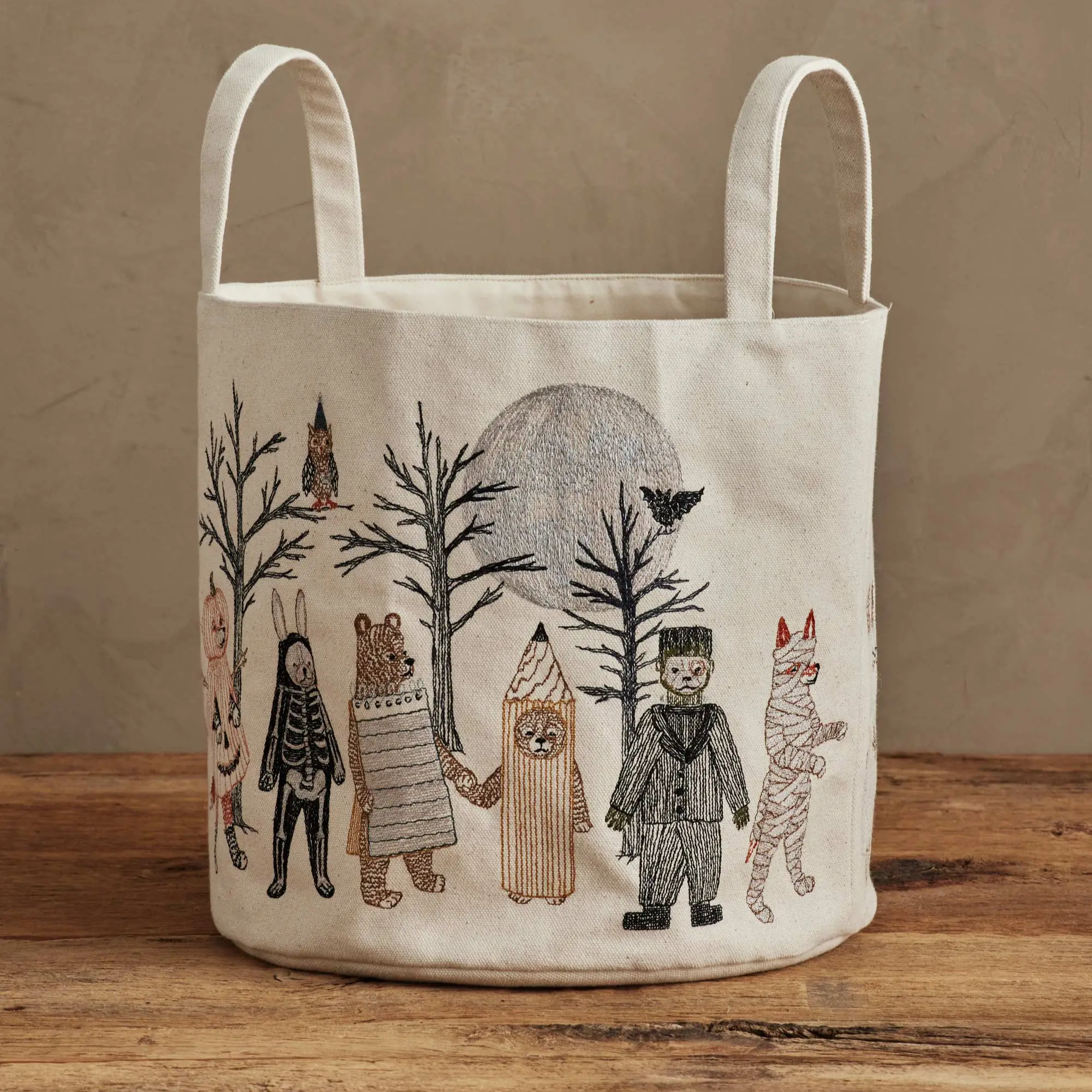 Hand out candy this Halloween with the help of our Full Moon Masquerade Bucket! Coral & Tusk's best-selling Halloween design is now available as a canvas container. Embroidered on all sides, find foxes dressed as a Jack-o’-lantern and mummy, rabbits disguised as a skeleton and ghost, bear brothers as a matching pencil and notepad pair, and a dog in a Frankenstein costume. Beneath the full moon and perched in the eerie trees is an owl in a wizard’s hat and a bat. The bucket includes two handles on each side and an interior pocket.