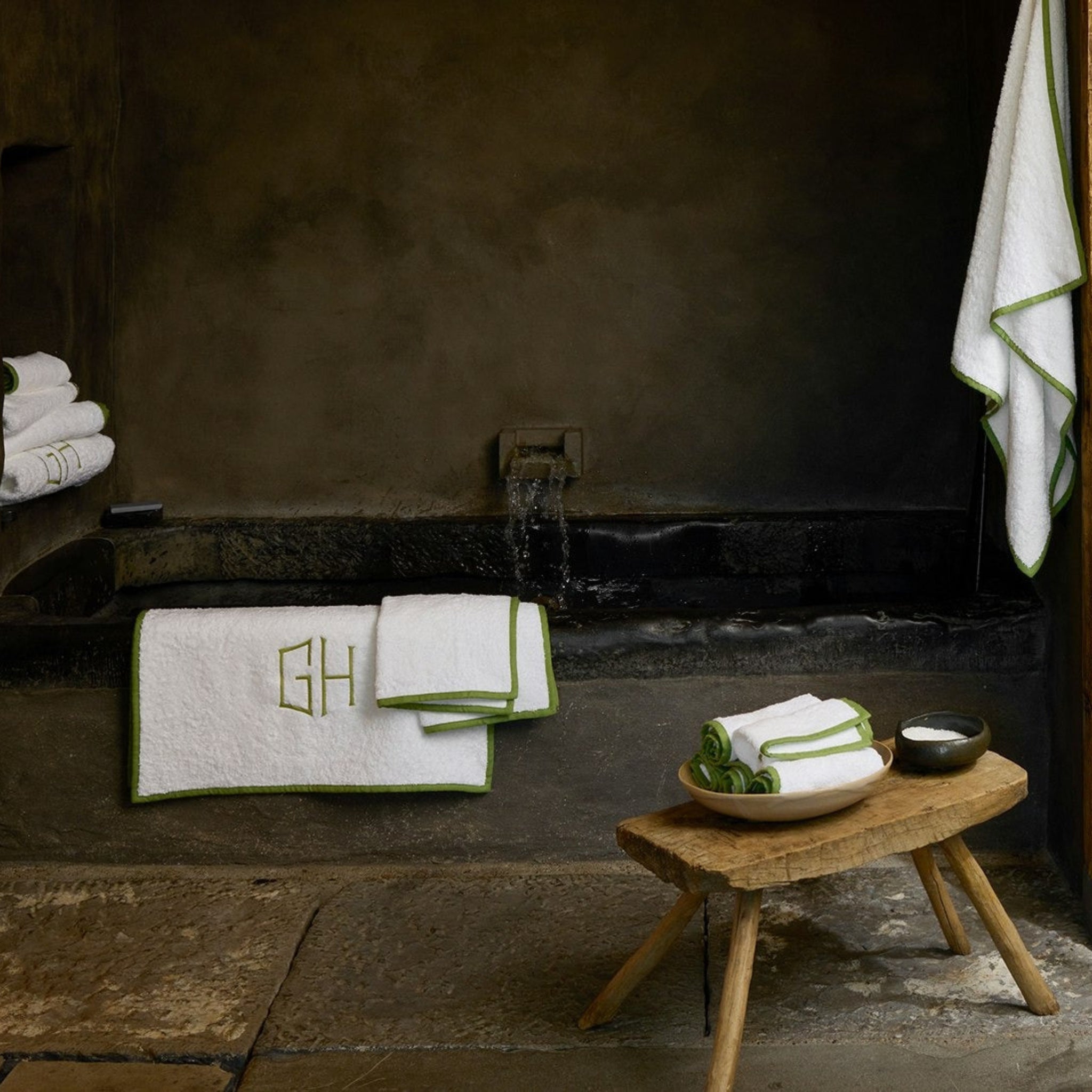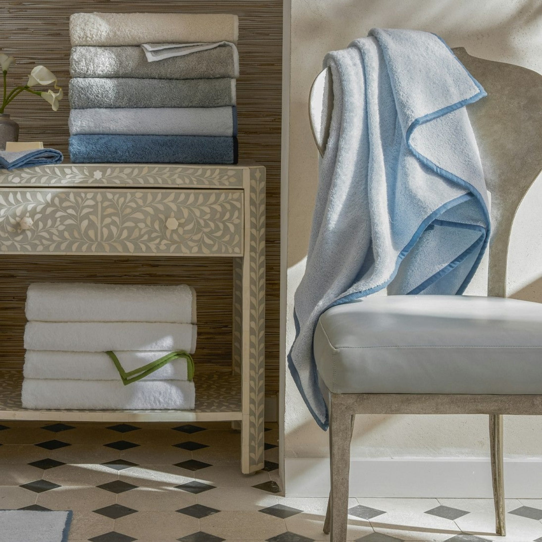 A lush addition to a casual family bath, Enzo starts simply with Cairo long-staple cotton terry. Half-inch linen piping with smartly mitered corners brings a pop of colorful contrast.