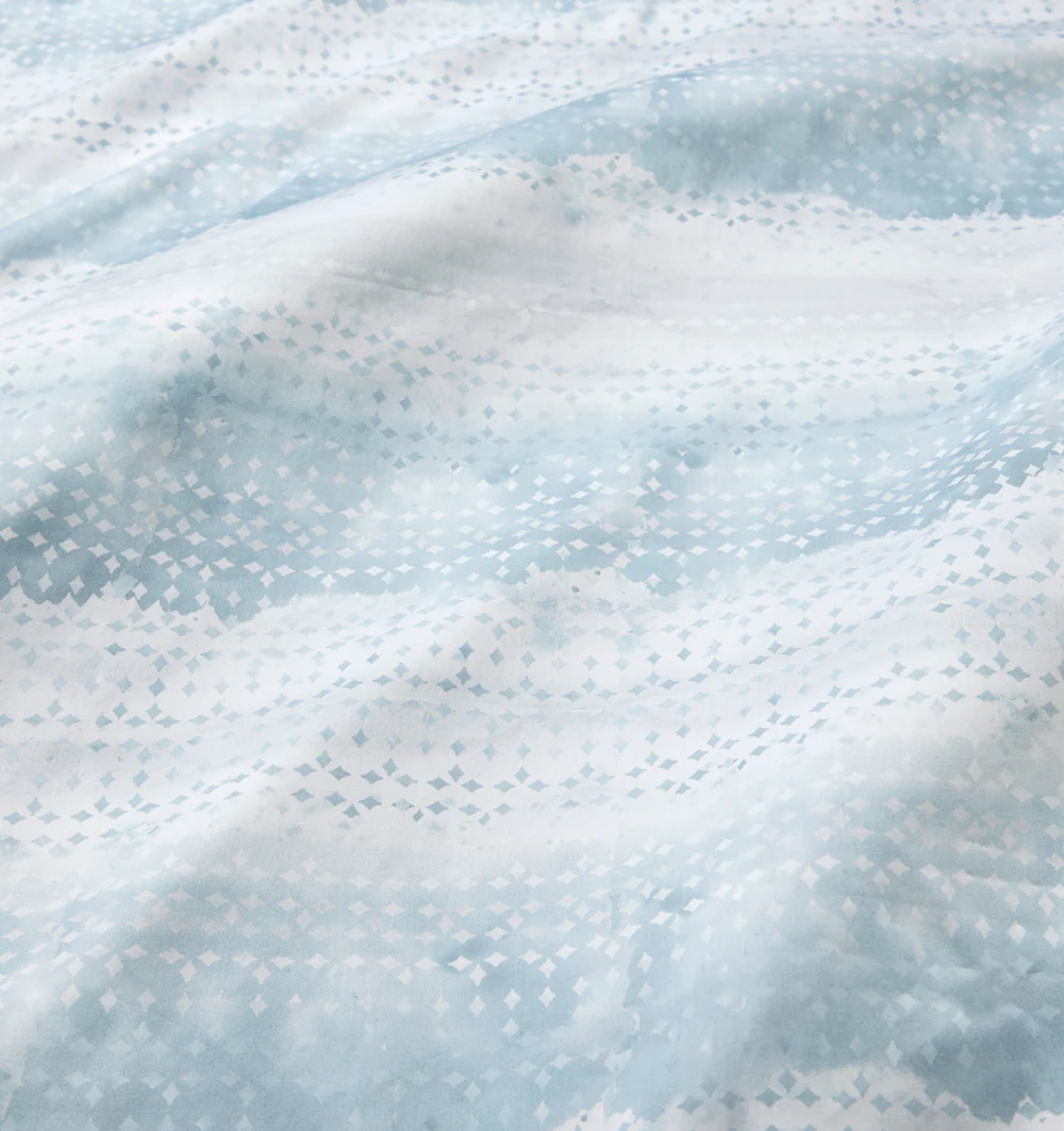 Printed on pure cotton sateen in Italy, Brillanti offers a soft, luminous surface that feels as fluid as it looks. Its printed design shimmers in tones of sky blue, with a rhythmic pattern that drifts across the fabric like light reflected on water. Mini-flanges provide gentle structure, while plain hems let the subtle movement of the motif remain uninterrupted. Brillanti brings a sense of calm and spaciousness to the bed—cool, airy, and quietly radiant.