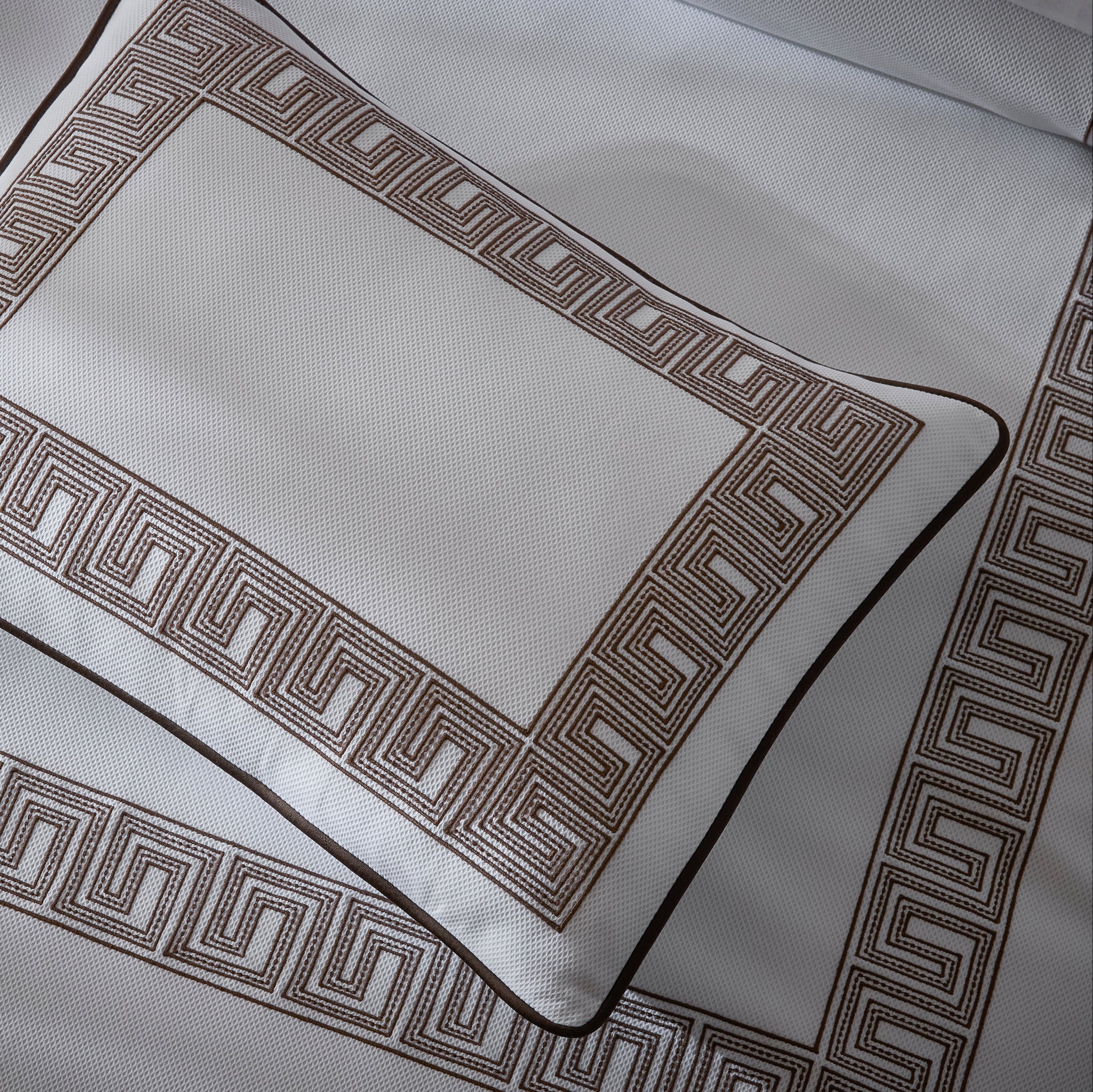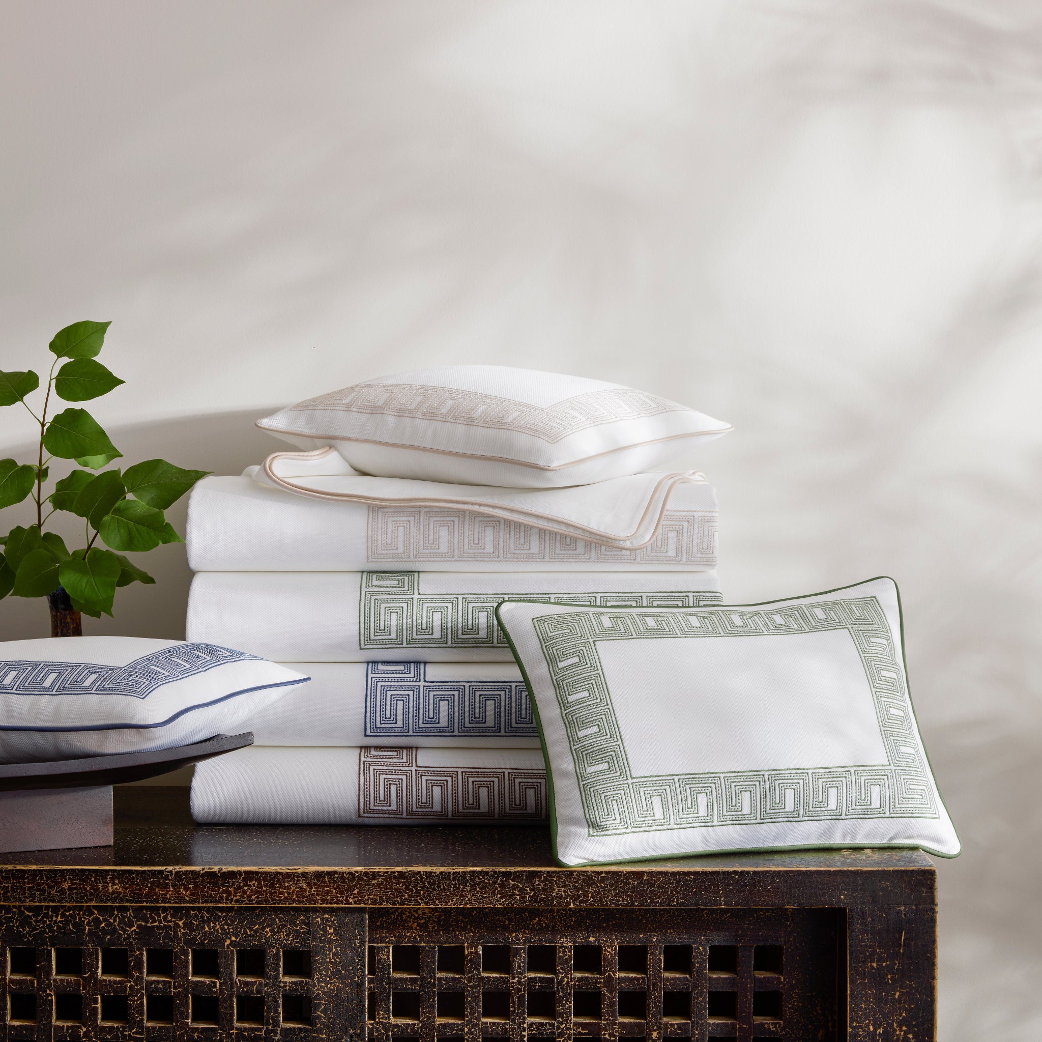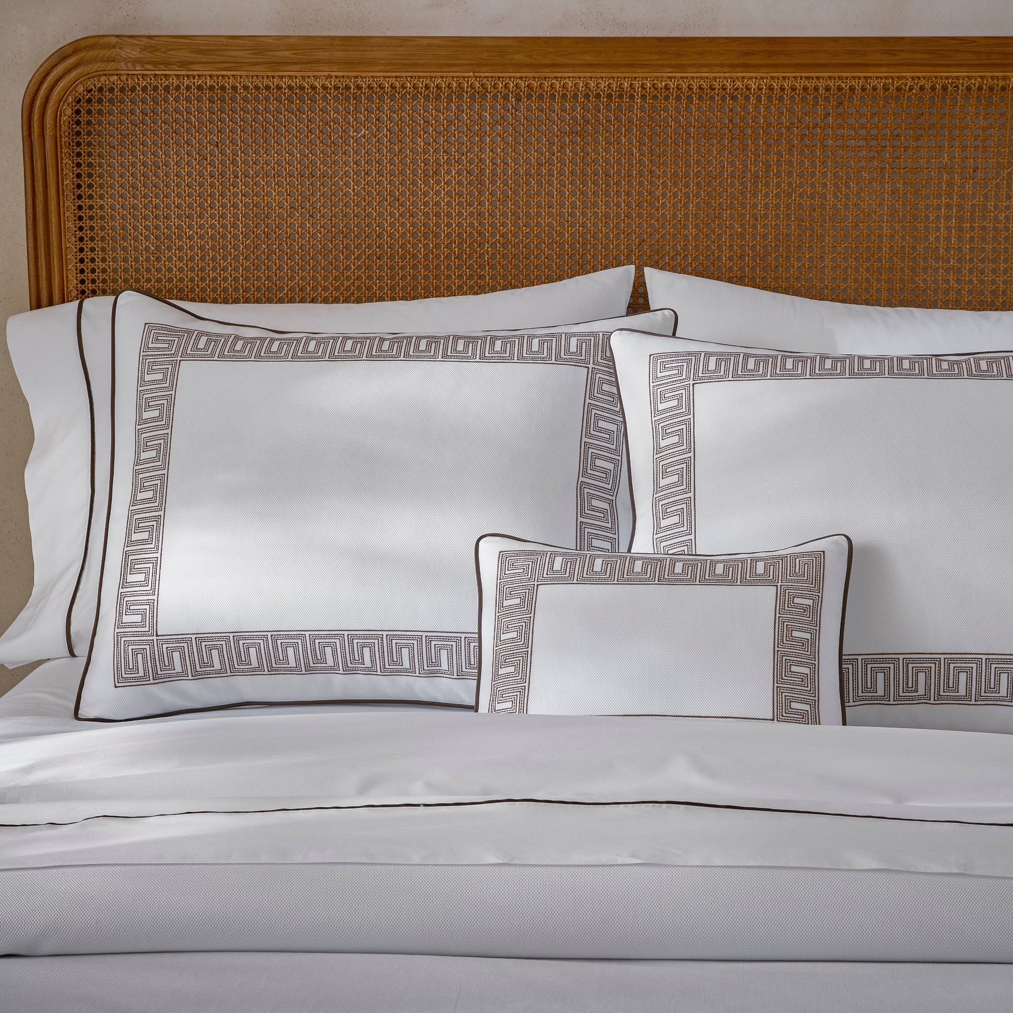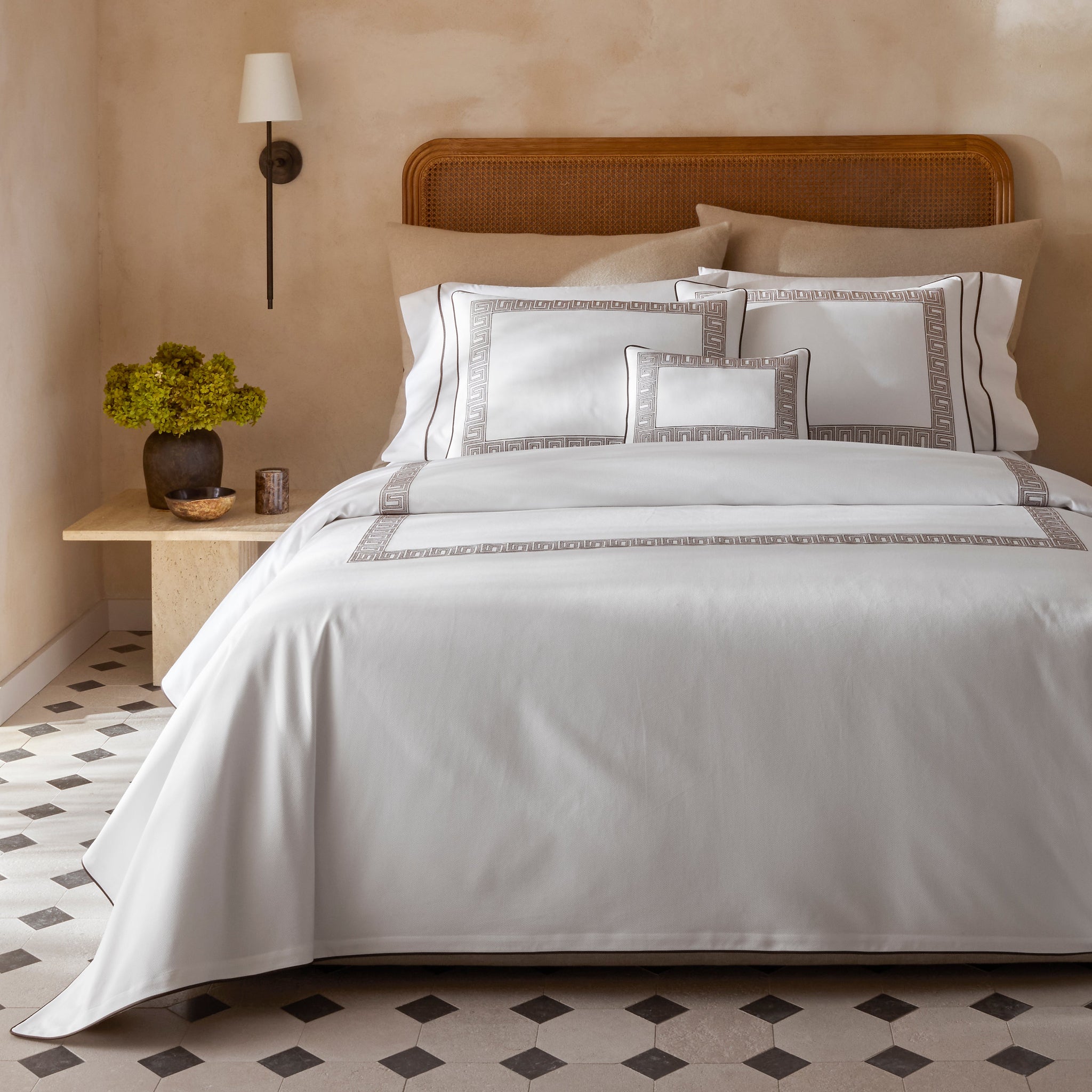 Inspired by an intricately beaded Schumacher tape, Matouk's boldly embroidered Ophelia collection embodies a traditional Greek key pattern with a bespoke sensibility. Now available on Matouk's signature Camilla Pique with a coordinating corded edge in Nocturne sateen, it’s a playful, exuberant take on a traditional motif.