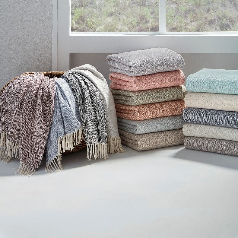 - Brushed cotton creates plush, alluring texture. Soft color blends with cream in a herringbone weave. Finished with twisted, natural fringe.