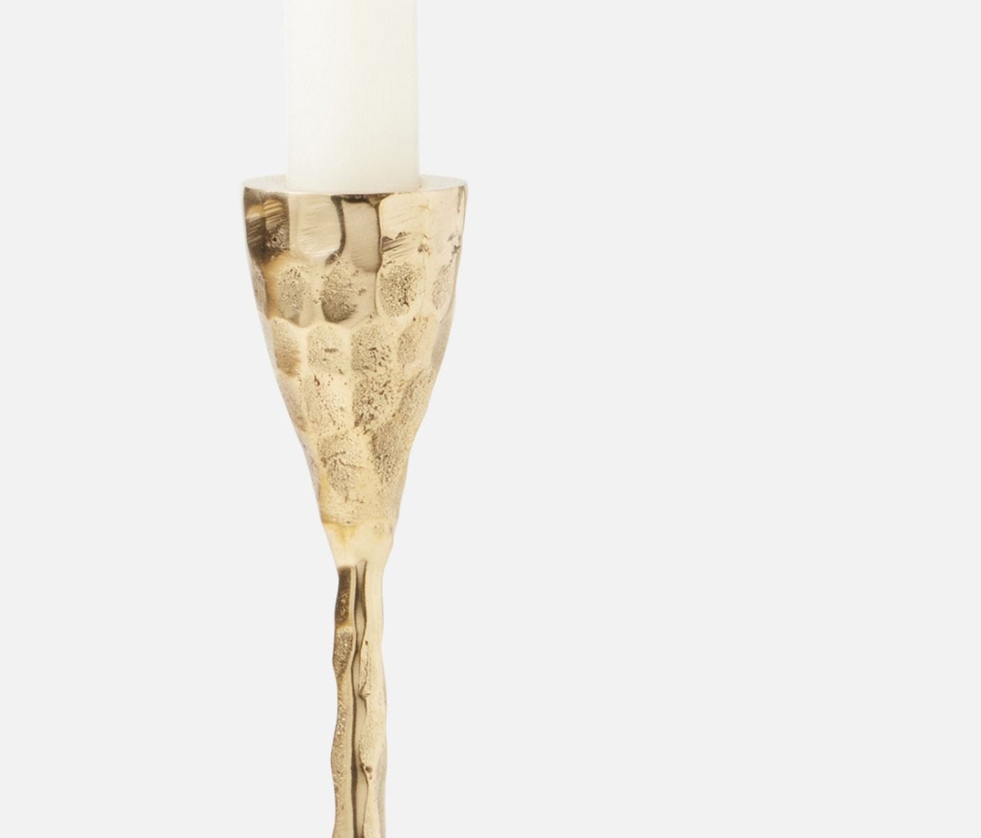 - Brass candlestick set in a gold finish. Hammered into a slender silhouette with a textured, brilliant surface