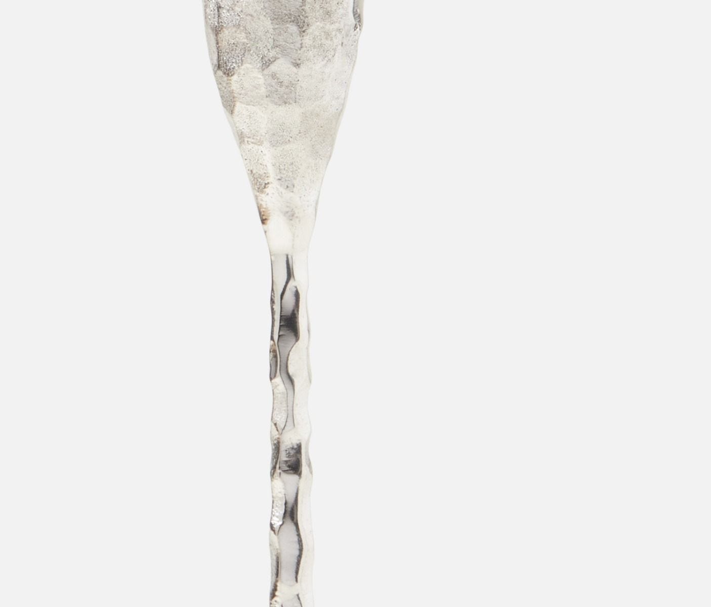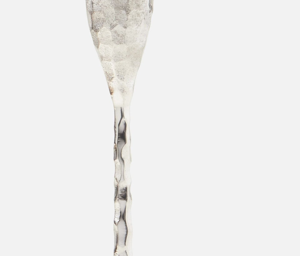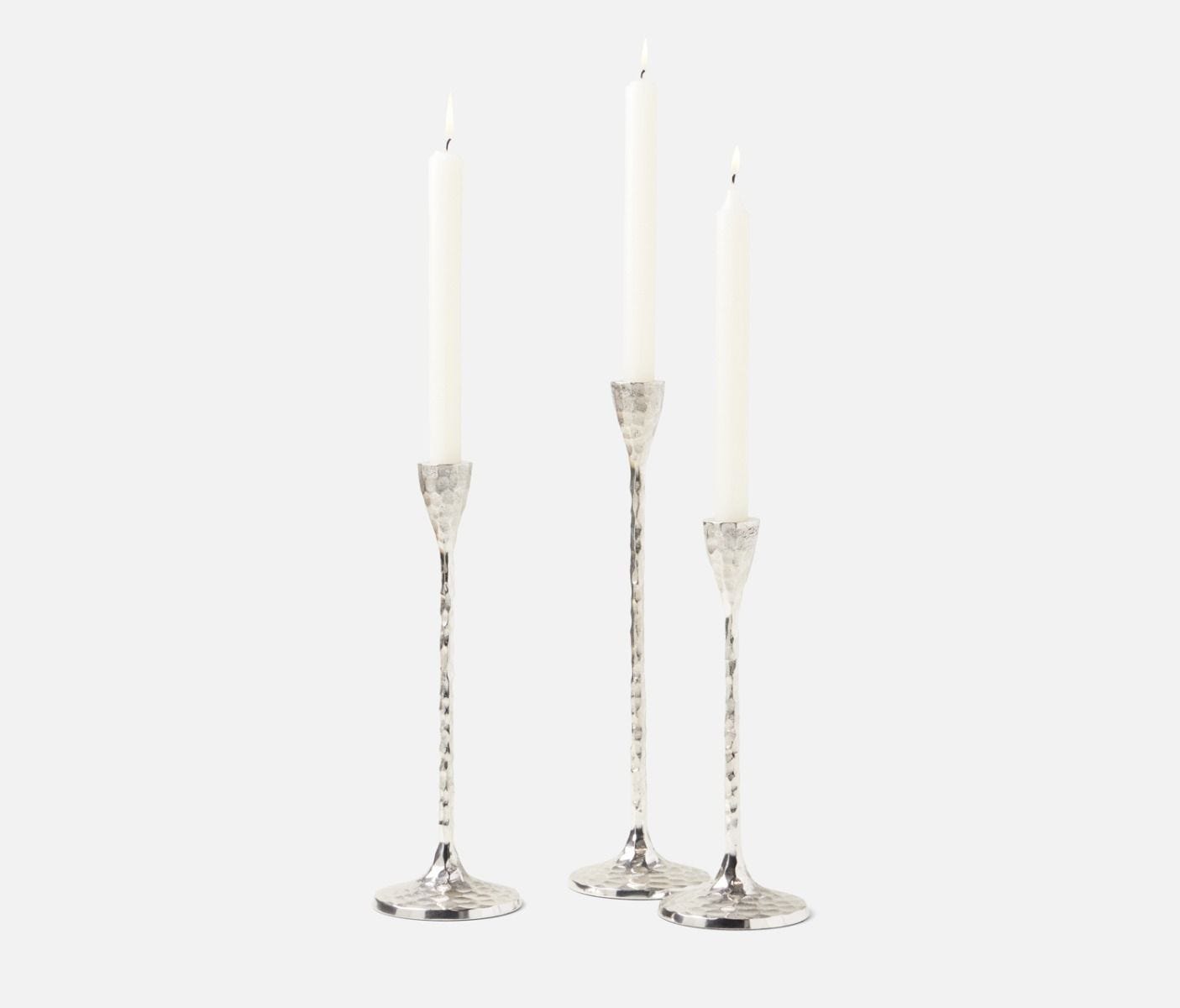 - Brass candlestick set in a silver finish. Hammered into a slender silhouette with a textured, brilliant surface