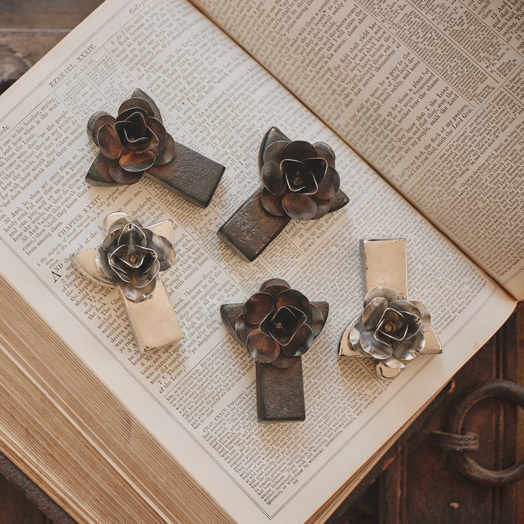 Iron or German nickel-plated hand rubbed mini iron angel with tiny rose