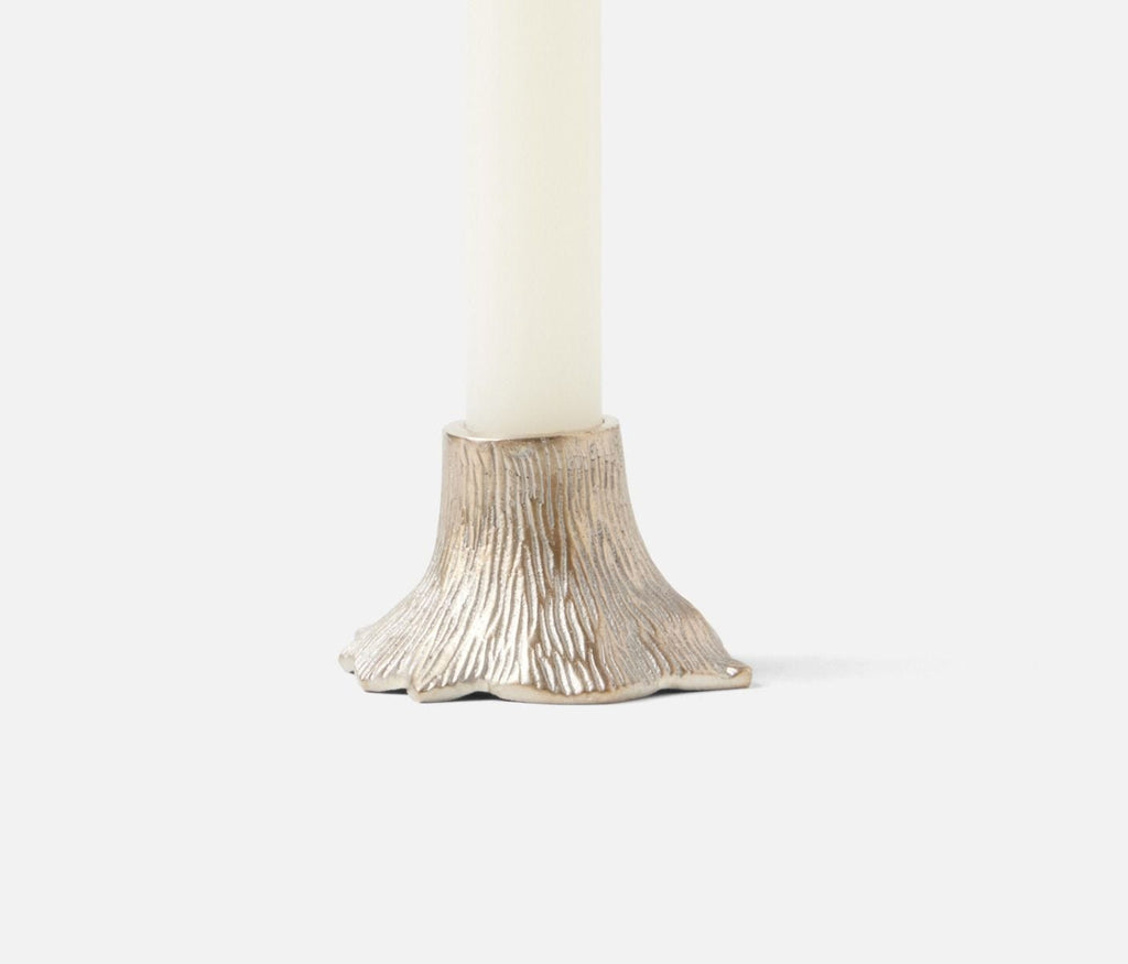 - Organically sculpted brass tree trunk candle bases in varying heights and intricate faux bois detailing finished in tarnished silver