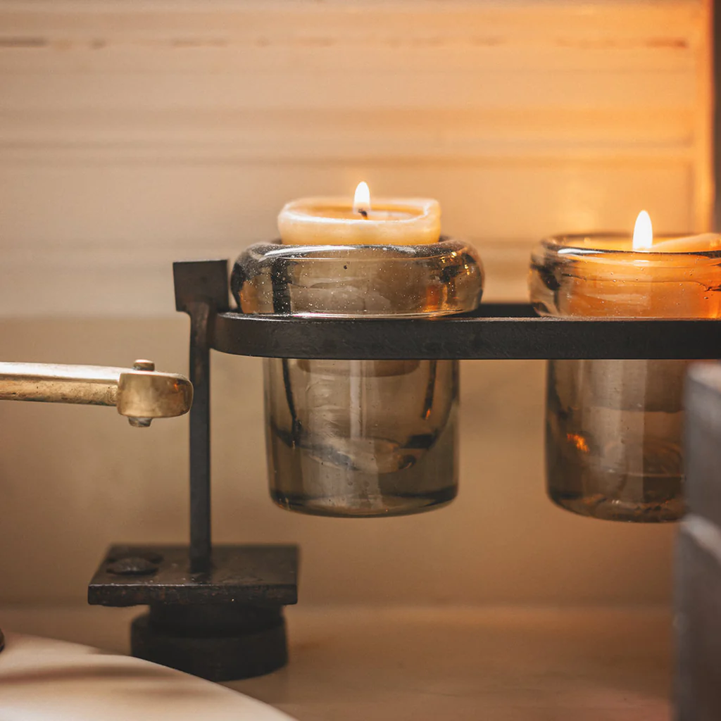 Care: Hand wash glass vessel. Clean iron stand with soft dry cloth.
