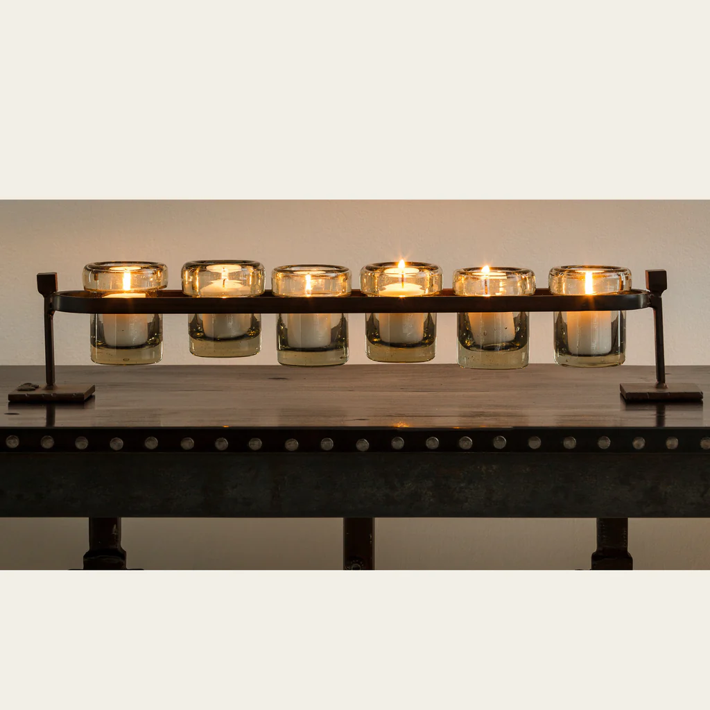 Wax cast railroad with six mouth blown glass votive holders on forged stand. Also great for small blossoms.