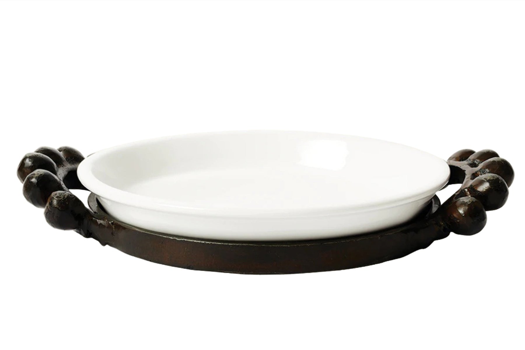 Creamy white ceramic pie plate in wax cast iron base with classic ballin detail