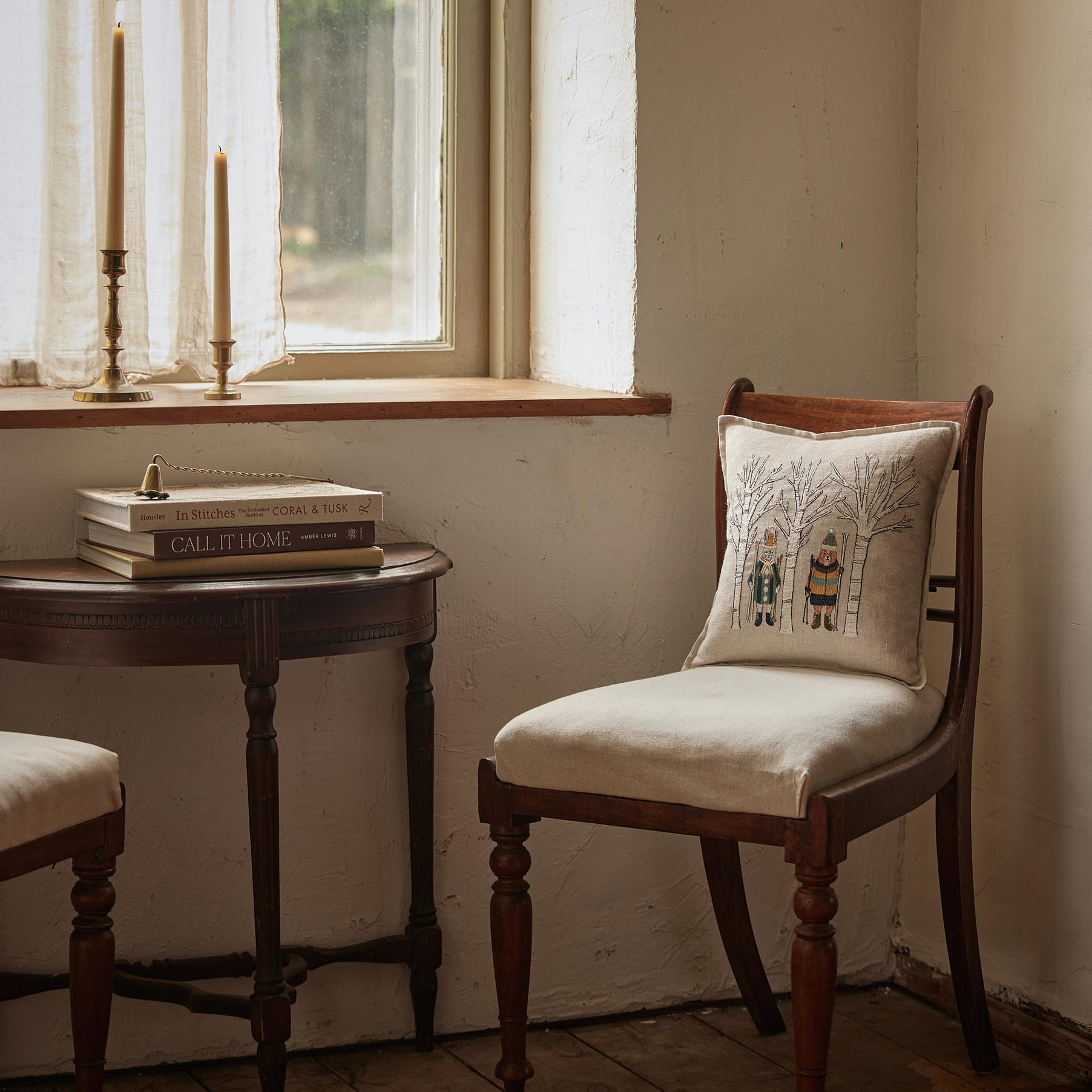 Rabbit and fox welcome winter by heading out to the ski slopes! The two ski buddies pose among the aspens in brightly embroidered parkas and cozy hats before riding the gondola to the top of the mountain. Pair with our Winter Fun pillow and Gondola pocket pillow.