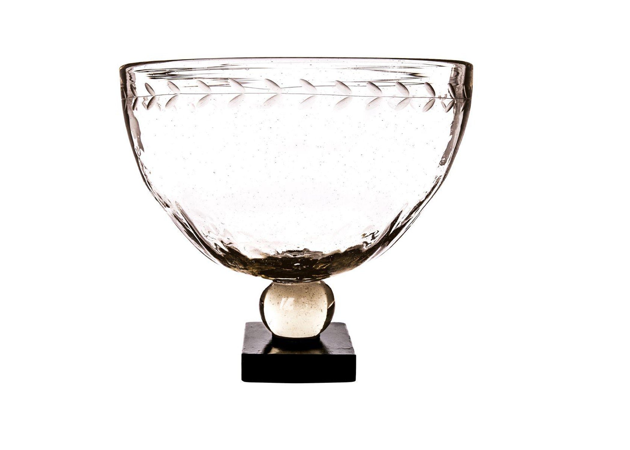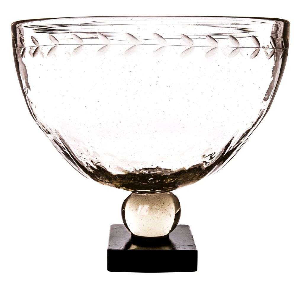 Mouth blown glass bowl with laurel pattern hand engraving on iron stand