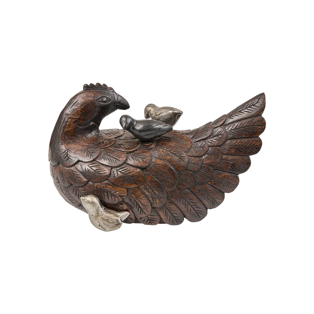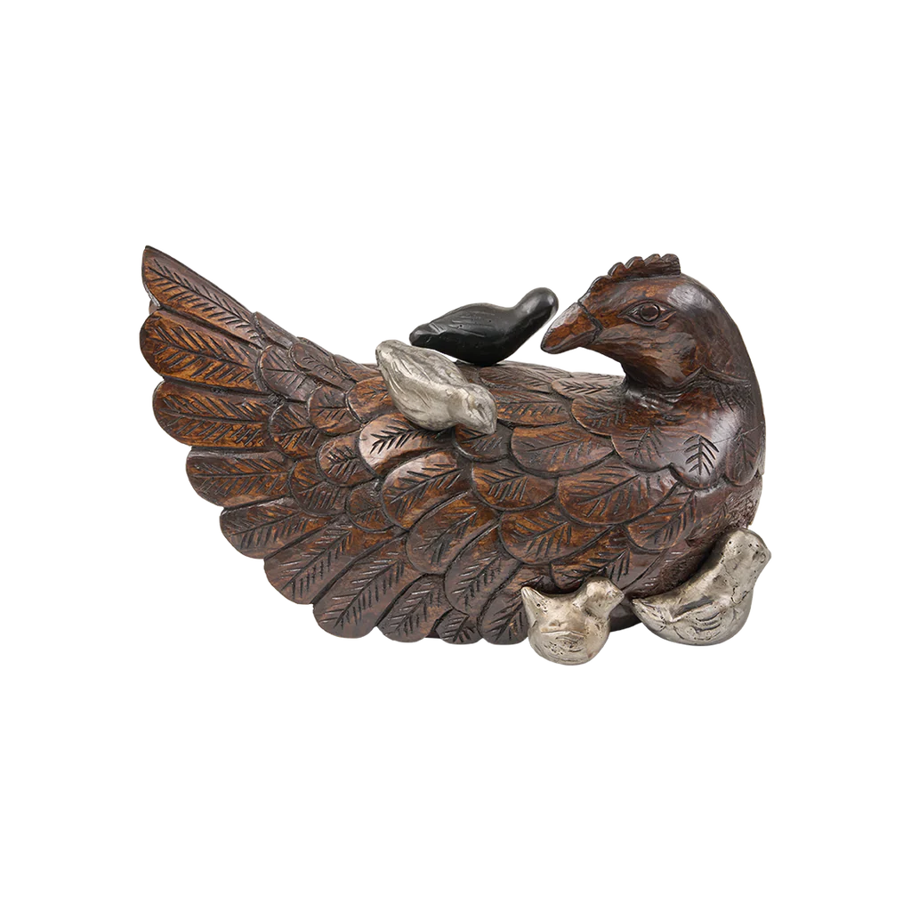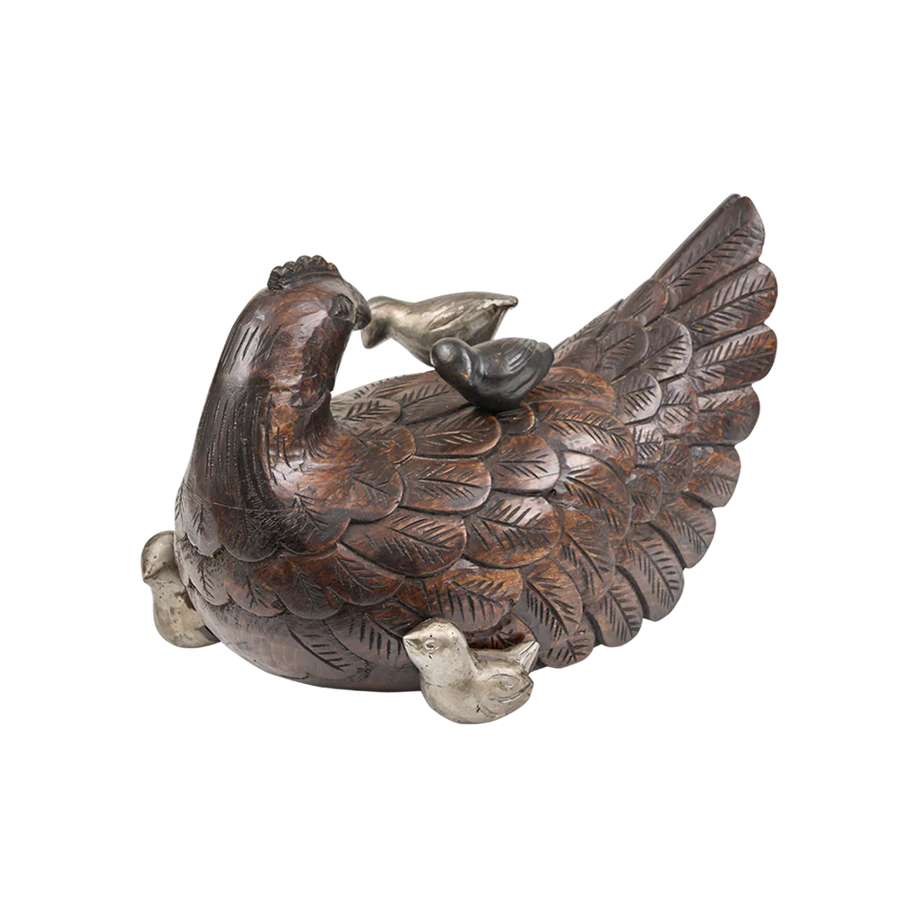 Beautifully hand carved wooden mother hen with cast iron baby chicks…a true collector's item