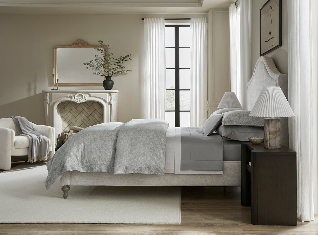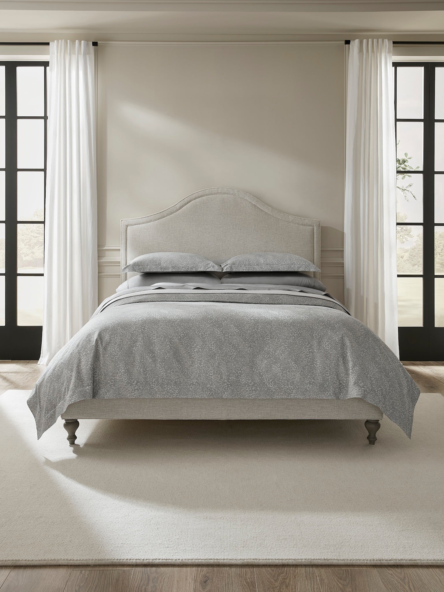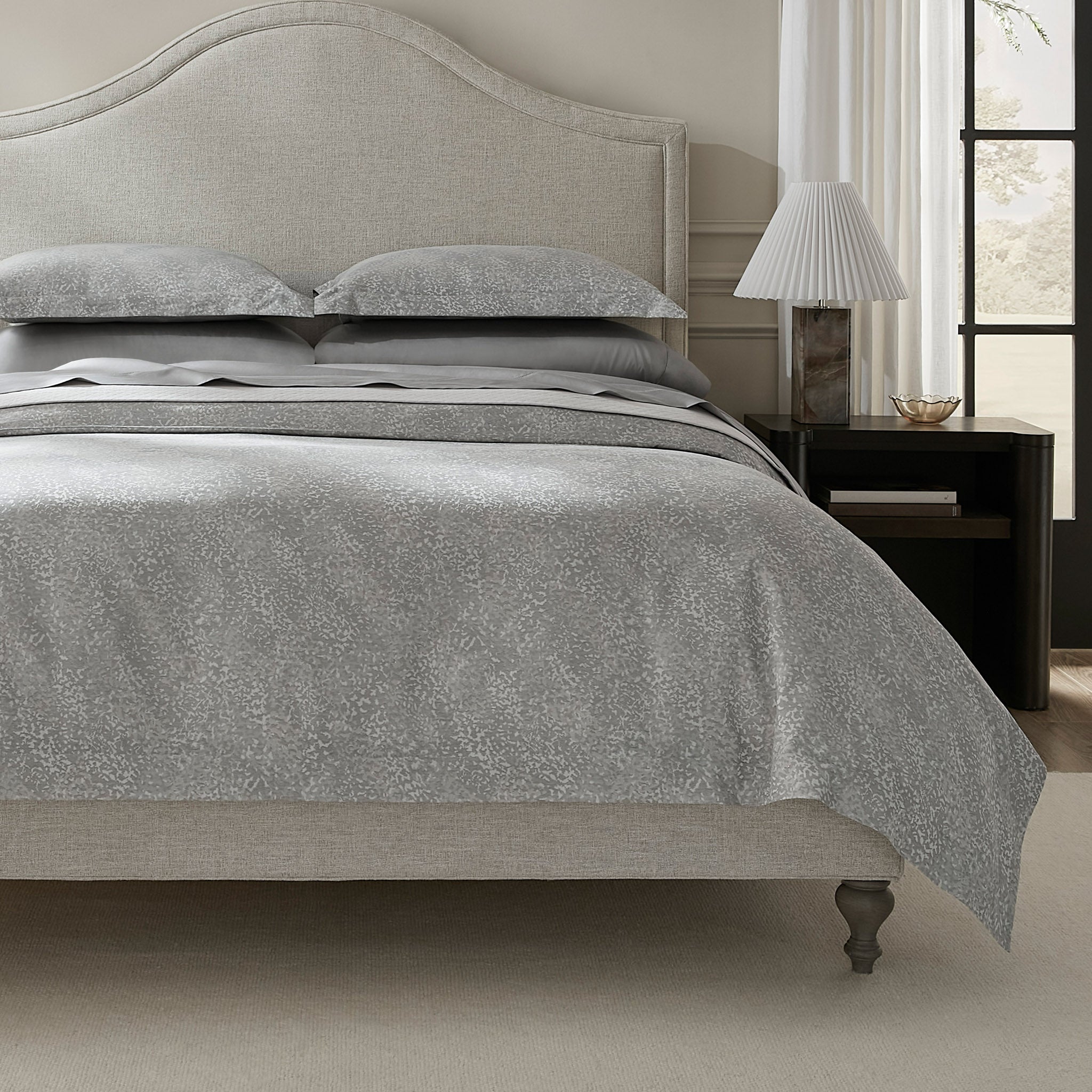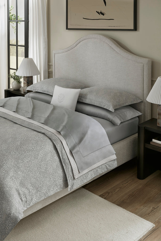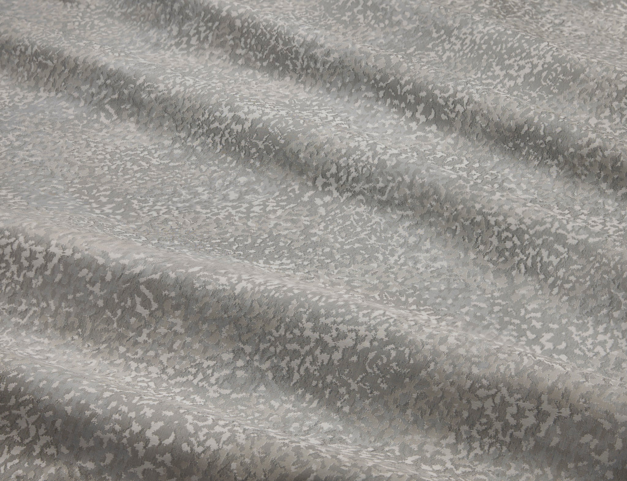 - Yarn-dyed sateen jacquard with a rich textural pattern that gracefully unfolds across an elegant palette of slate blue, taupe, and grey.