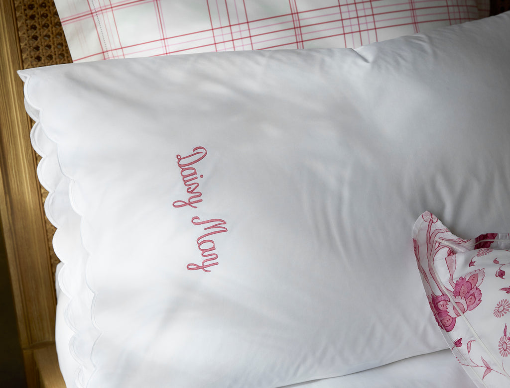 A charming classic colorful embroidered scallop edge applied to crisp white Ceylon percale sheeting with effortless charm