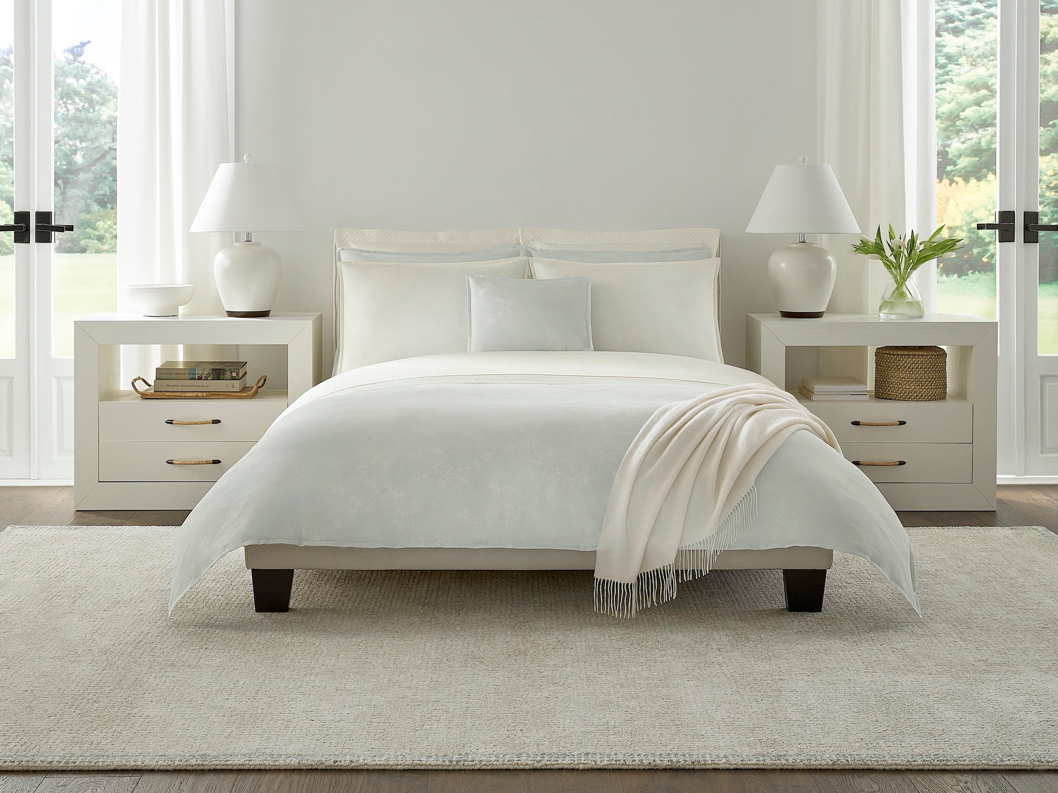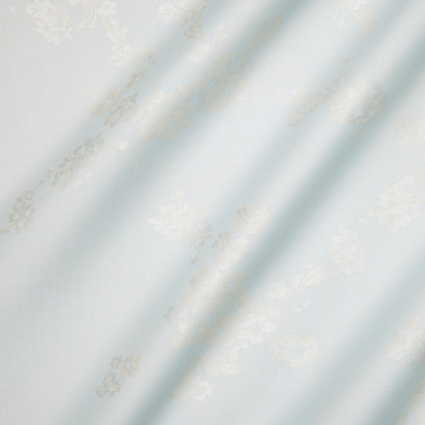 - Soft white blooms are woven across a light blue sateen base for peaceful springtime serenity