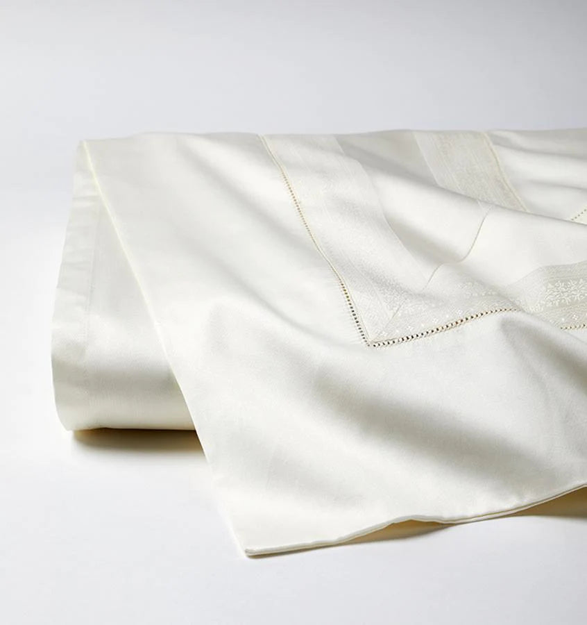 • Luxurious and opulent. Intricate jacquard appliqué nestled between two rows of precise hemstitching, creating a refined border.