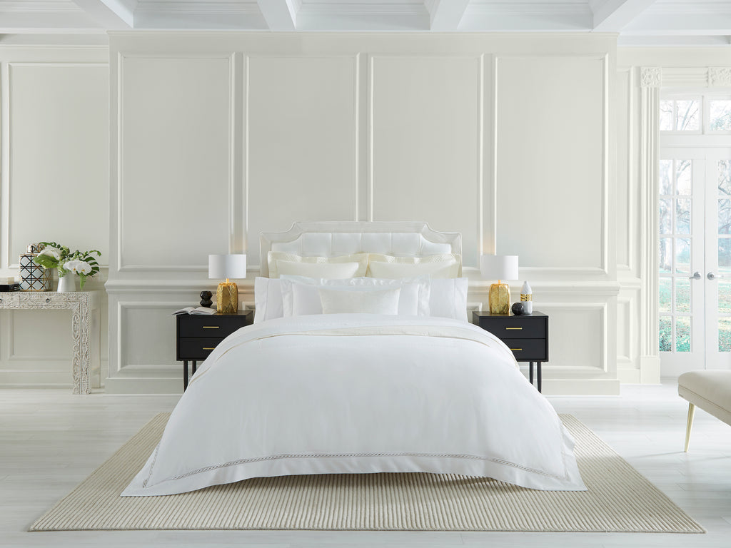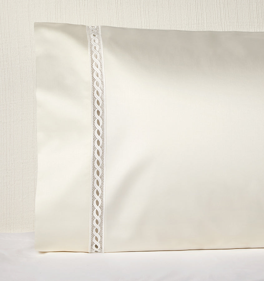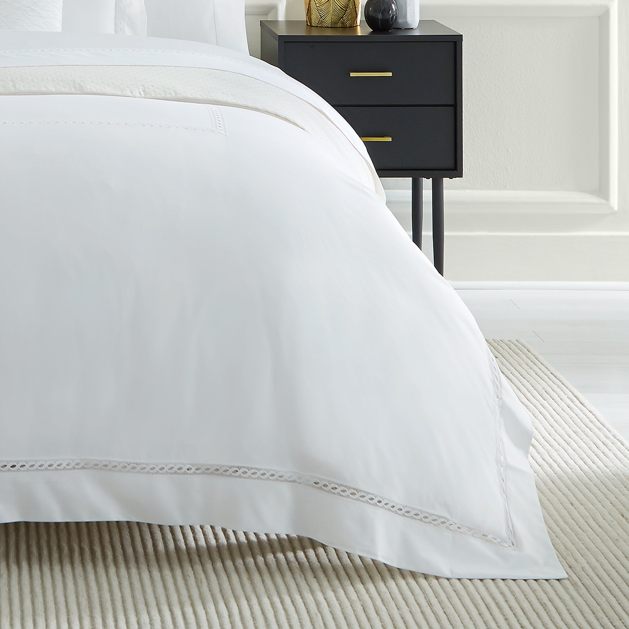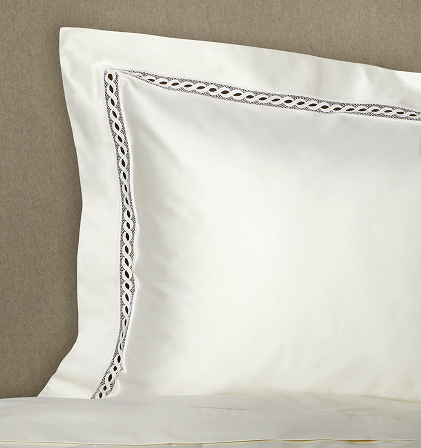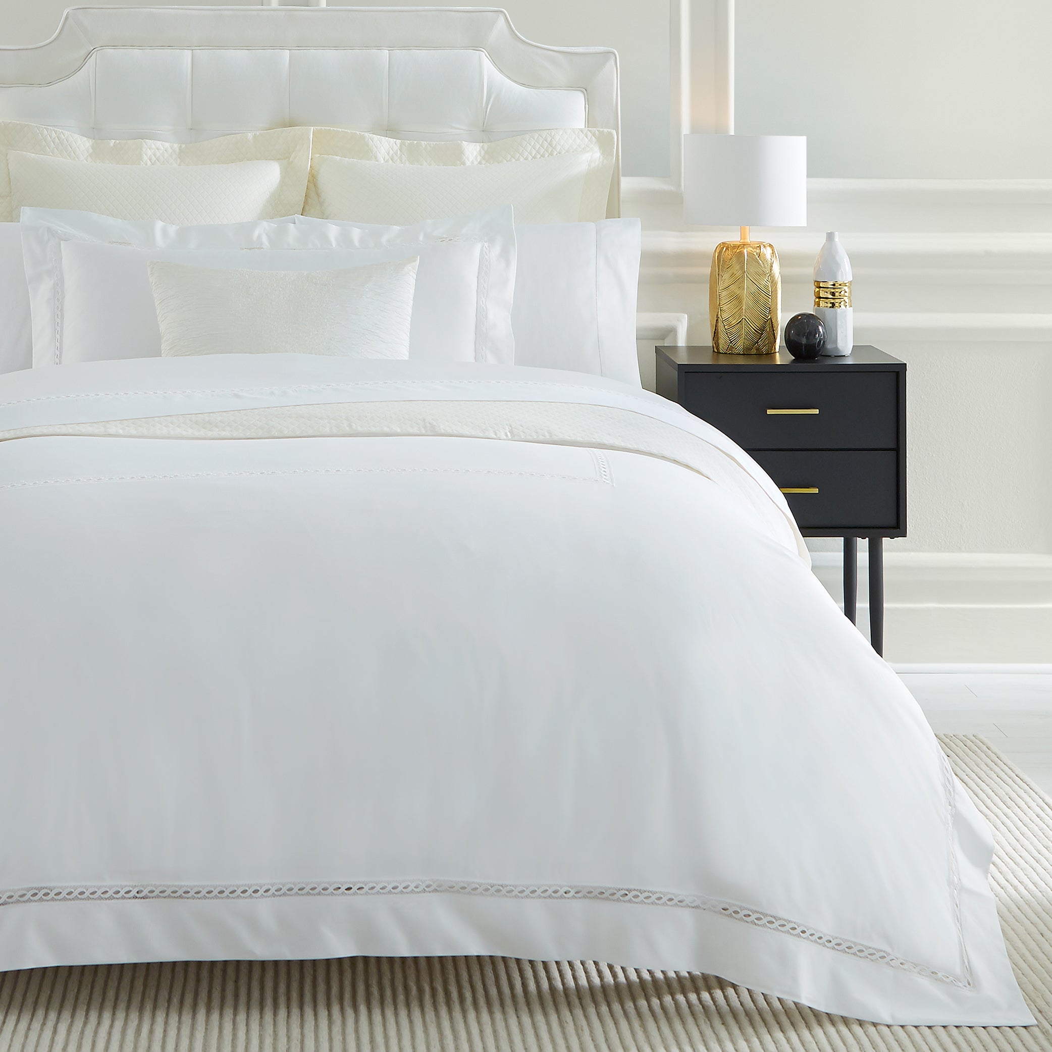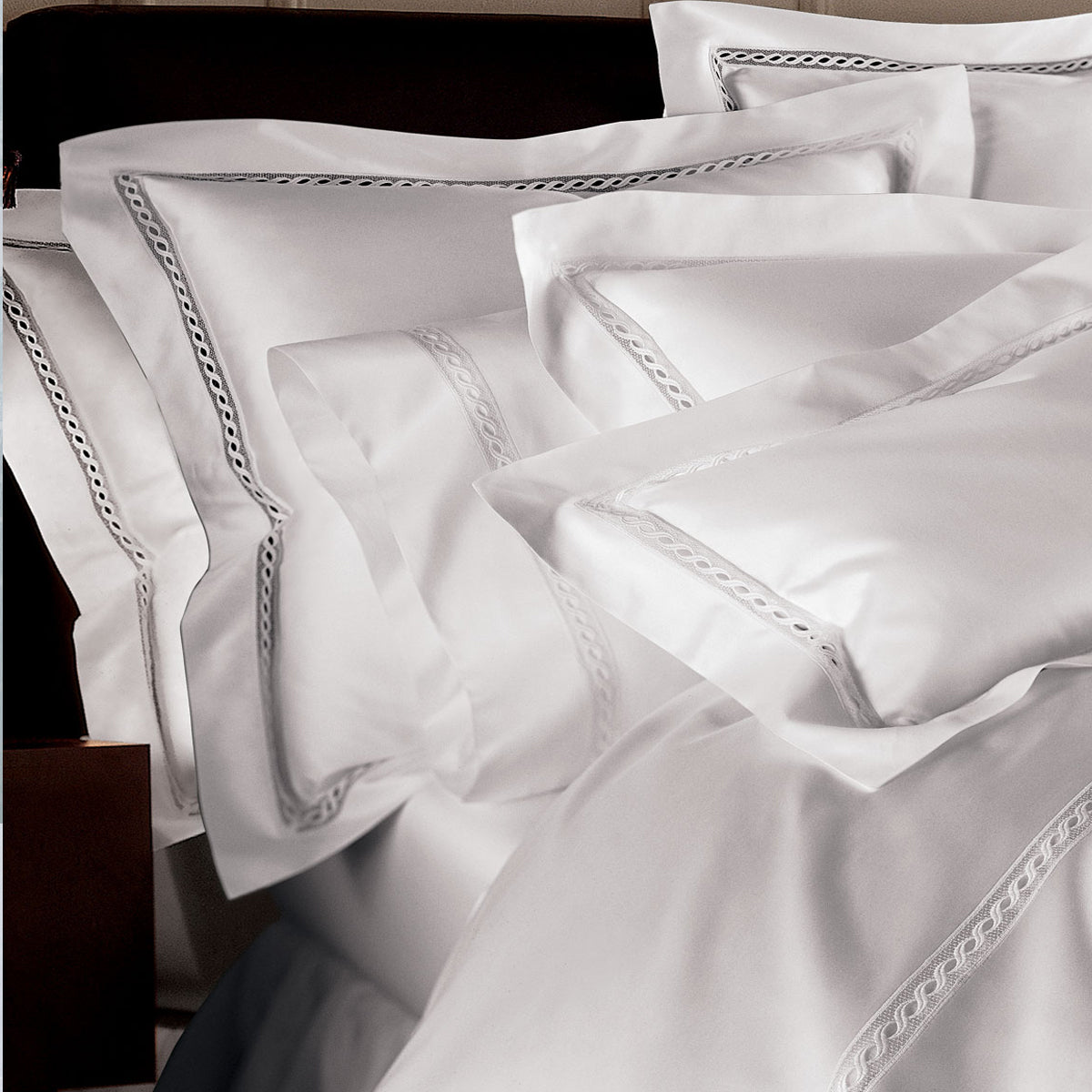 - Densely woven to a rich polished sateen, with a supple, luminous and soft hand. Accented with an Italian lace inset border with a classic chain design.