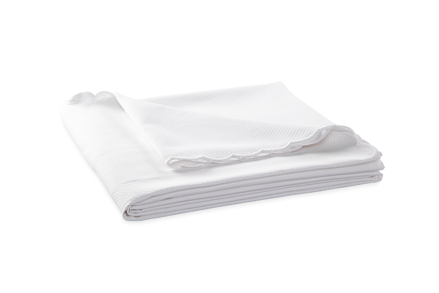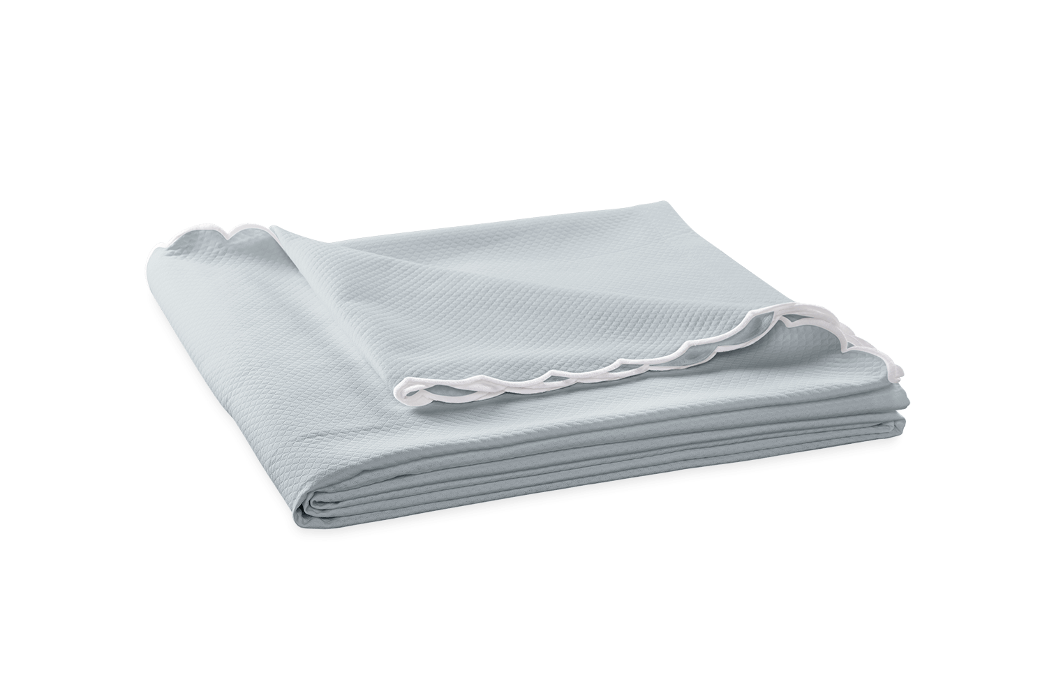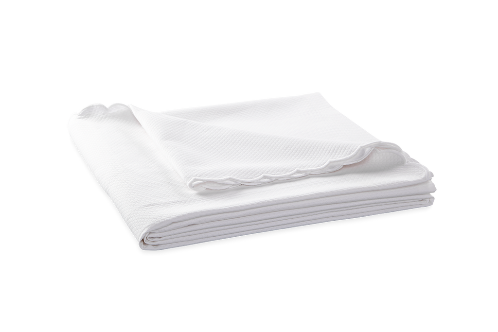 Matouk's diamond-patterned pique in easy-care fabric comes in an array of colors and is finished with a white, embroidered scalloped edge