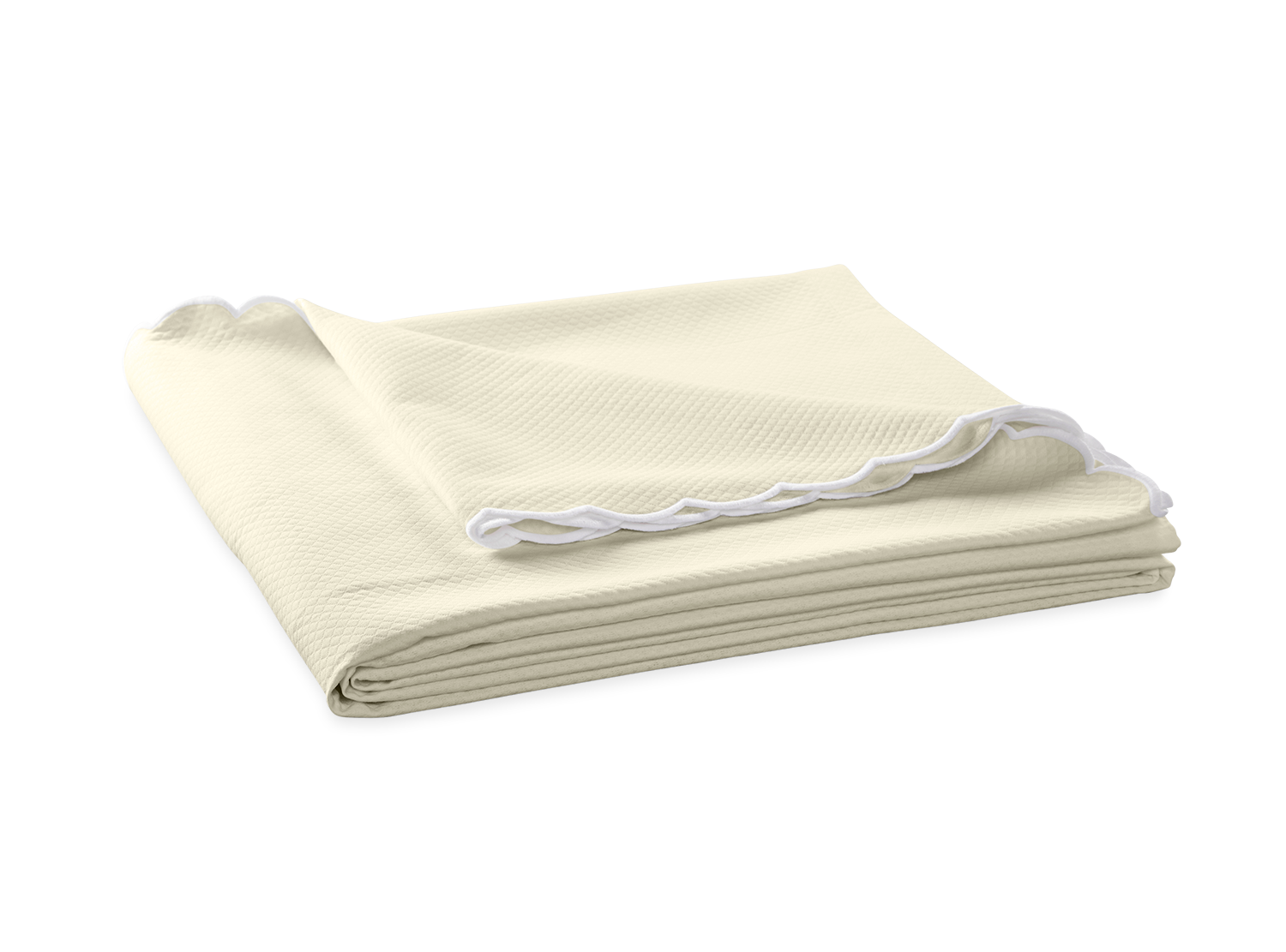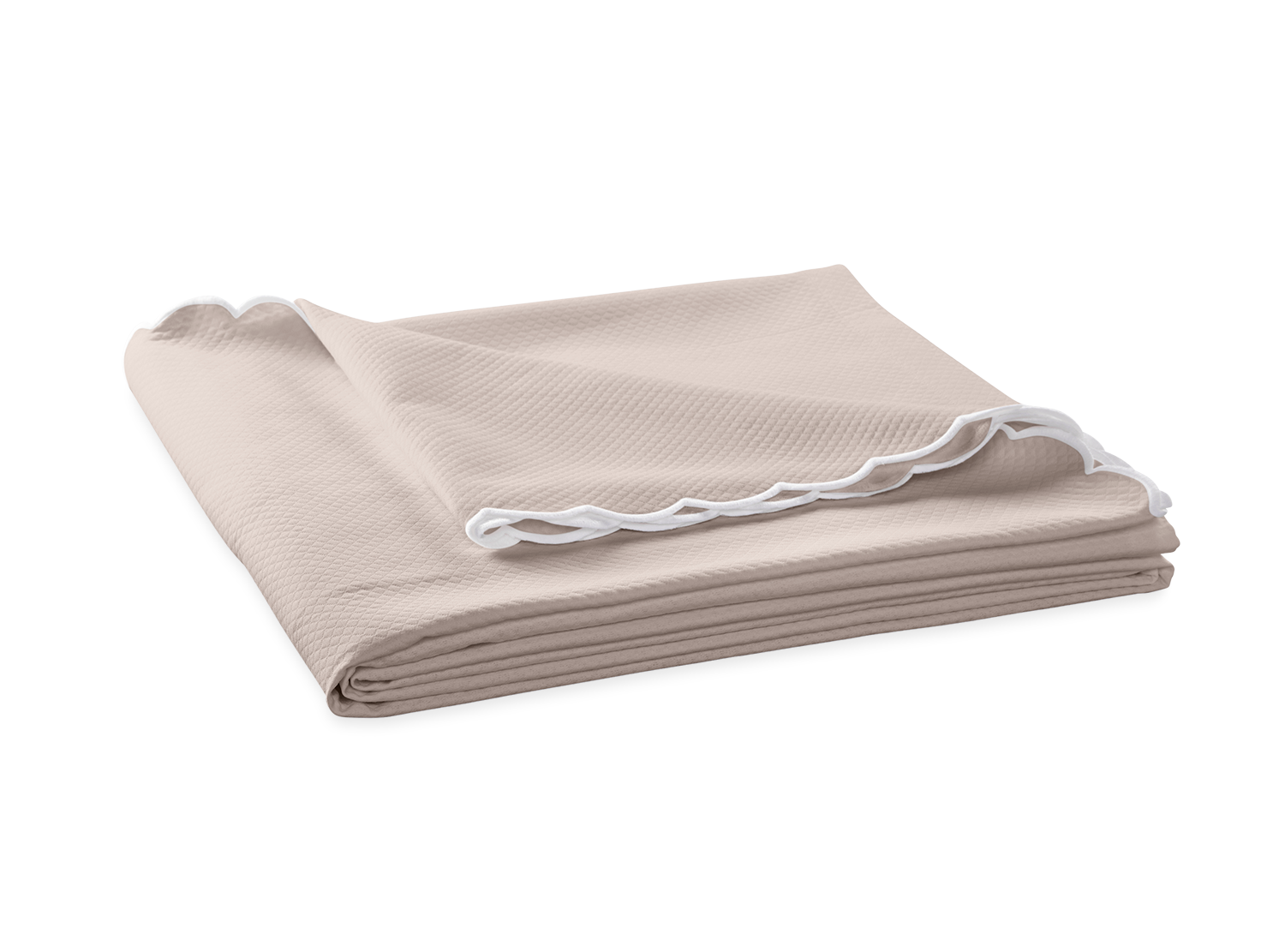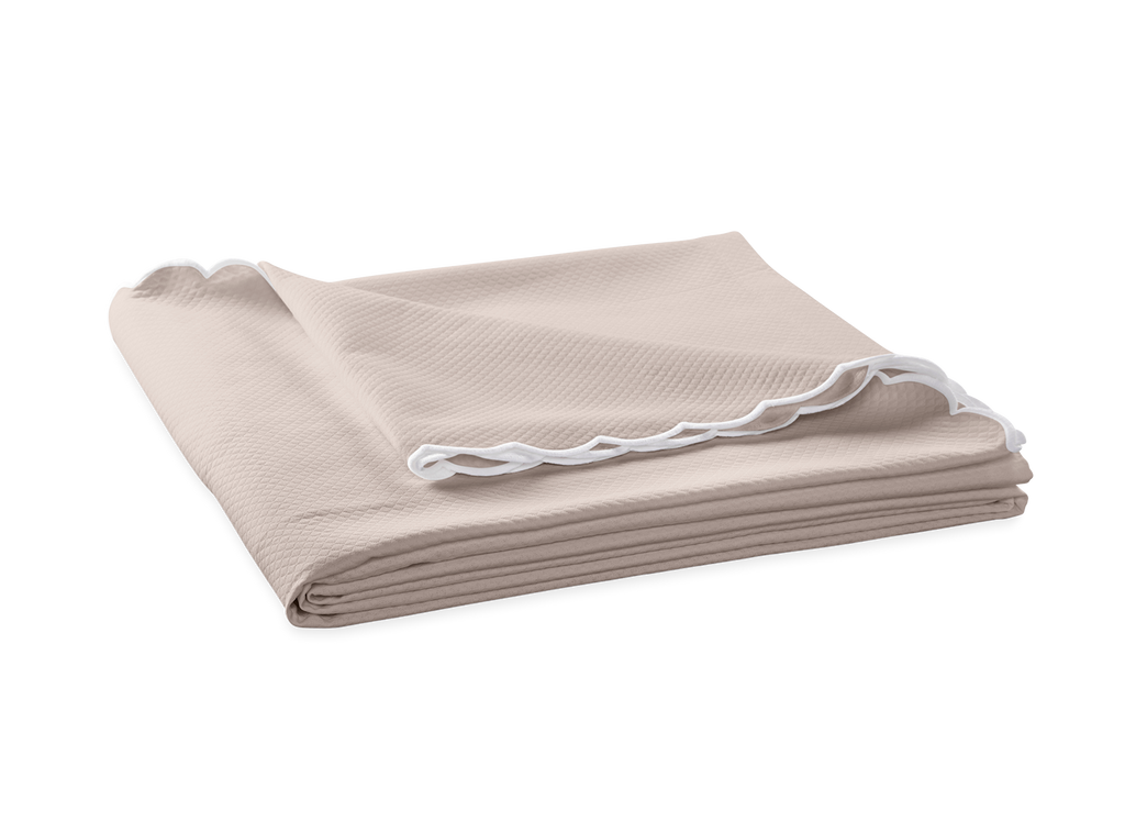 Matouk's diamond-patterned pique in easy-care fabric comes in an array of colors and is finished with a white, embroidered scalloped edge