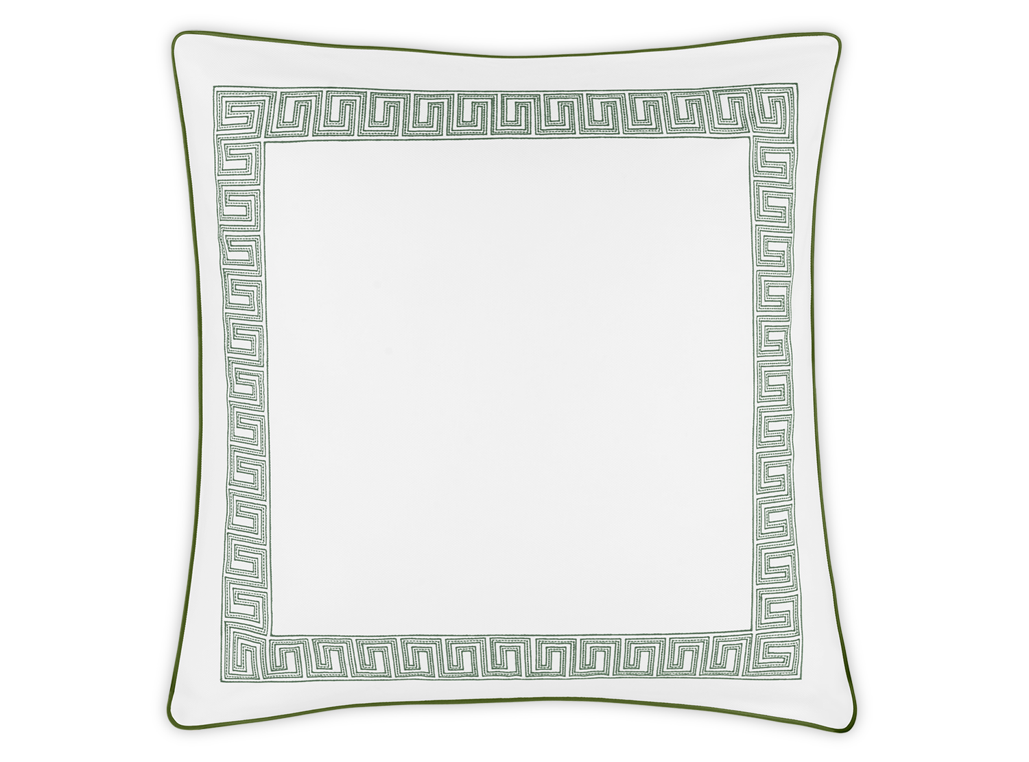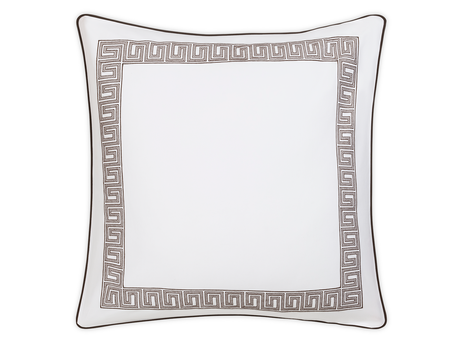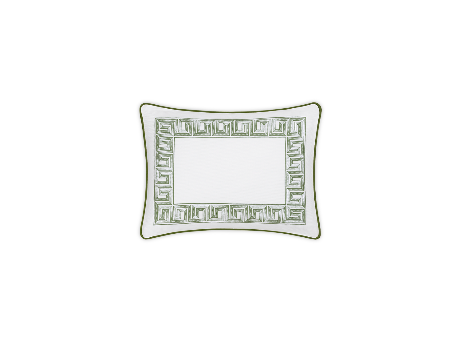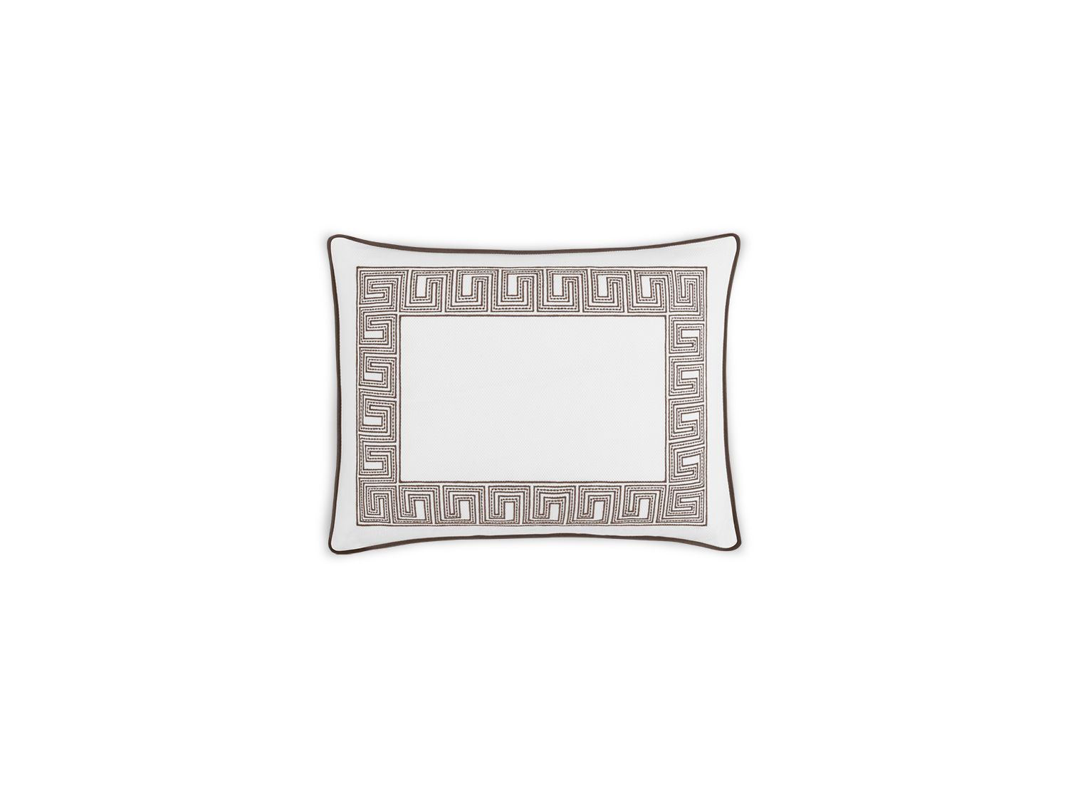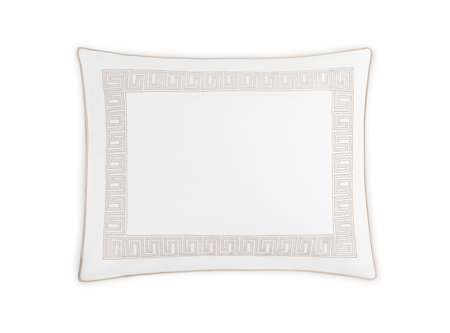 Inspired by an intricately beaded Schumacher tape, Matouk's boldly embroidered Ophelia collection embodies a traditional Greek key pattern with a bespoke sensibility. Now available on Matouk's signature Camilla Pique with a coordinating corded edge in Nocturne sateen, it’s a playful, exuberant take on a traditional motif.