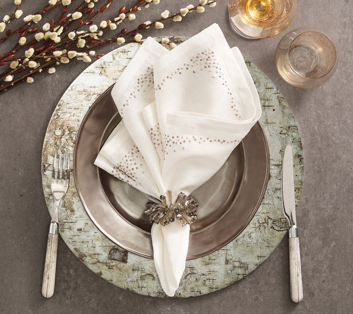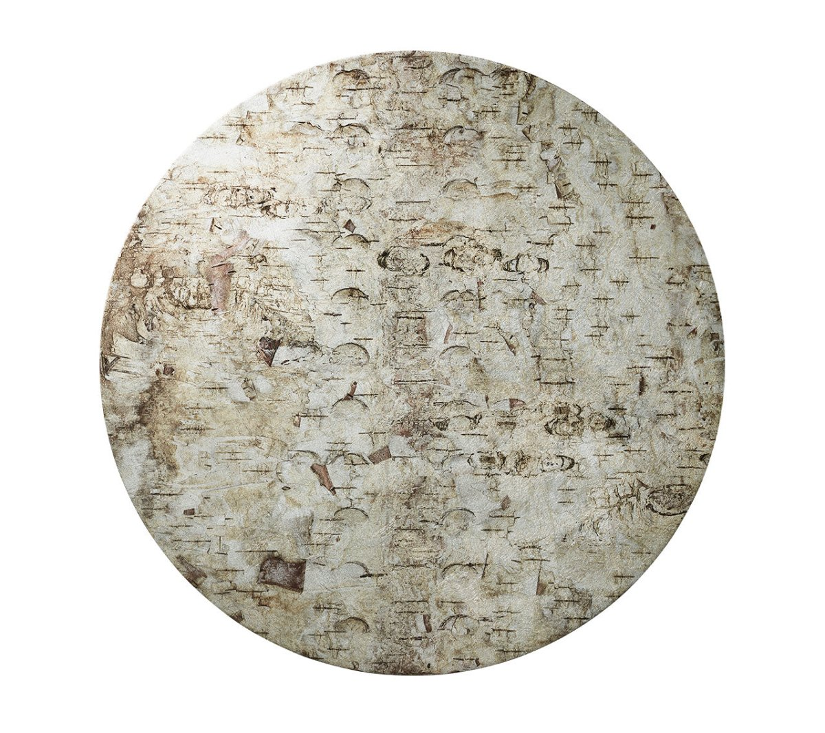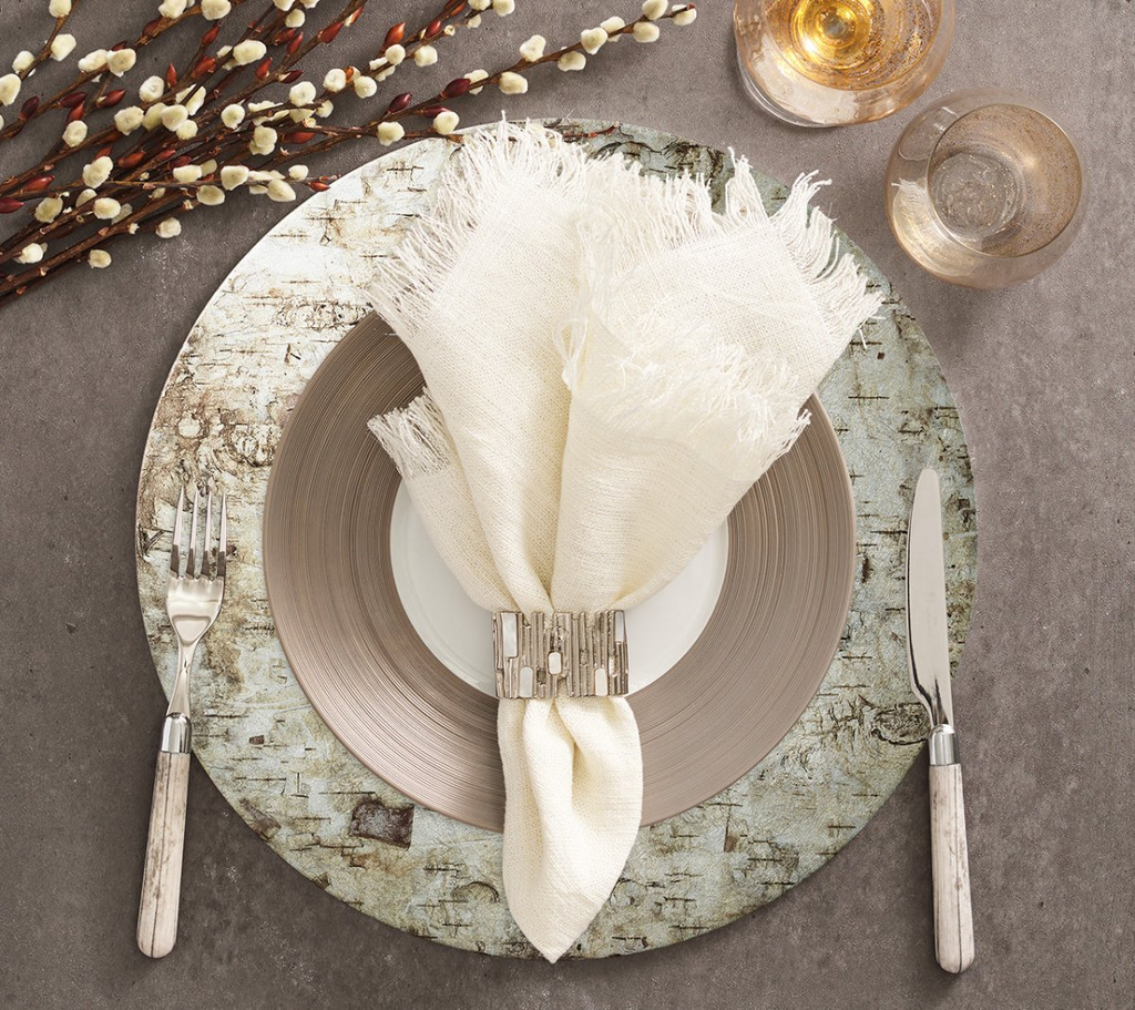 Rustic sophistication. The Chalet Placemat features a photo of birch bark transferred onto a silver foil lacquered surface. Foiling imparts a shimmer, elevating this nature inspired placemat.