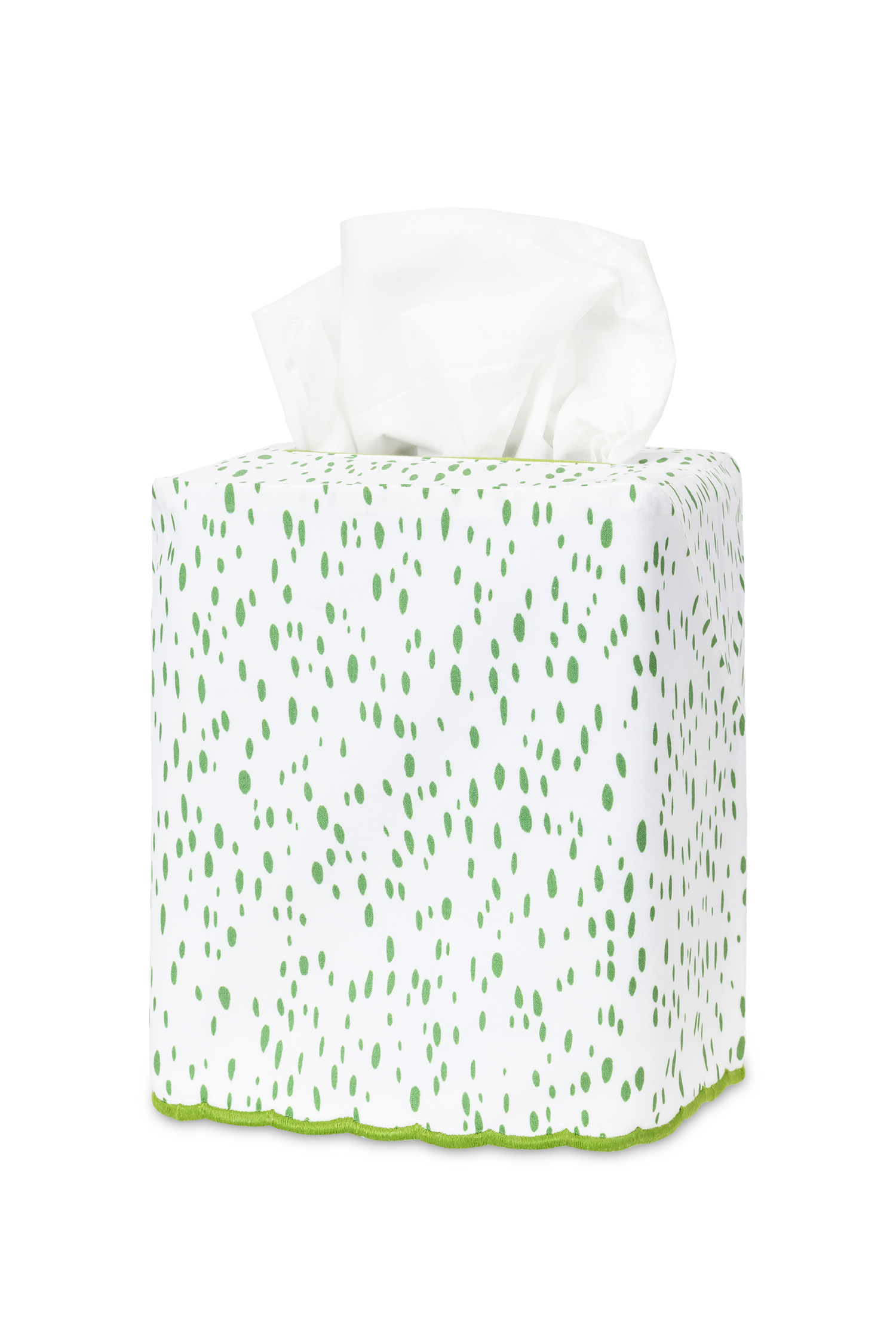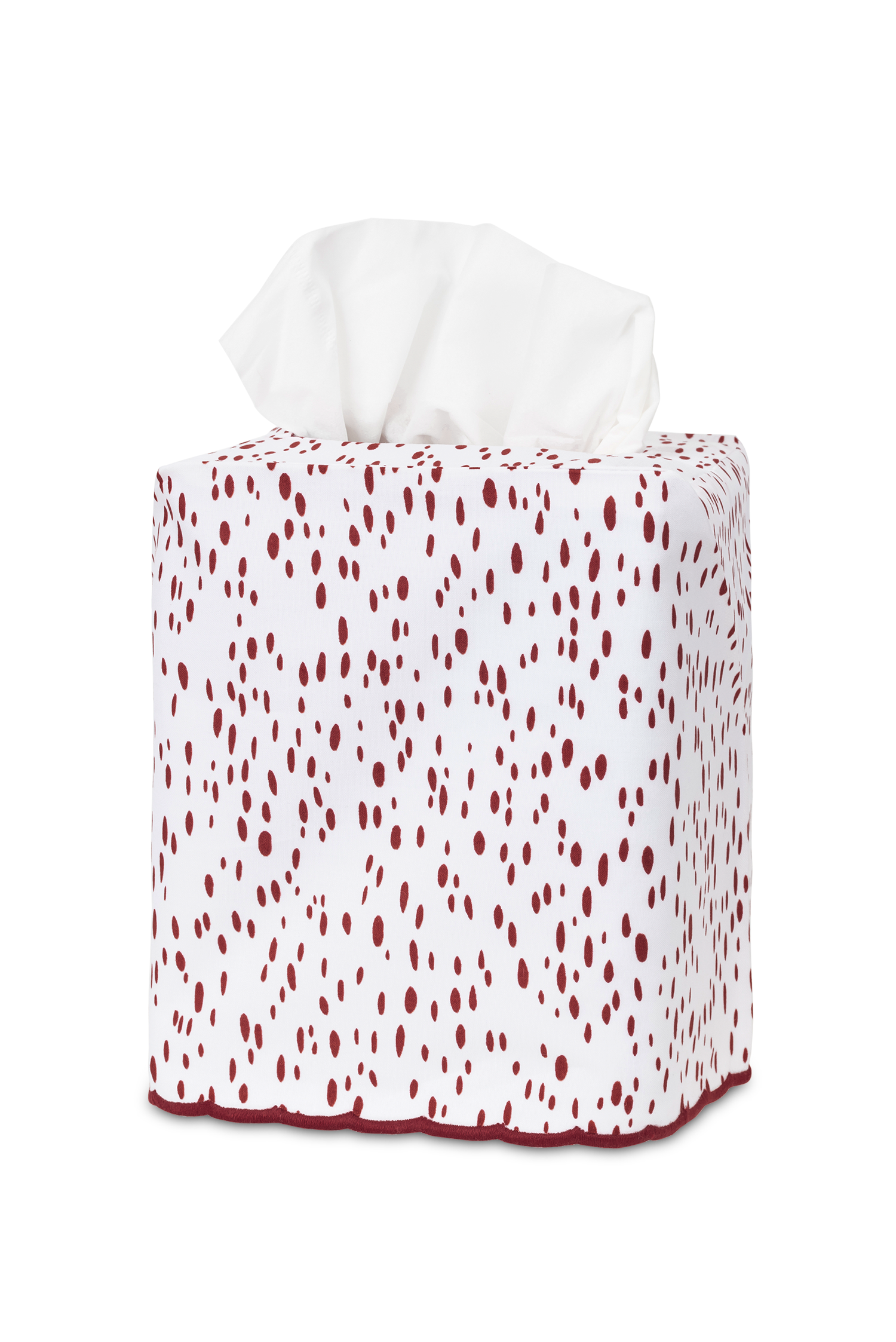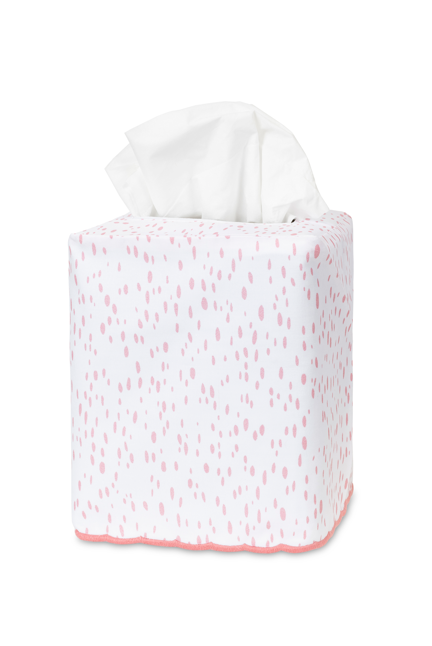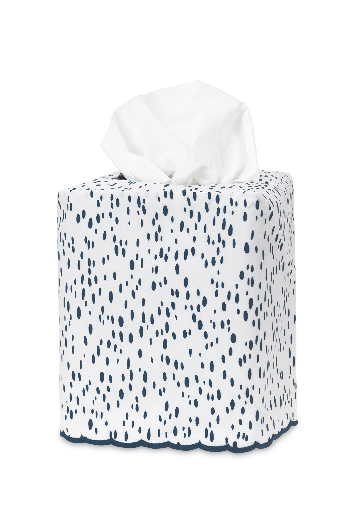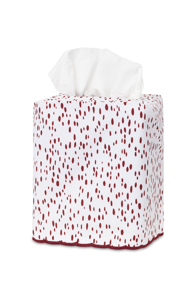- Tissue box cover with printed painterly dot pattern on white cotton with embroidered scalloped edge finish