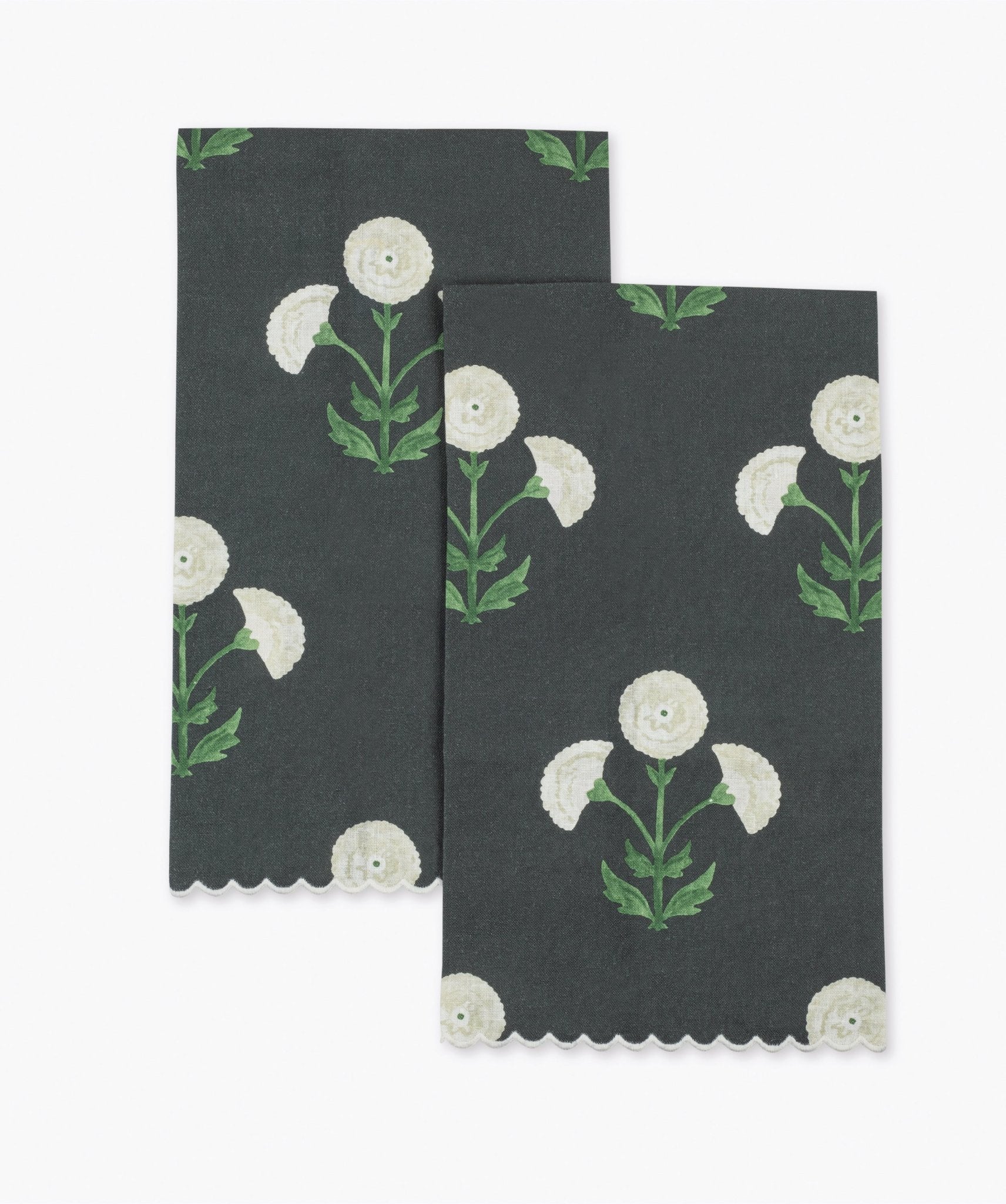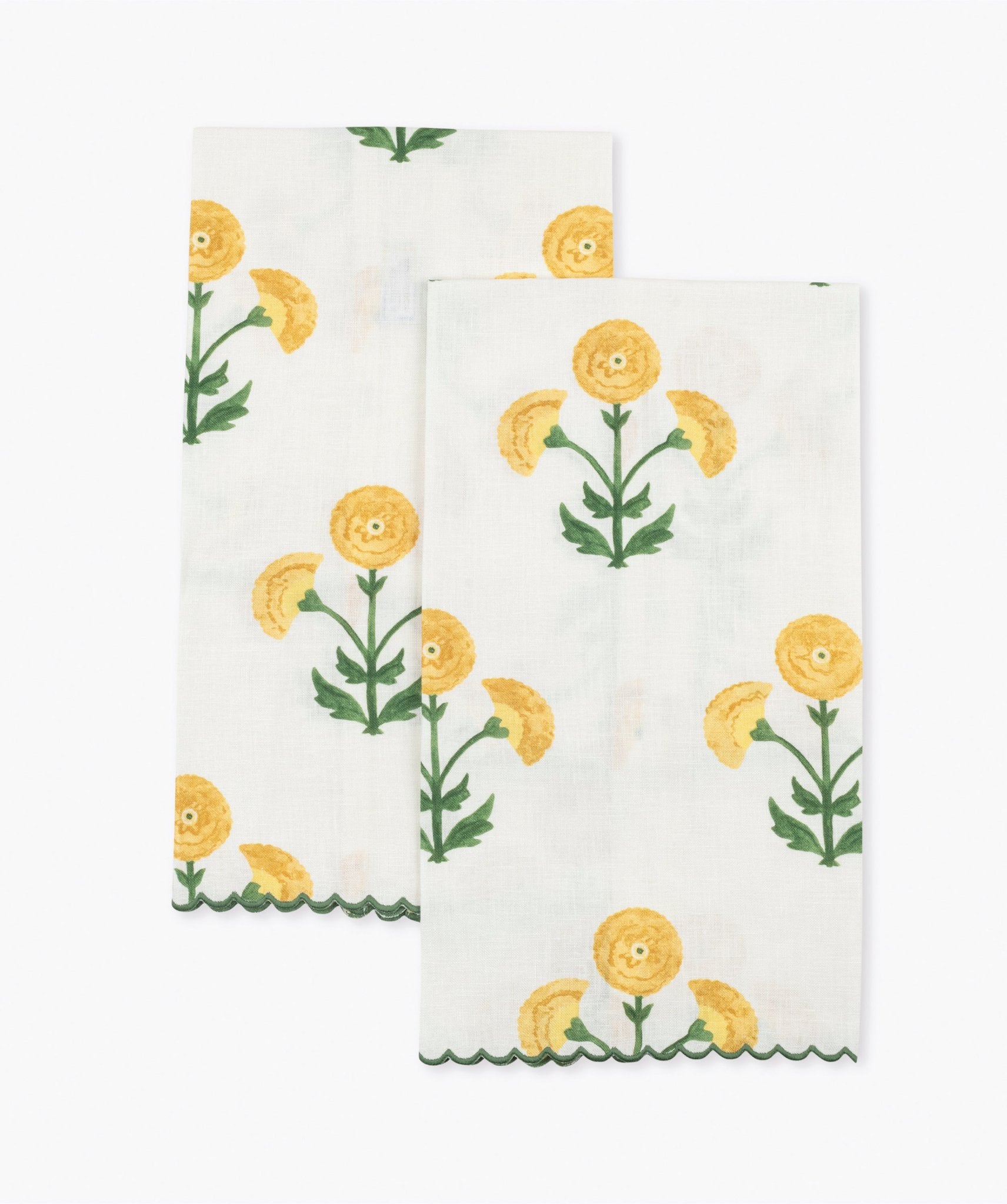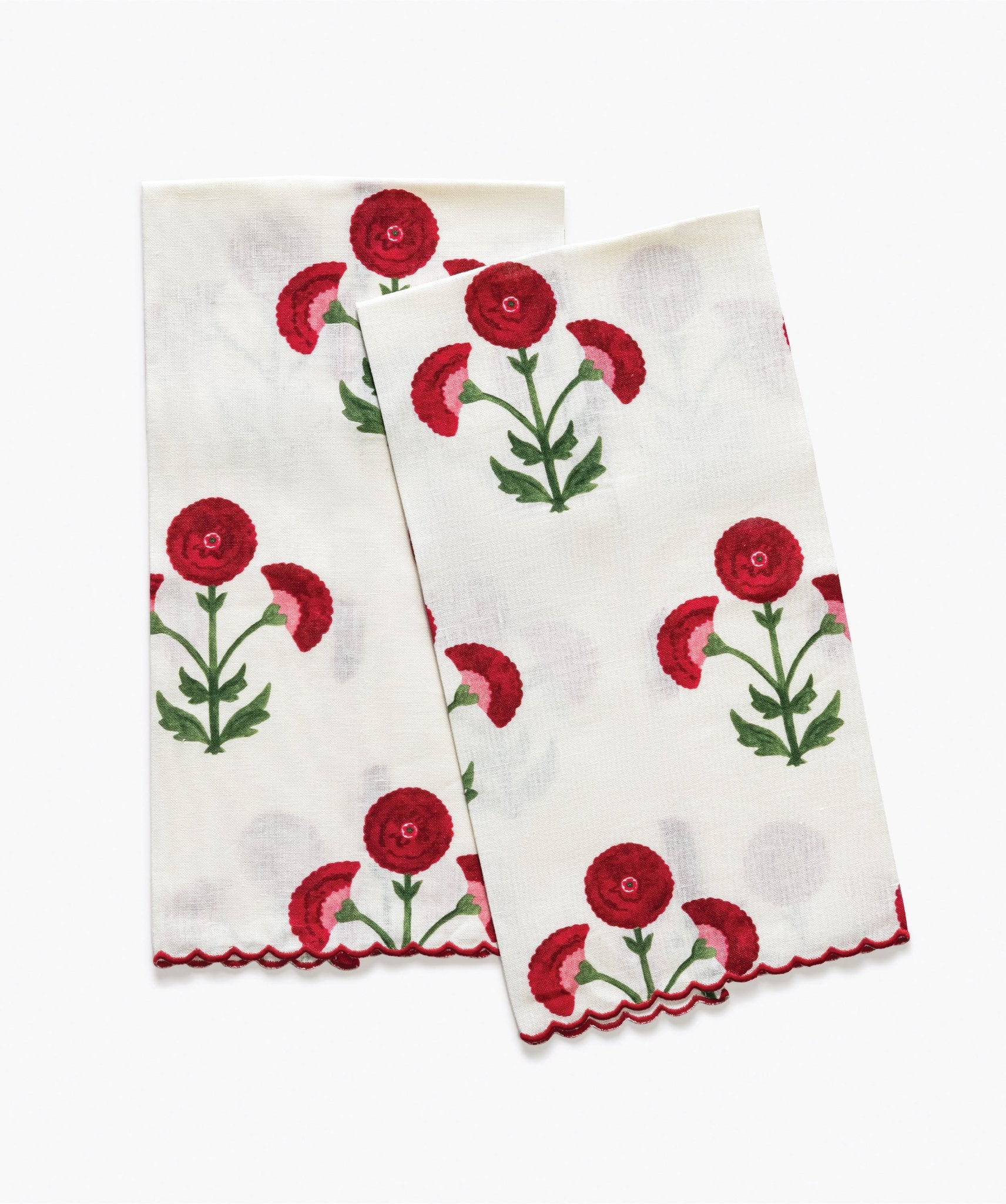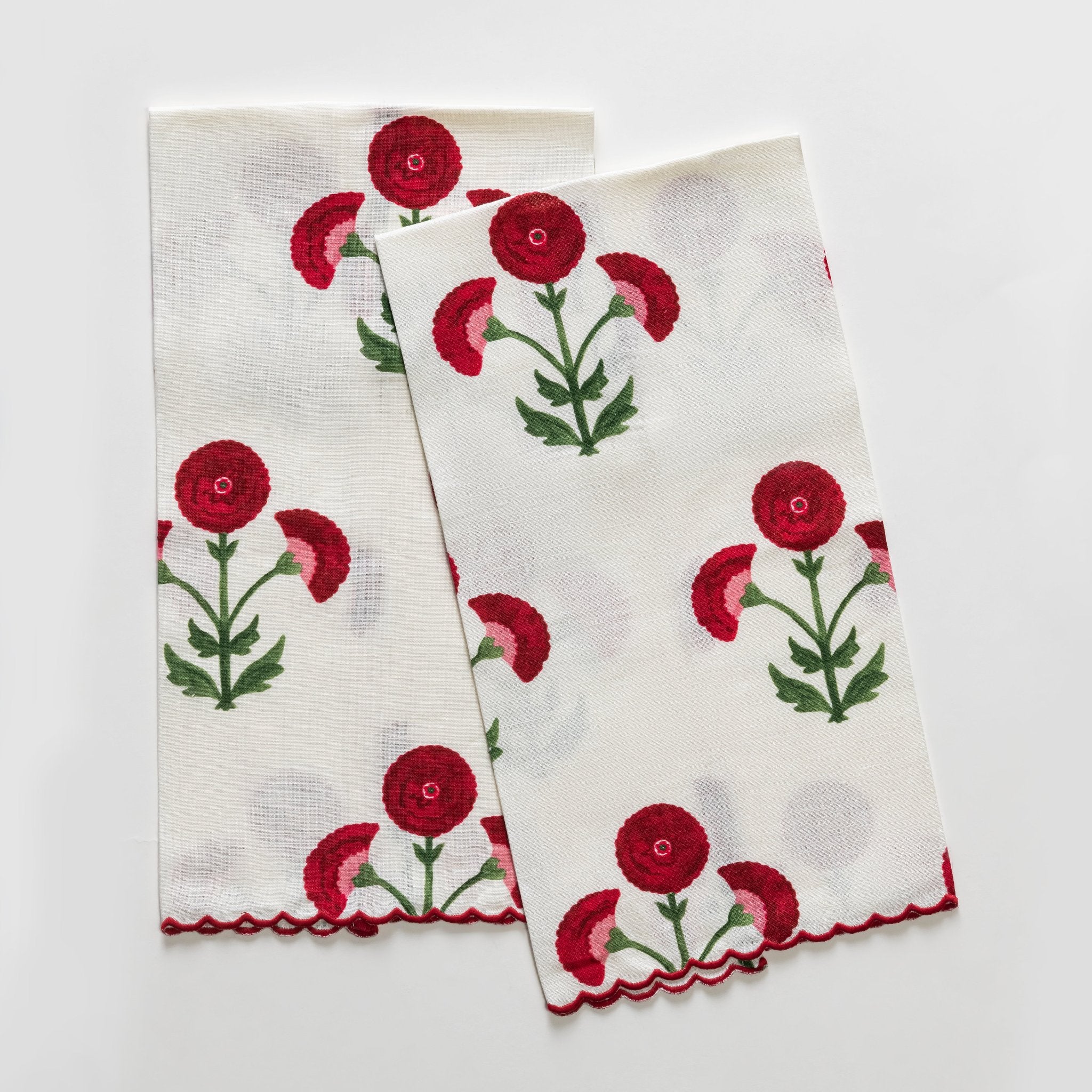 Whimsical and sophisticated. Gisele Guest Towels adds character and delight to the bathroom with beautiful bold color and artistic design. Originally a Schumacher block print, Matouk has reimagined the print on 100% linen that is finished with an intricate embroidered petite scallop.