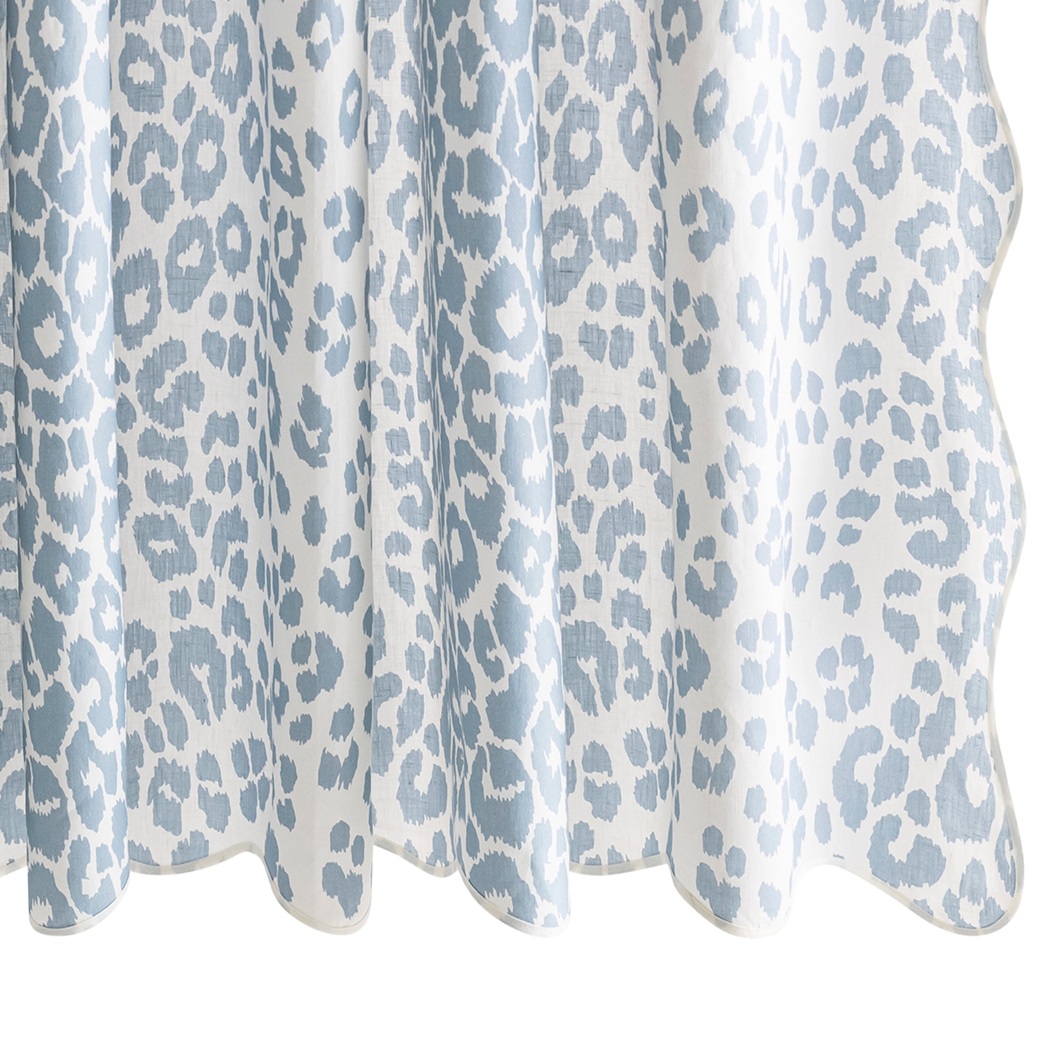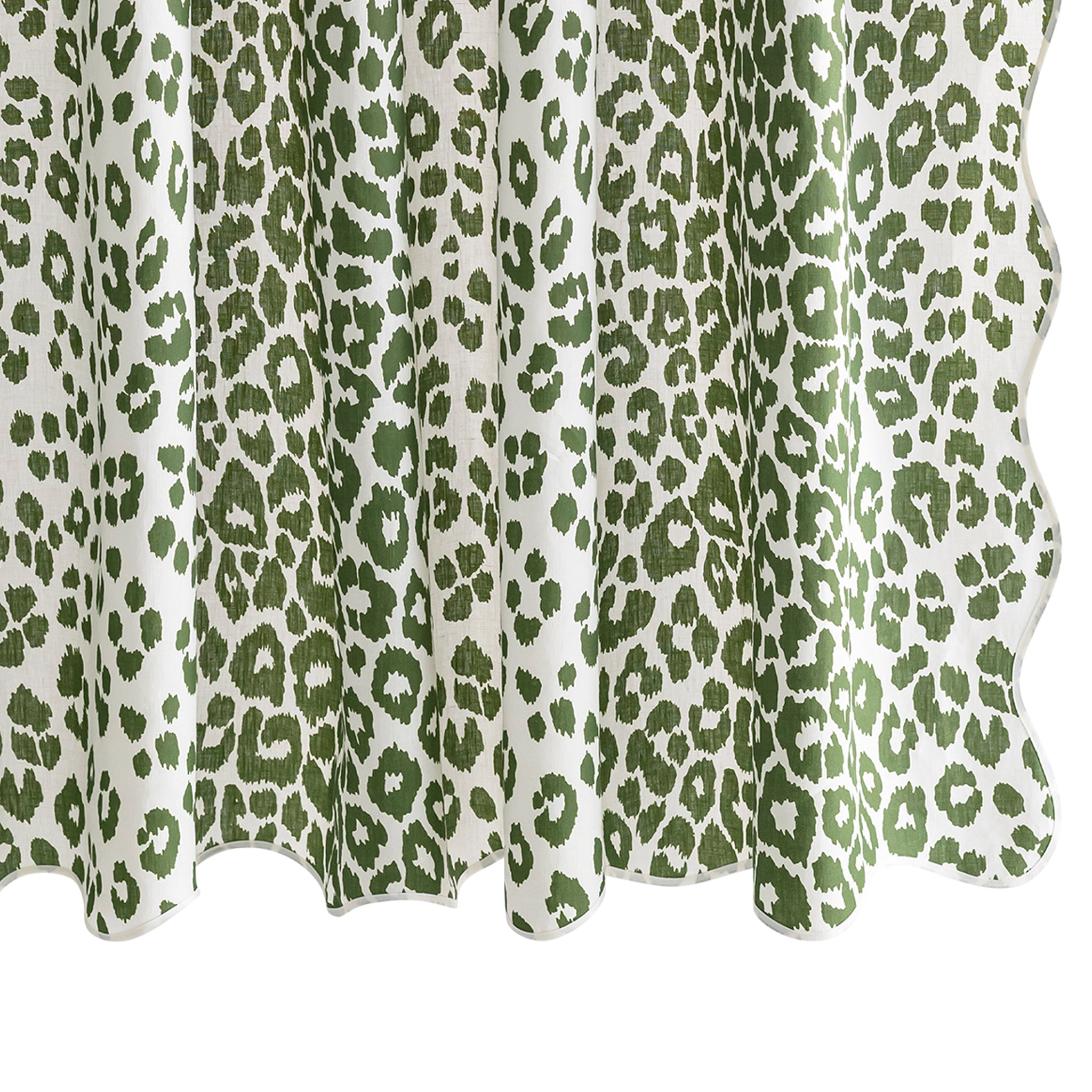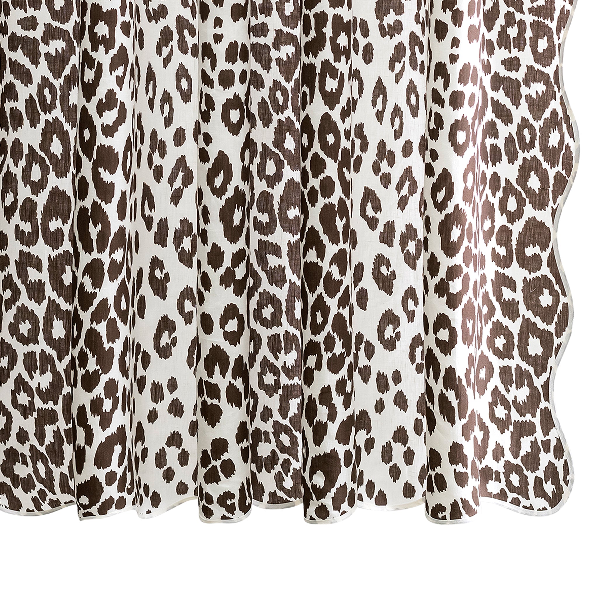 Sassy and chic. Schumacher's Iconic Leopard design is printed on Matouk's linen and finished with a scalloped and taped edge. Add a bit of flair to your bathroom with this sophisticated animal print shower curtain.