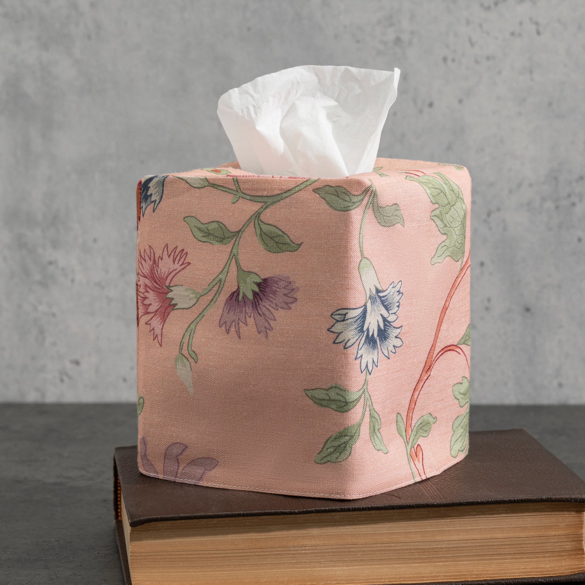 Linen tissue box cover with vibrant, 19th century Schumacher English floral pattern printed on Matouk's soft Roman linen for rich multi-dimensional visual texture and shadow