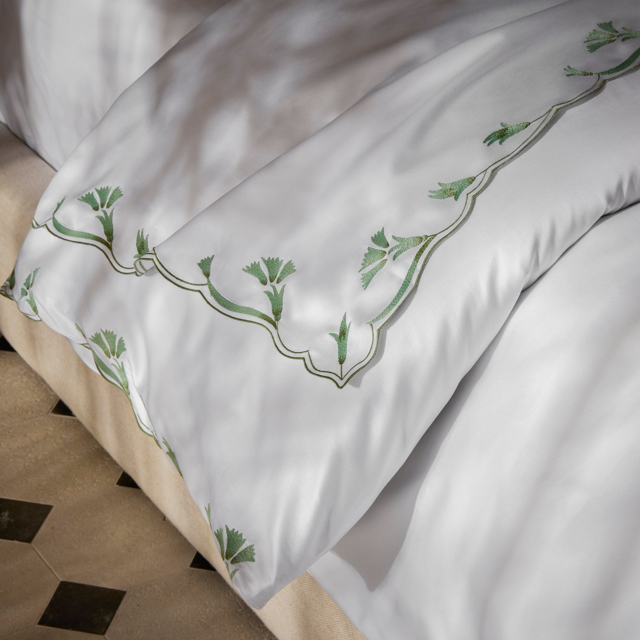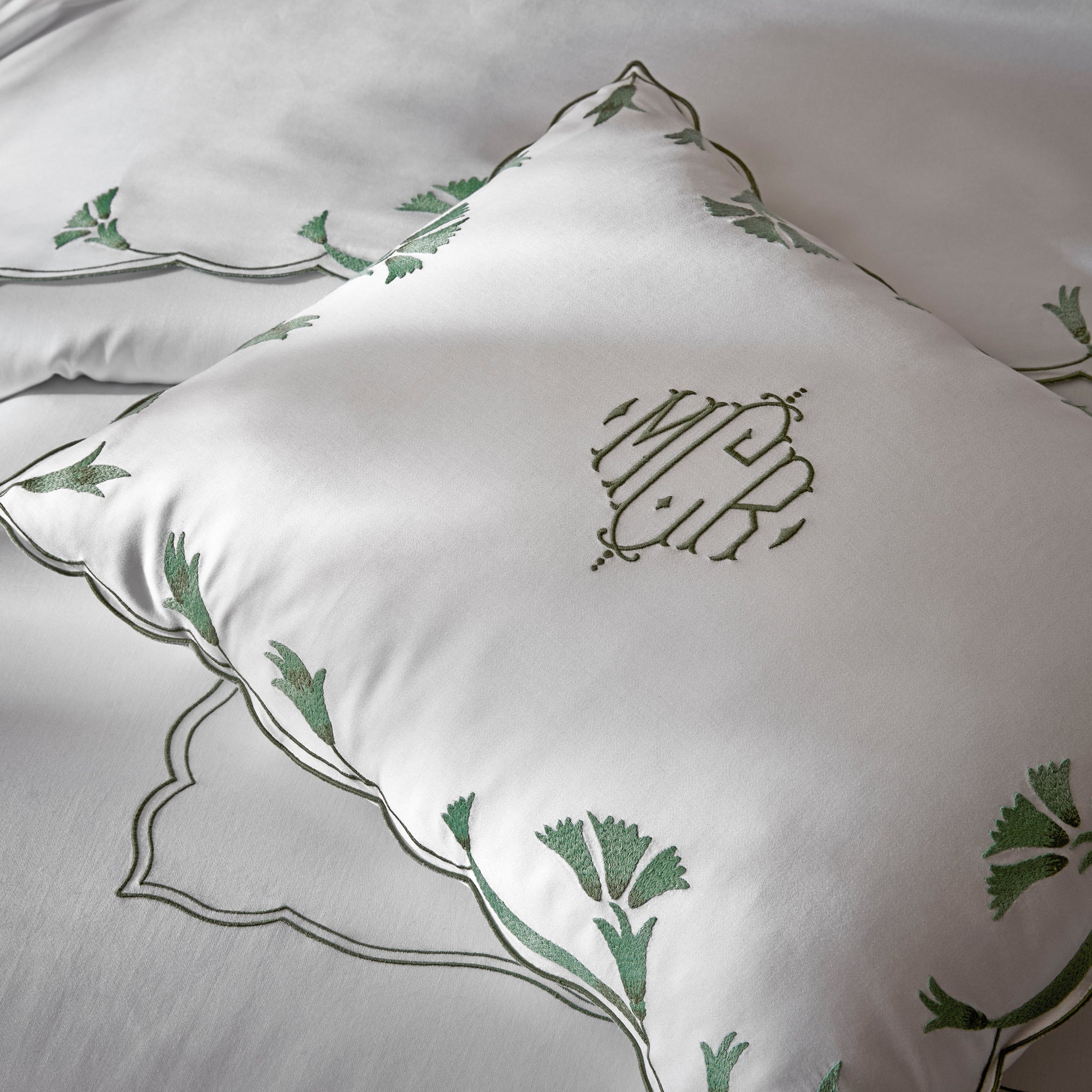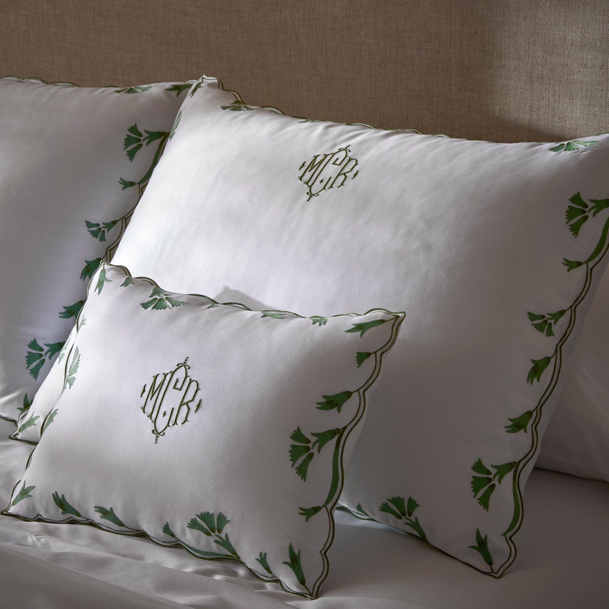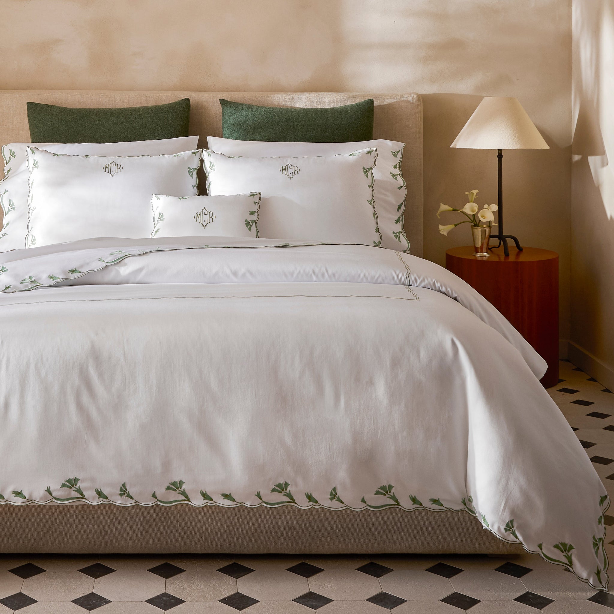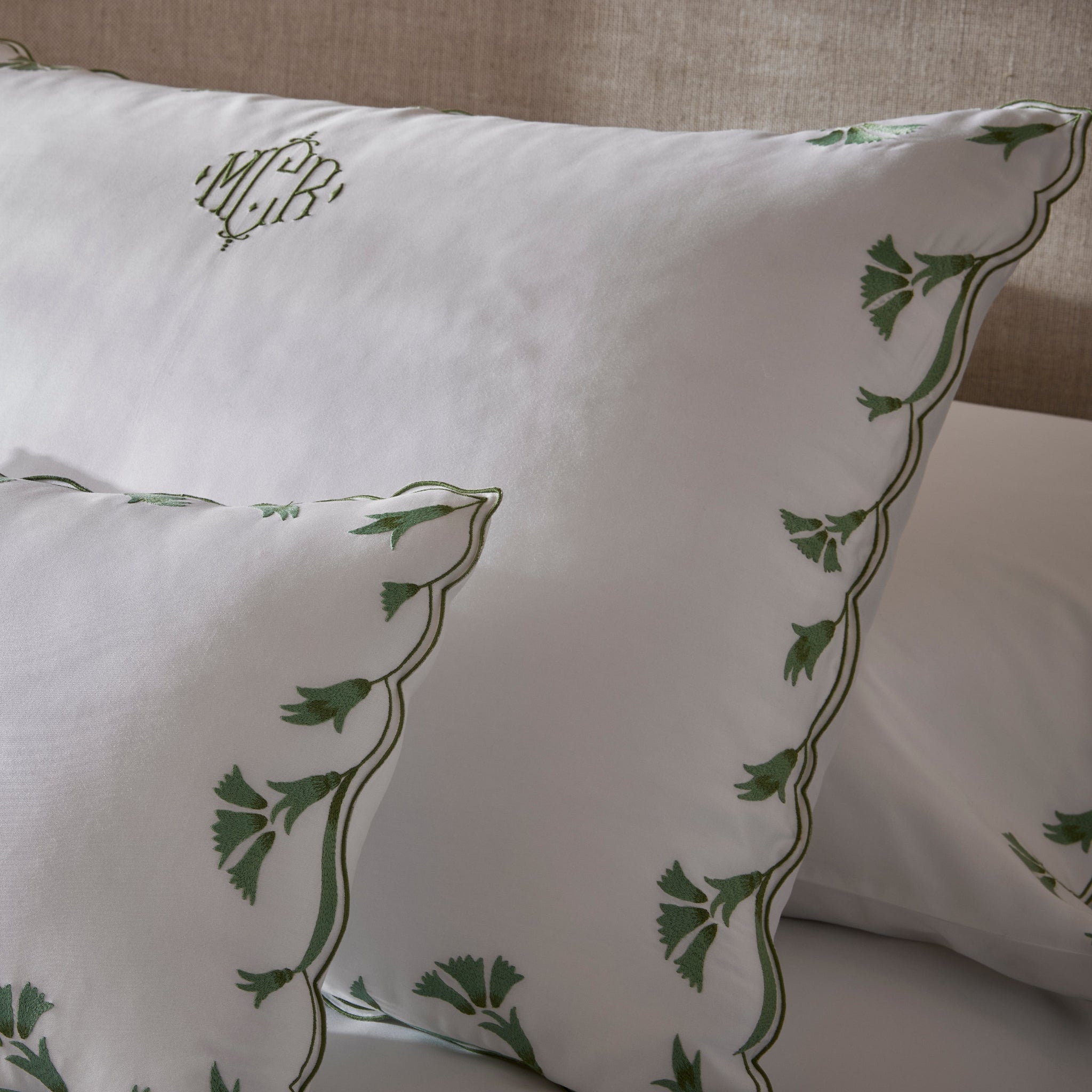 This delicate embroidered collection on luminous Nocturne sateen features elongated, scalloped florals whose tonal shifts lend depth and dimension to this classic look. Without any visible stitching, the trim drapes seamlessly—offering a sense of softness and sophistication to the bed.