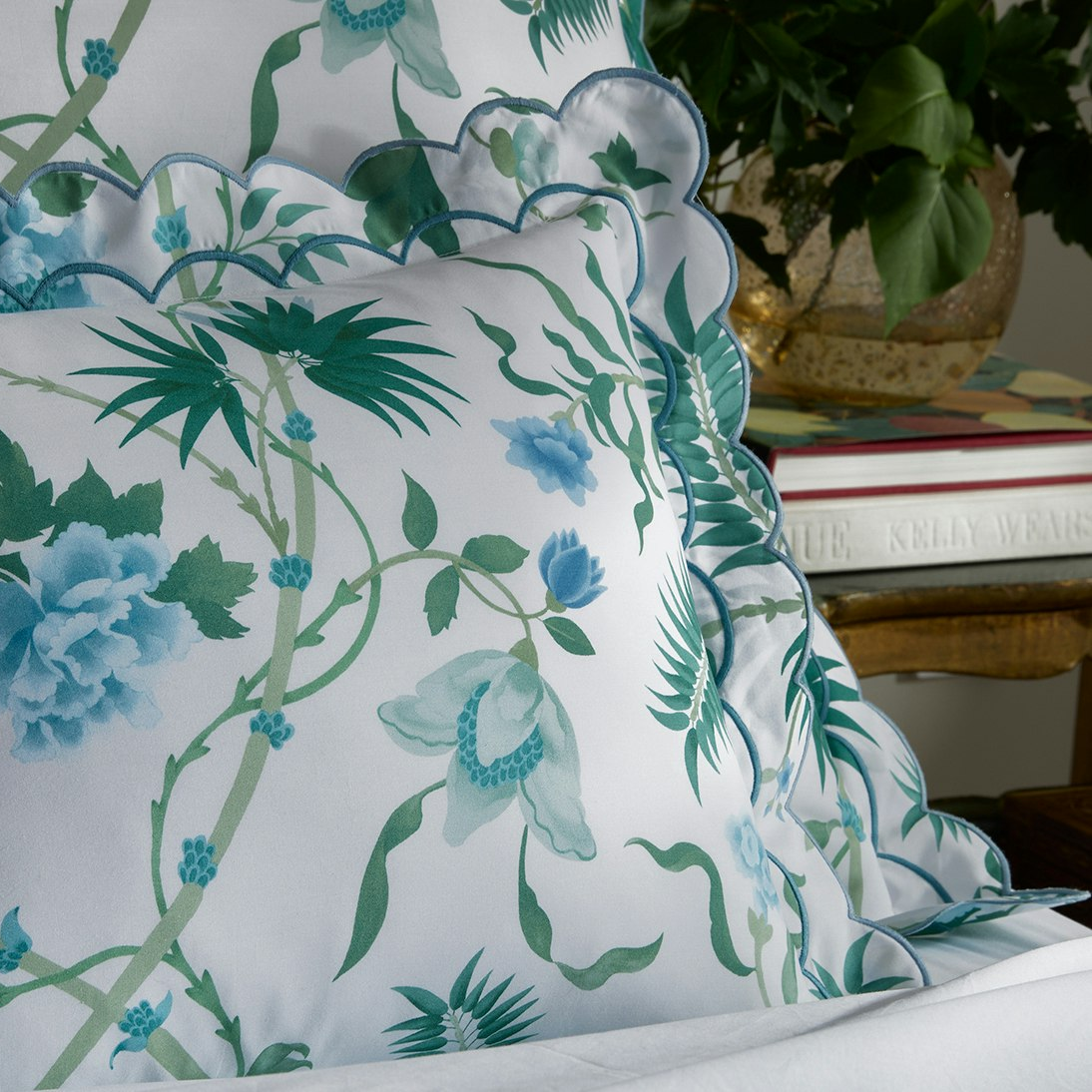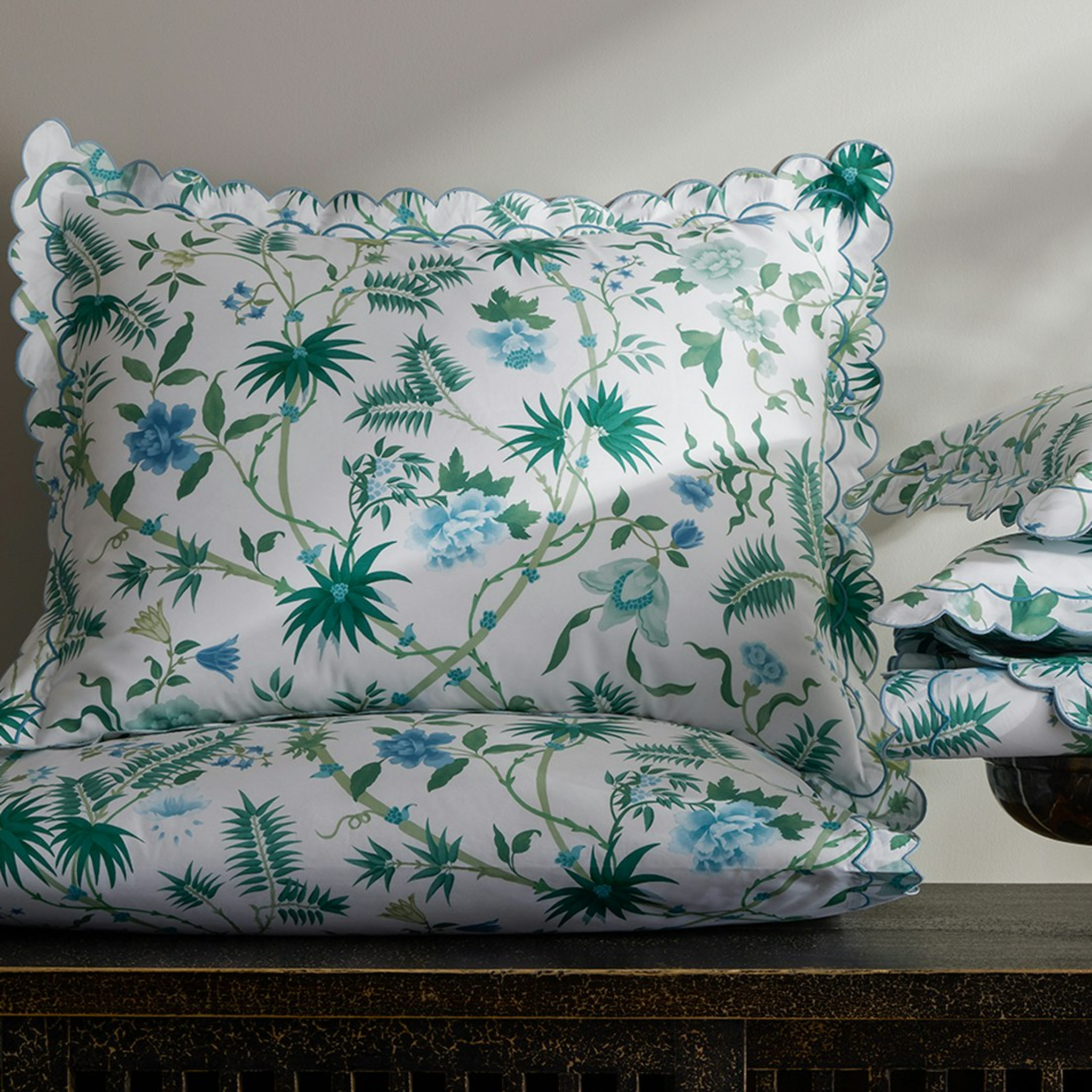Based on a vibrant Schumacher wallpaper, this tropical print is rendered in a lush emerald and blue-green palette with oversized palm fronds and blooms. Printed on Luca Egyptian cotton percale and finished with a double scallop embroidery, Palmyra offers an island-inspired escape that feels both tranquil and transportive.