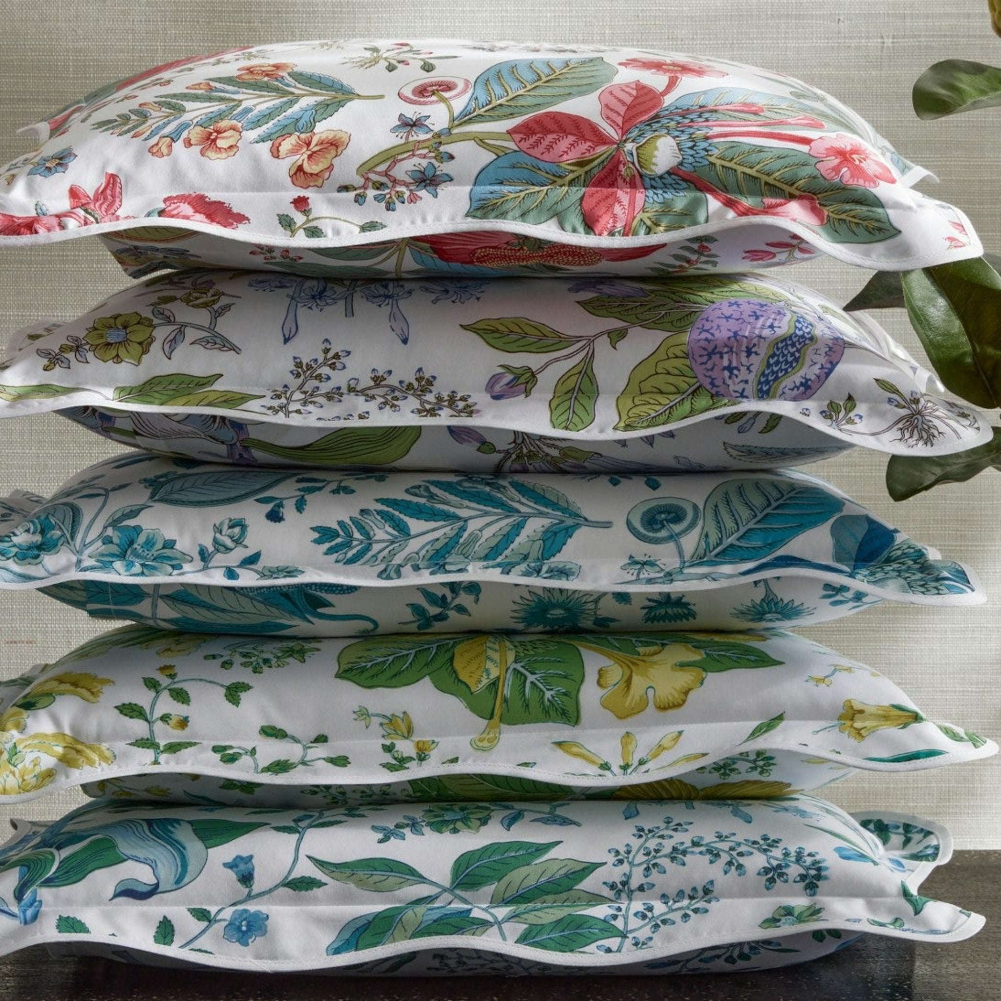 18th century botanical pattern from Schumacher's archive printed on Matouk's Luca percale sheeting, quilted with a 4" diamond pattern, and finished with a scallop edge