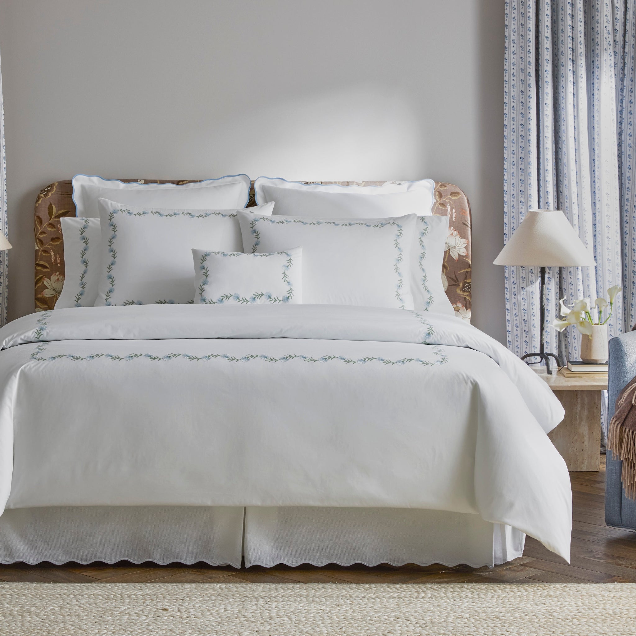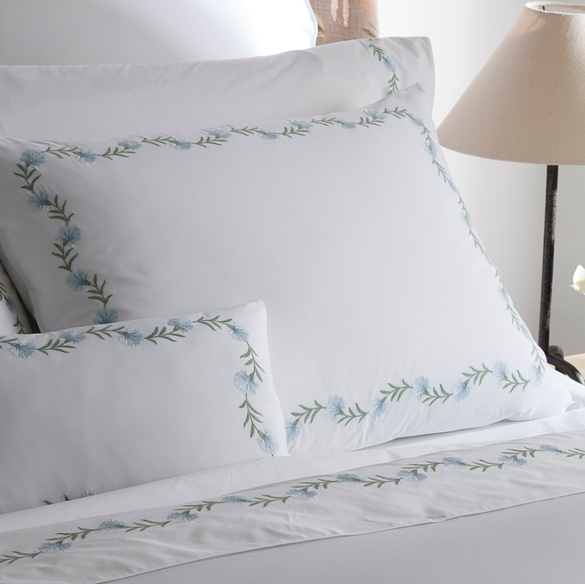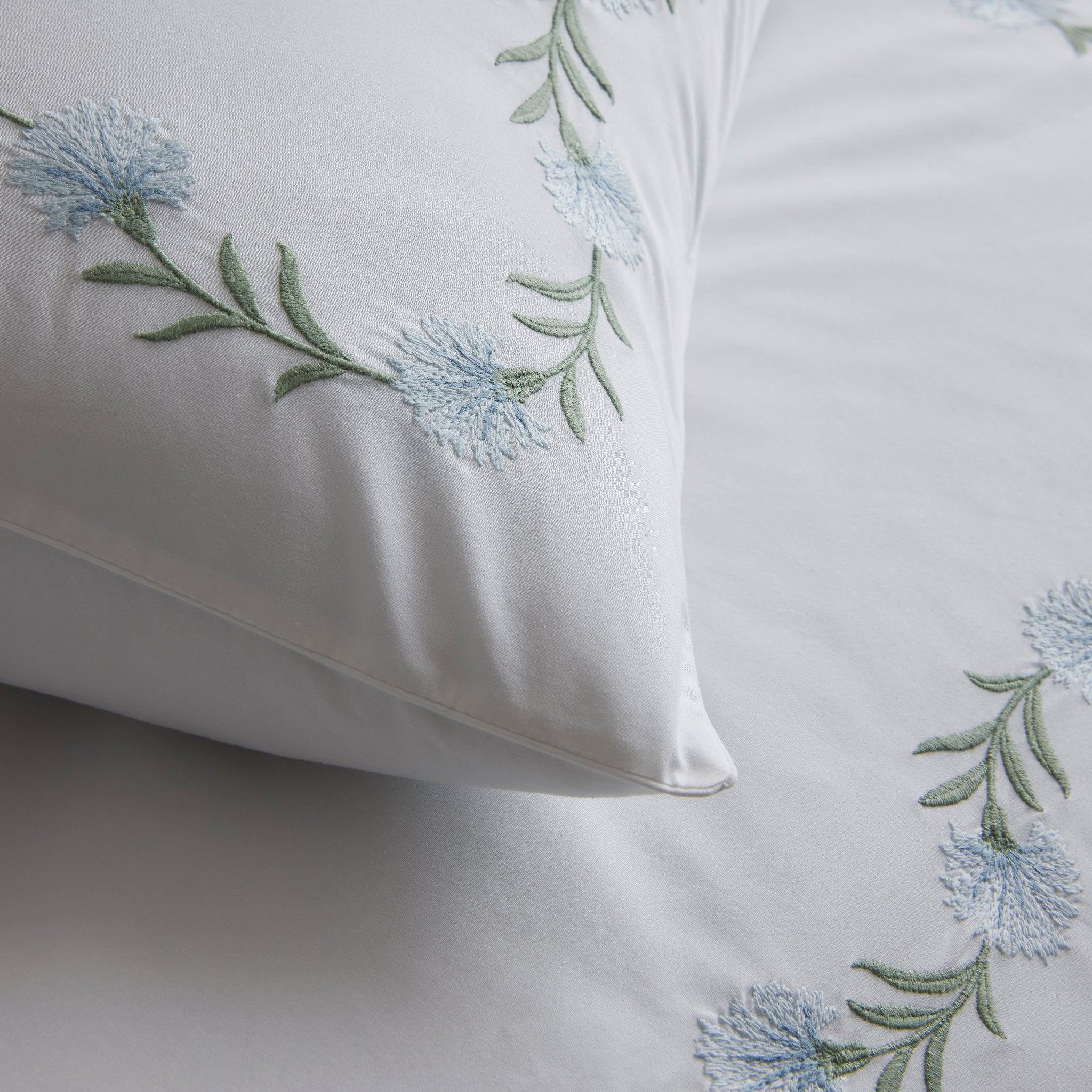 Daphne’s floral vine, embroidered on white Ceylon percale, can be quietly classic or vibrant and bold 520 thread count cotton percale woven in India