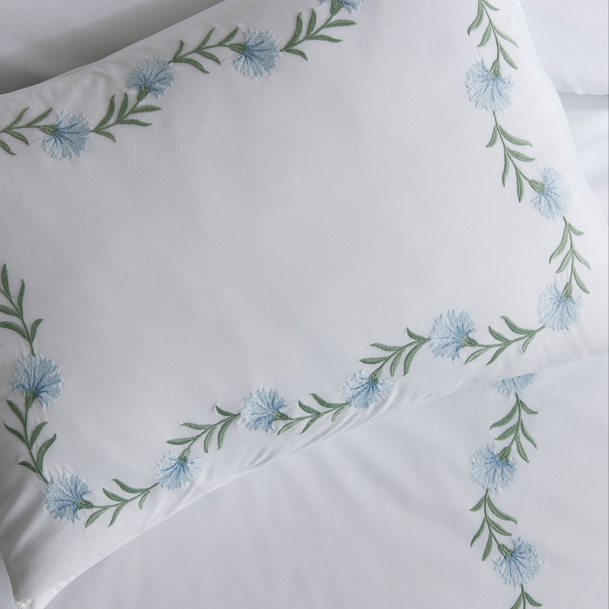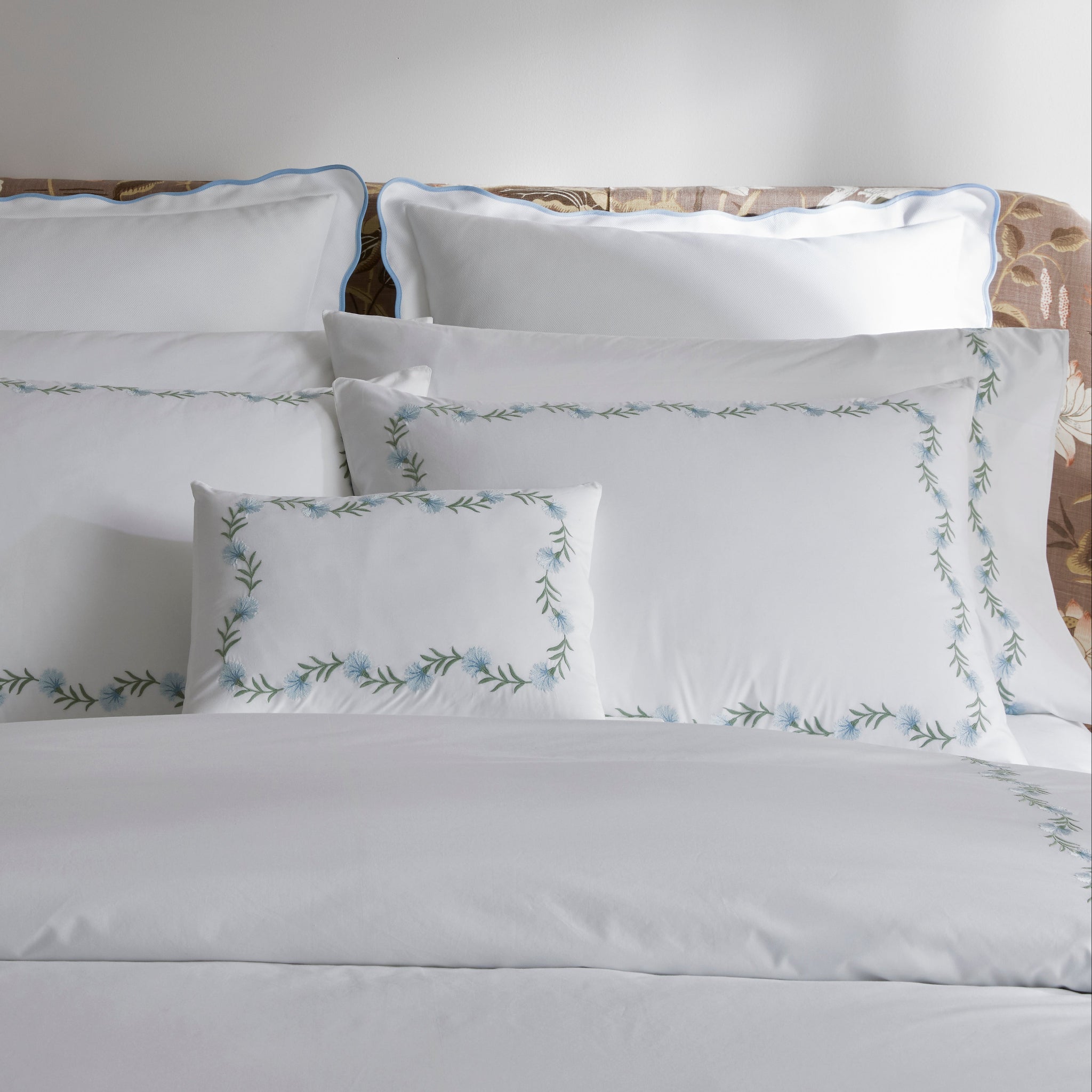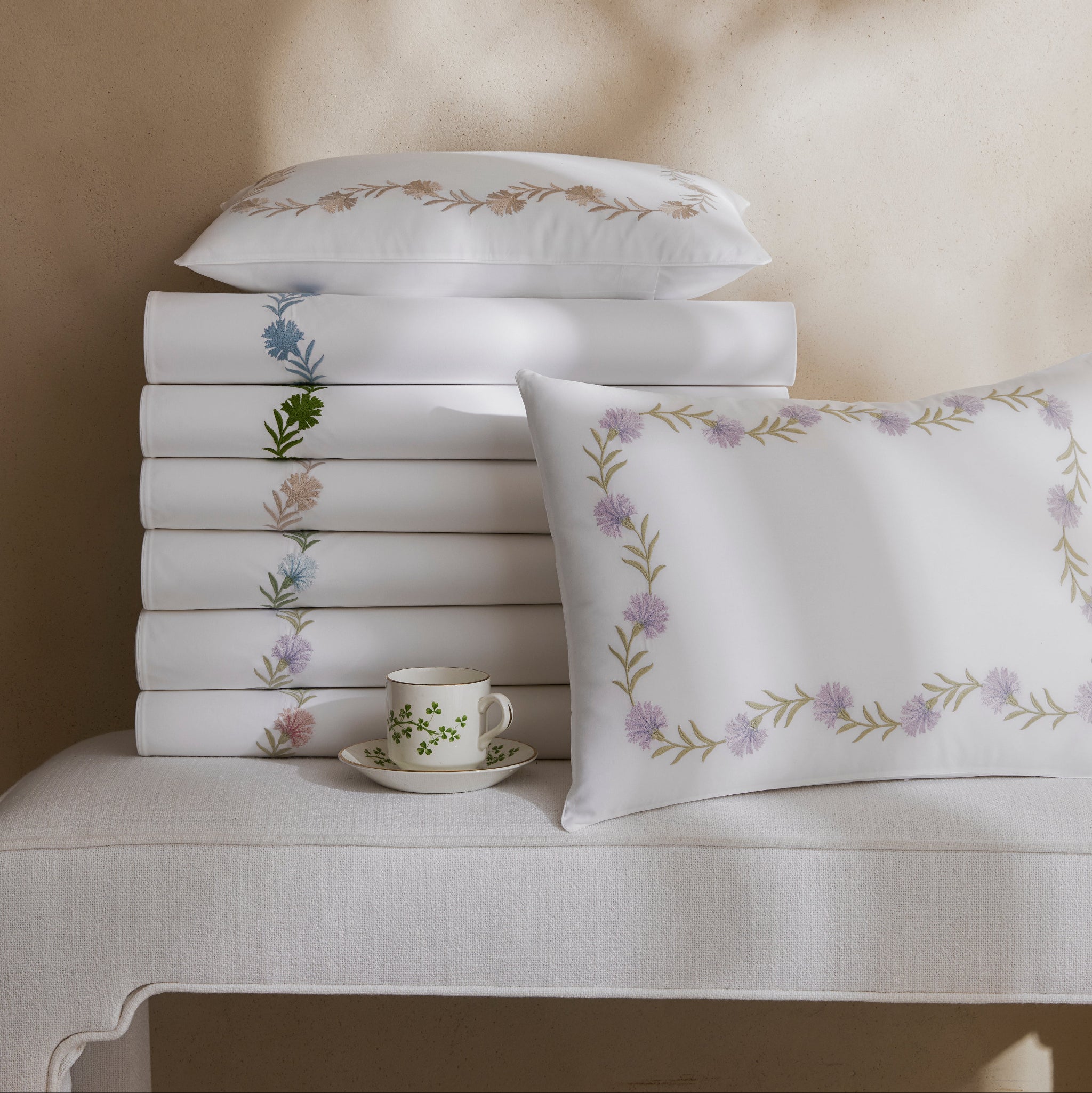 Daphne’s floral vine, embroidered on white Ceylon percale, can be quietly classic or vibrant and bold 520 thread count cotton percale woven in India