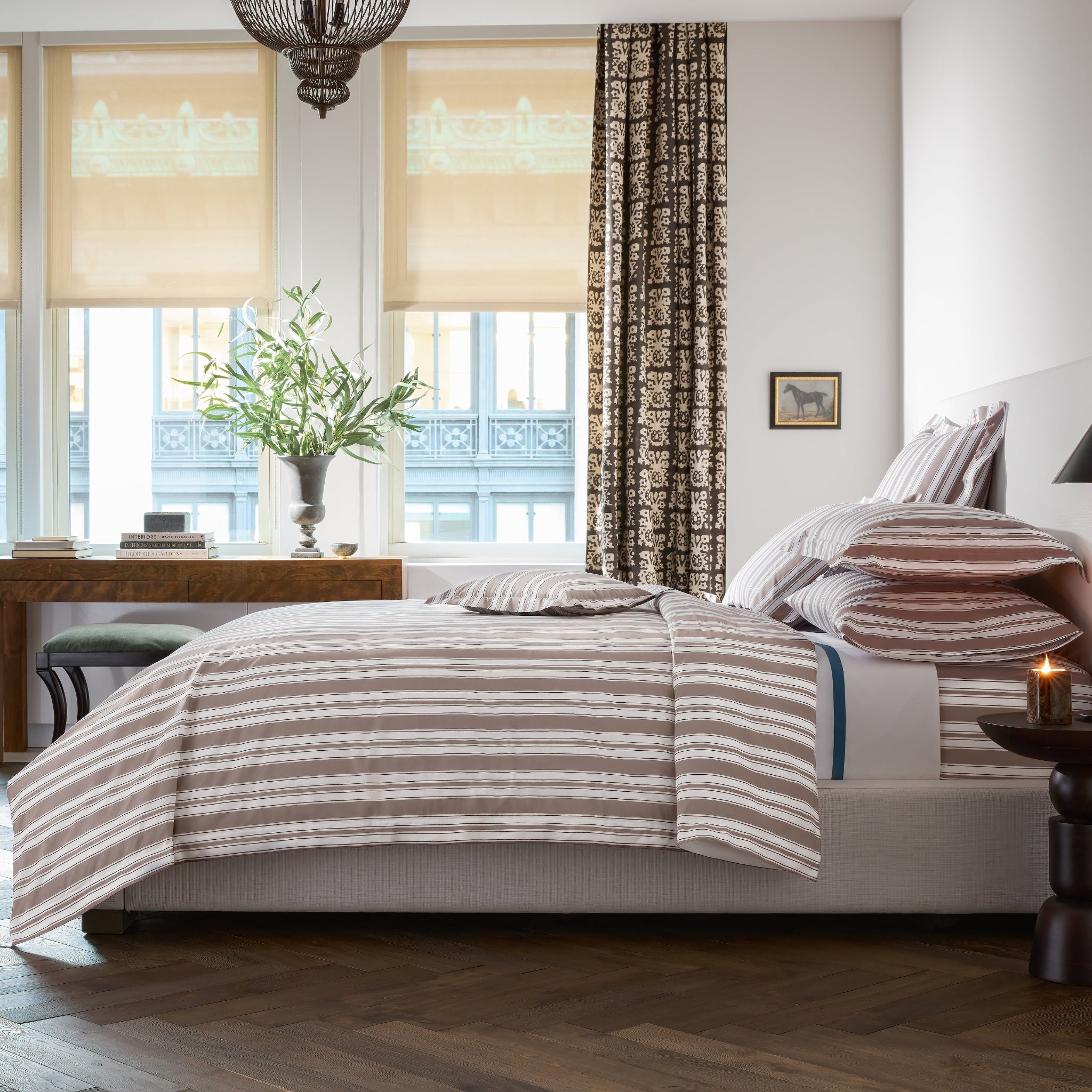 Elio is a Matouk Schumacher print featuring a series of painterly, hand-drawn stripes in a large, expressive scale. Its soft, irregular lines evoke a sense of movement and ease, infusing the pattern with fresh energy.