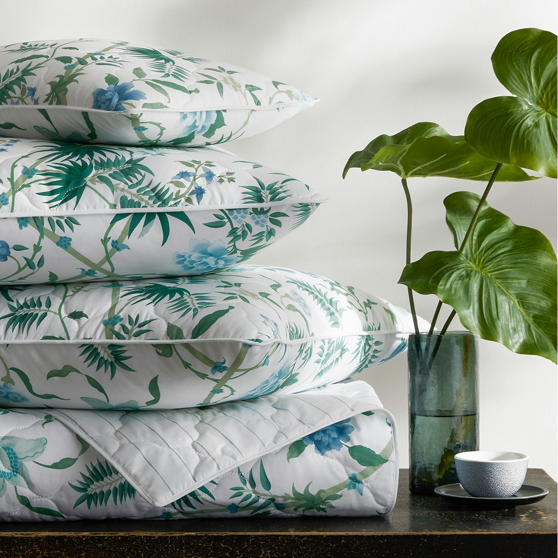 Based on a vibrant Schumacher wallpaper, this tropical print is rendered in a lush emerald and blue-green palette with oversized palm fronds and blooms. Printed on Luca Egyptian cotton percale, quilted with a quatrefoil pattern and finished with a piped edge, Palmyra offers an island-inspired escape that feels both tranquil and transportive.